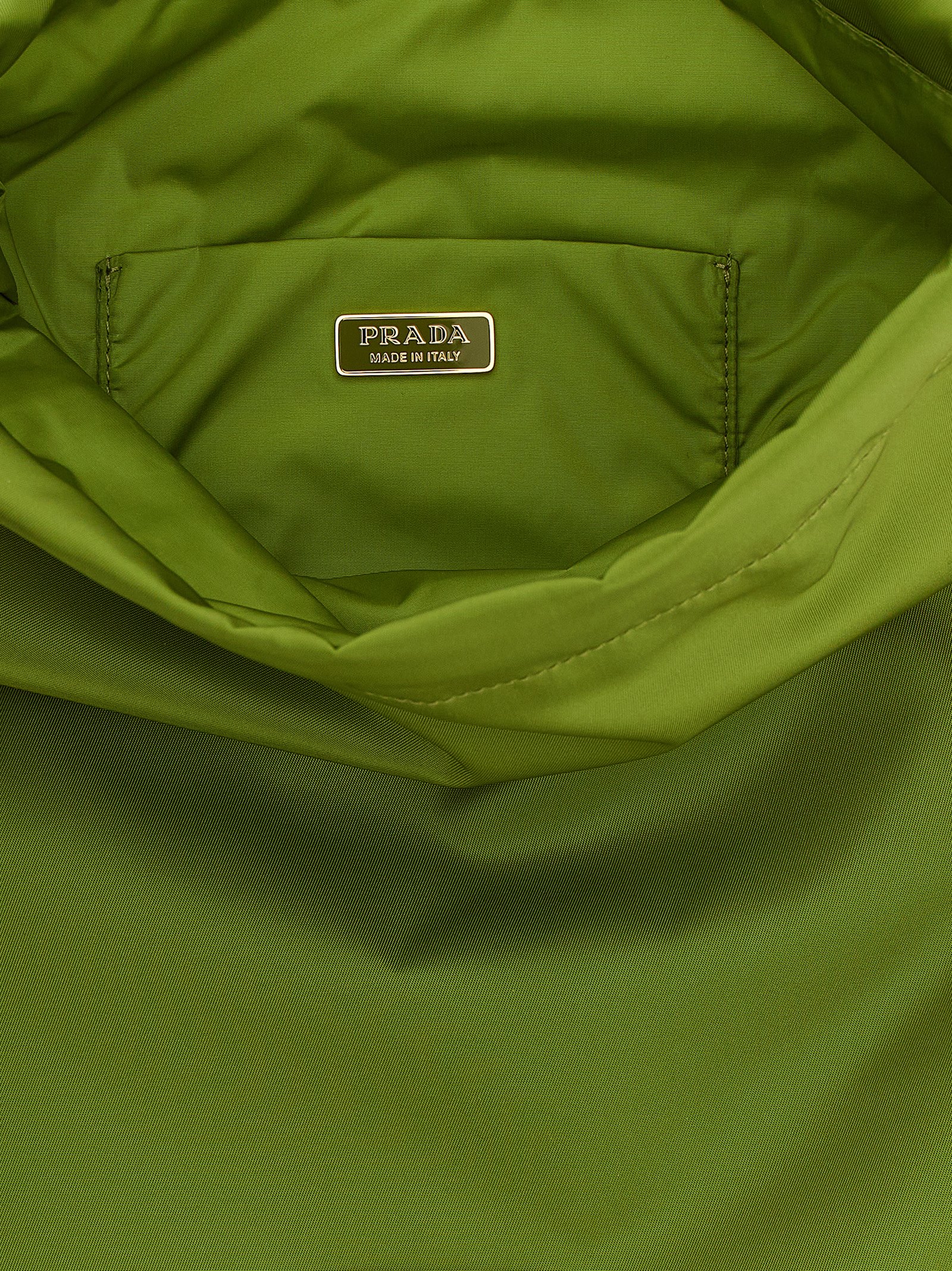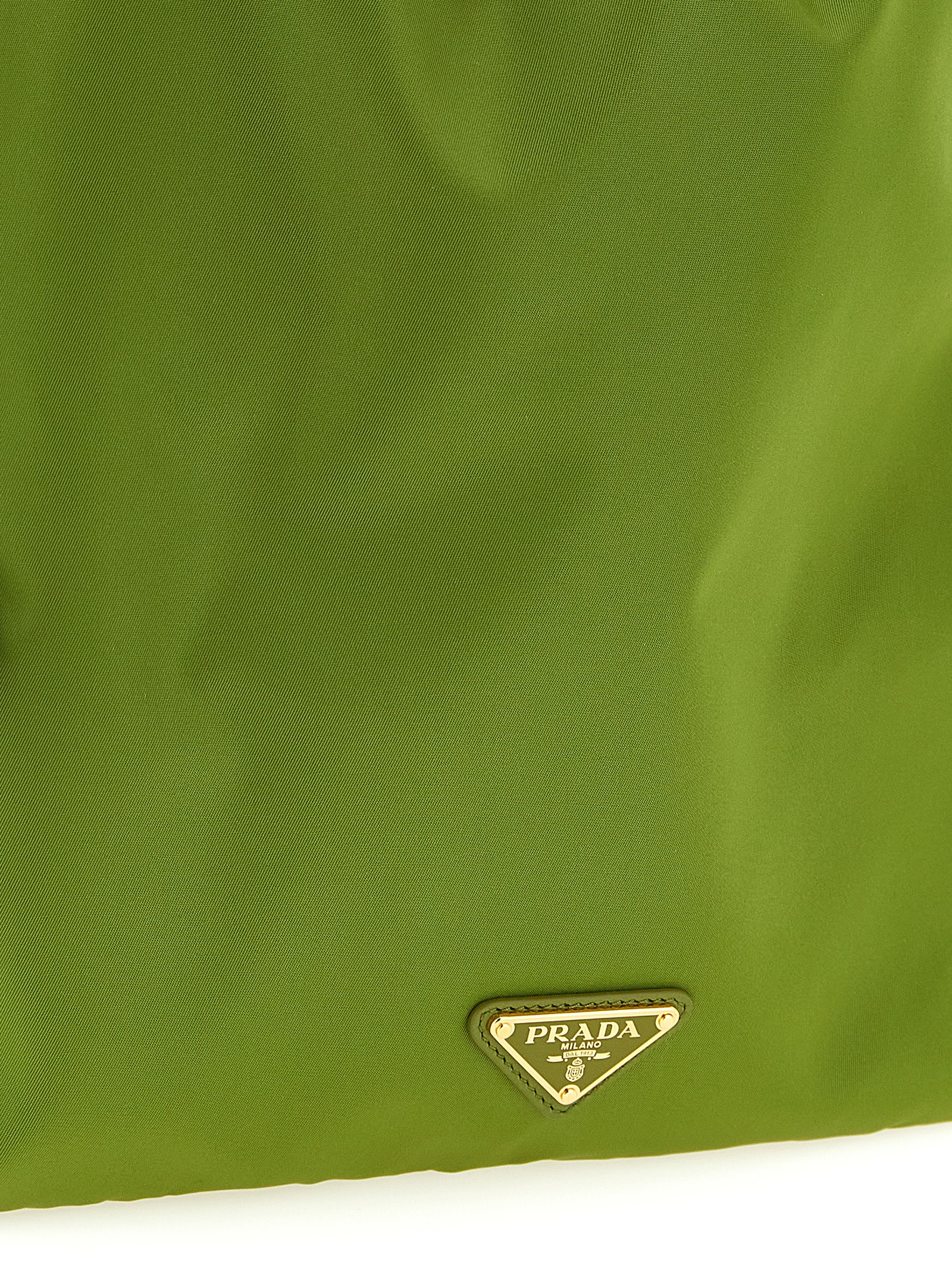 ‘Prada Wish’ Re-Nylon pouch with front enameled metal triangle logo, tone-on-tone leather drawstring closure.