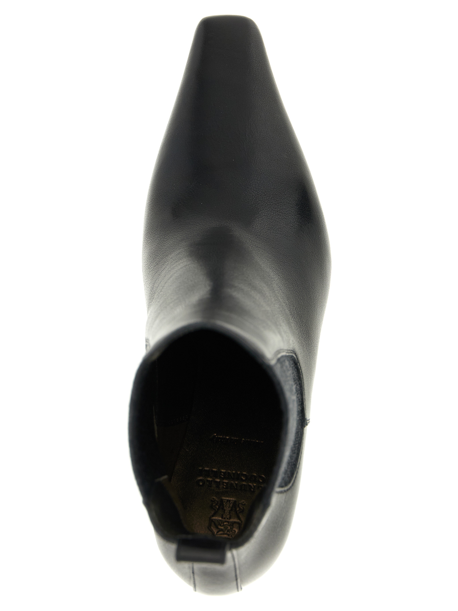 Classic leather ankle boots with slightly squared toe, elastic ankle straps, Precious Block Heels’ heel covered in Monile and leather sole.