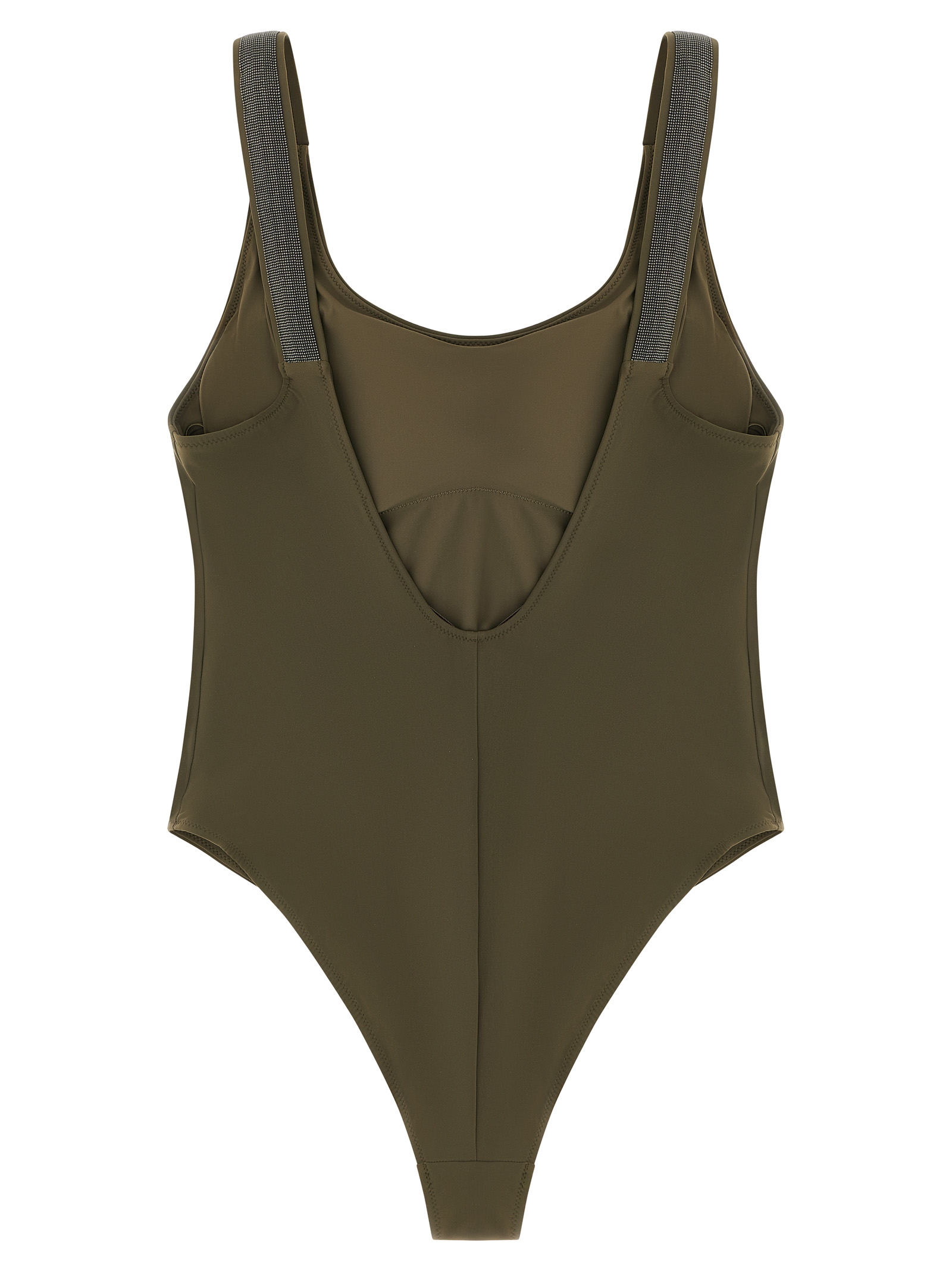 One-piece swimsuit in techno jersey, wide shoulder straps with Monile ‘Precious Details’, round neckline on the front, wide round neckline at the back, removable padded cups, and slightly leggy hem.