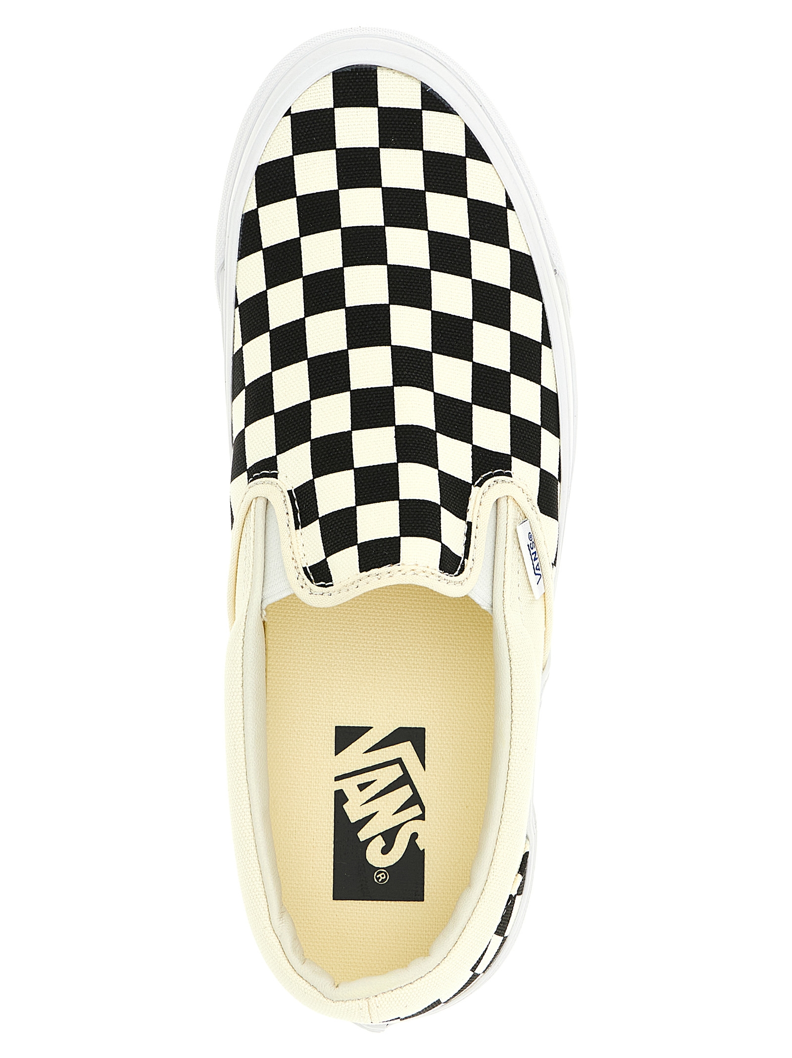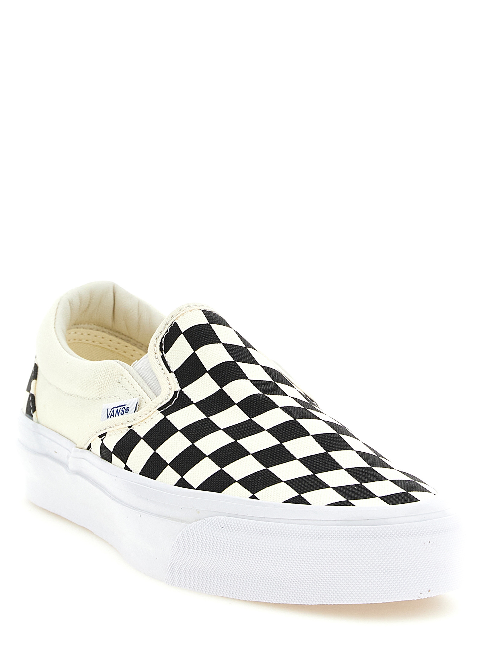 Checkerboard-print 226g screen-printed canvas ‘Premium Slip-On 98’ sneakers with slip-on style, full-grain leather lining, higher sole hips with glossy finish, original 90s Osnaburg reinforcement ribbon, Foam All-Day-Comfort (ADC) midsole, rubber sole.