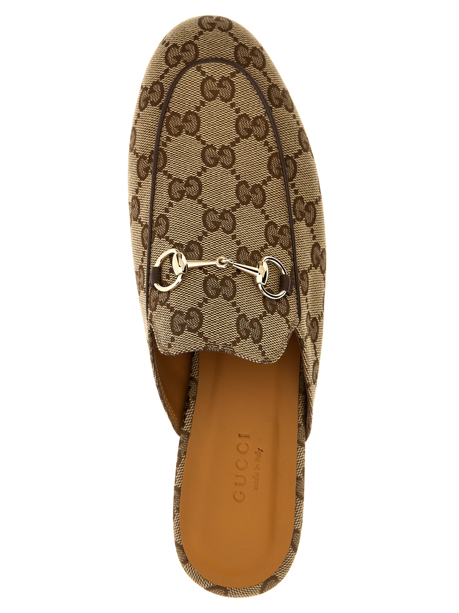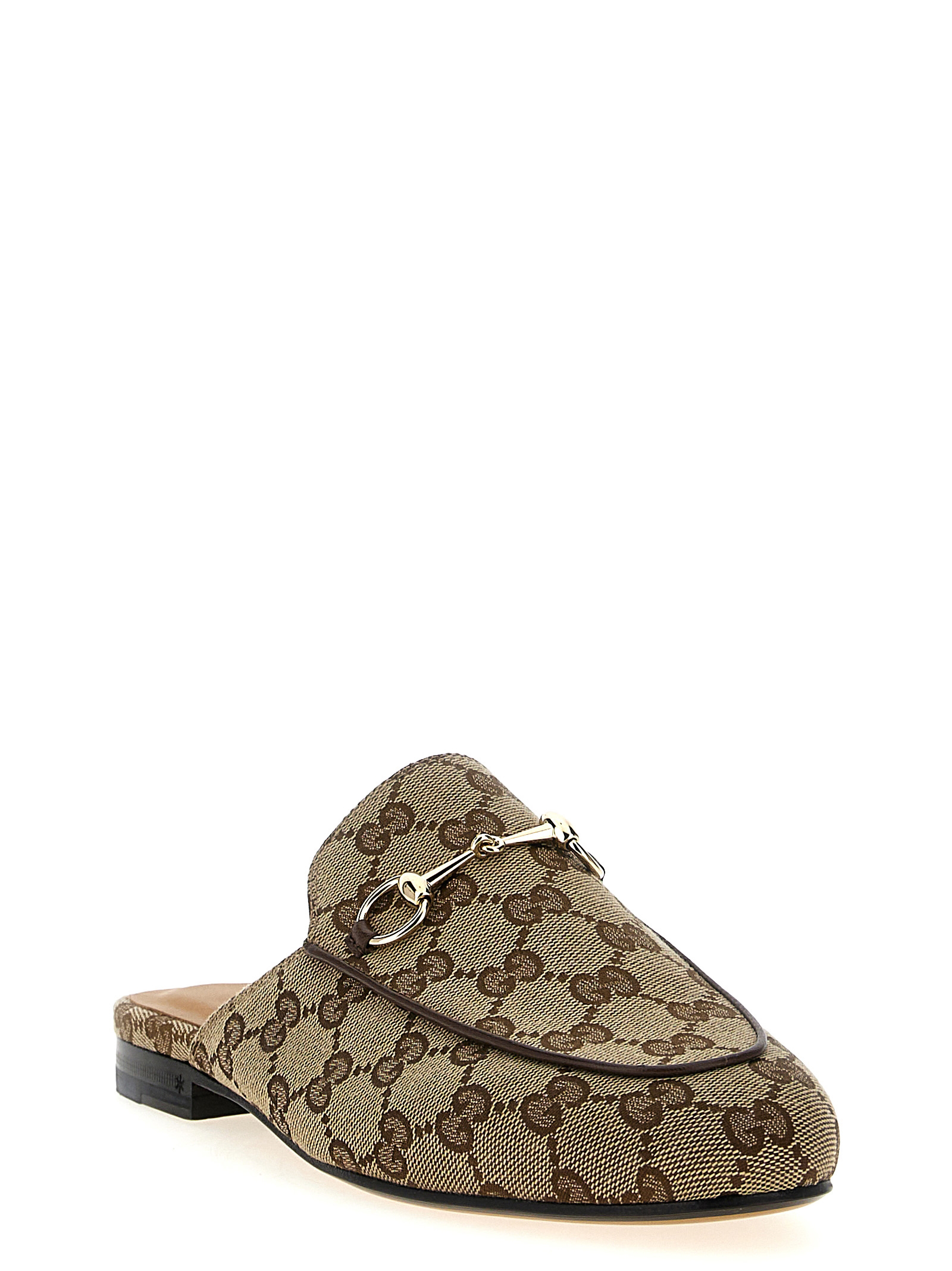 ‘Princetown’ slipper in Original GG fabric with leather details, front metal clamp, leather sole.