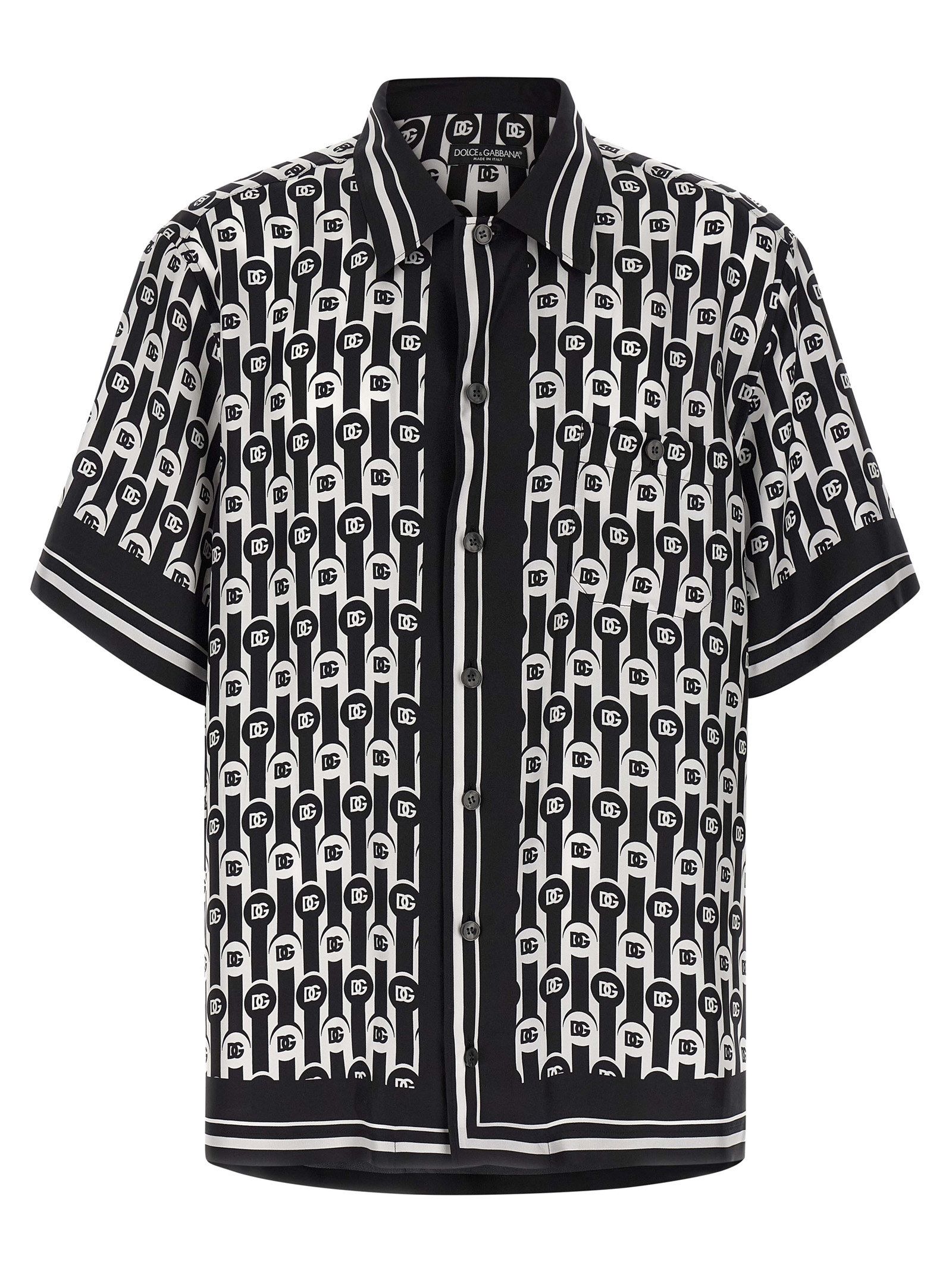 ‘Private Wardrobe’ silk shirt with all-over logo print, bowling style with V-neck and collar, button closure, front pocket, asymmetric length, side splits, short sleeves.