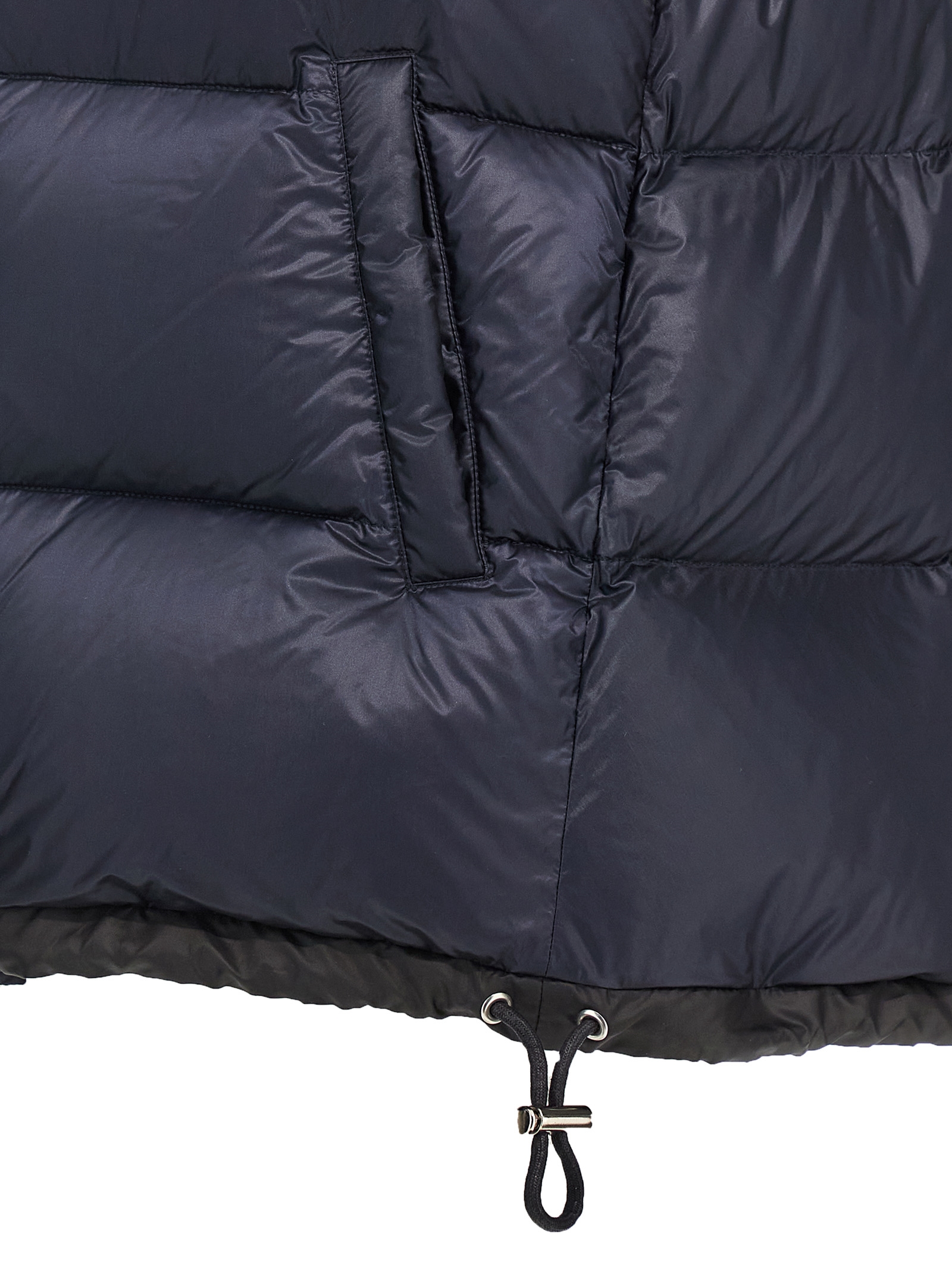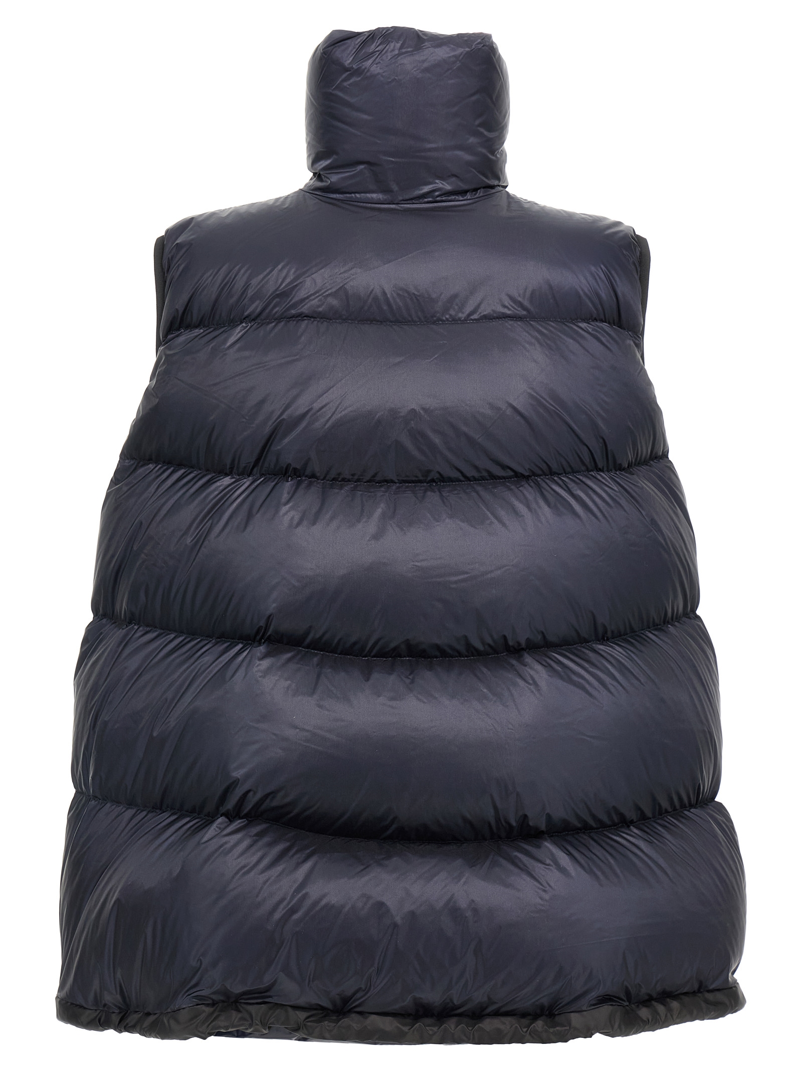 ‘Puffer’ quilted nylon vest with goose down padding, A-line silhouette, standing collar, front zip closure, pockets, drawstring at the hem.