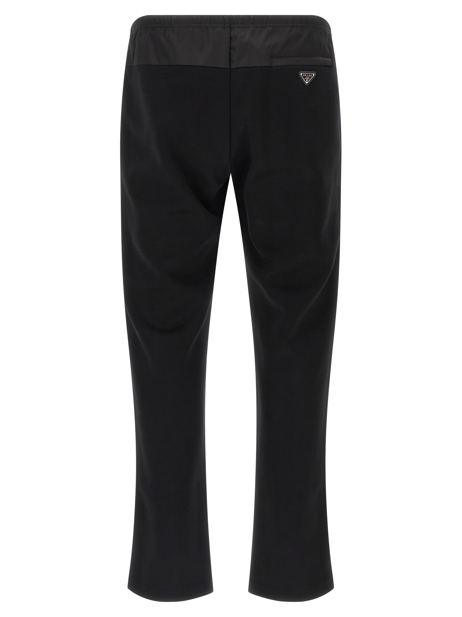 Cotton joggers with tone-on-tone Re-Nylon side bands, drawstring elastic waistband, trompe l’oeil flap, pockets, straight leg with central stitching, and back enameled metal triangle logo.