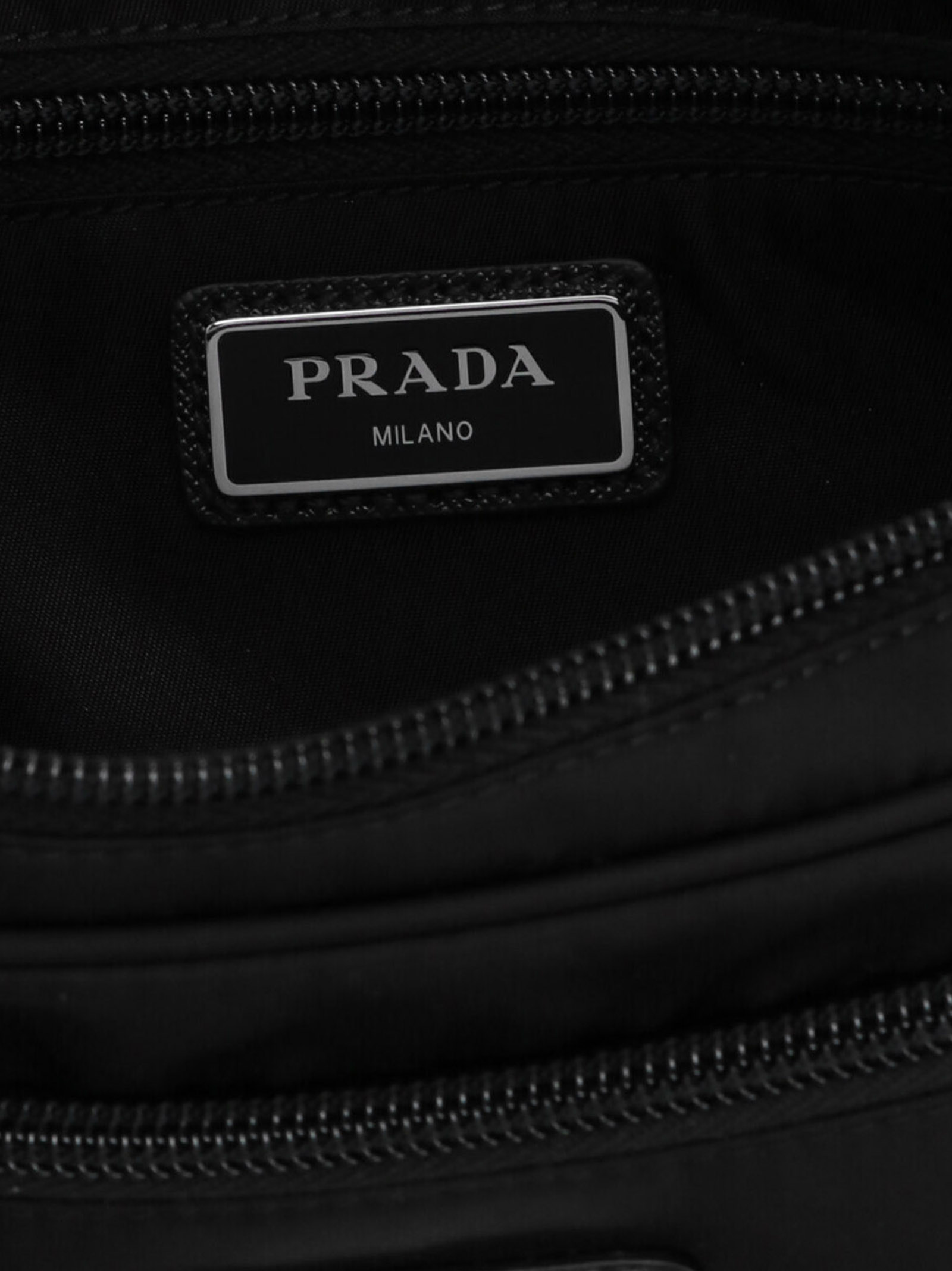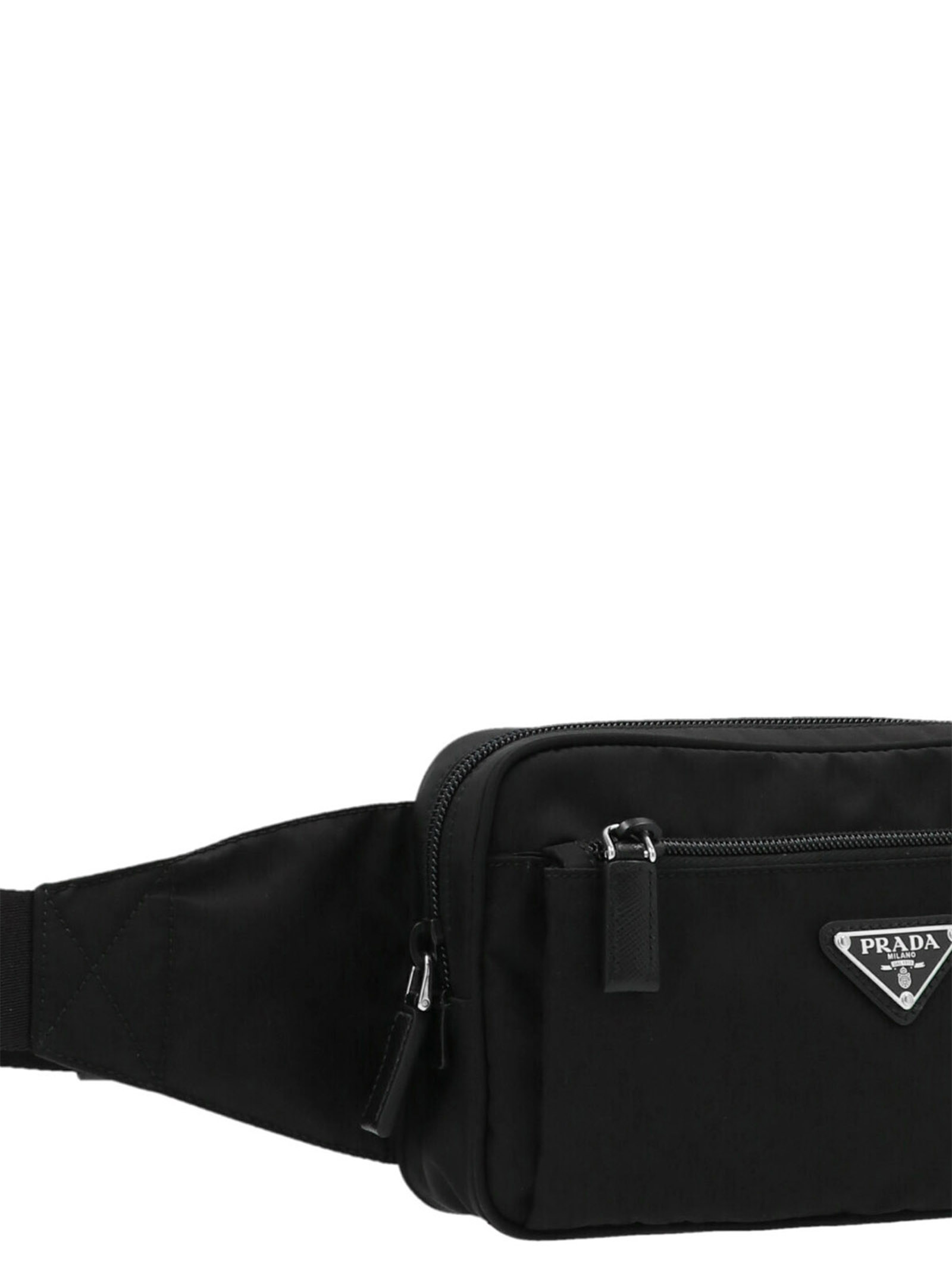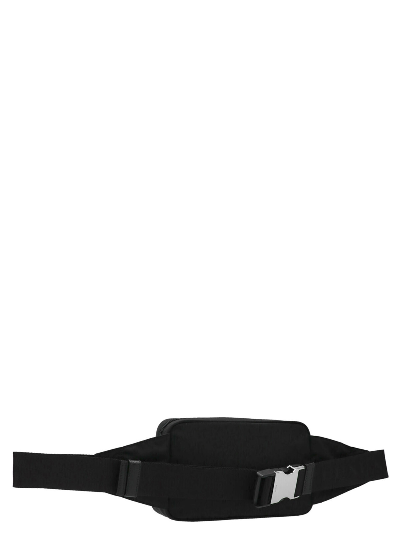Re-nylon belt bag with a logo, a zip closure, and adjustable belt, and a pocket featuring a zip on the outside.