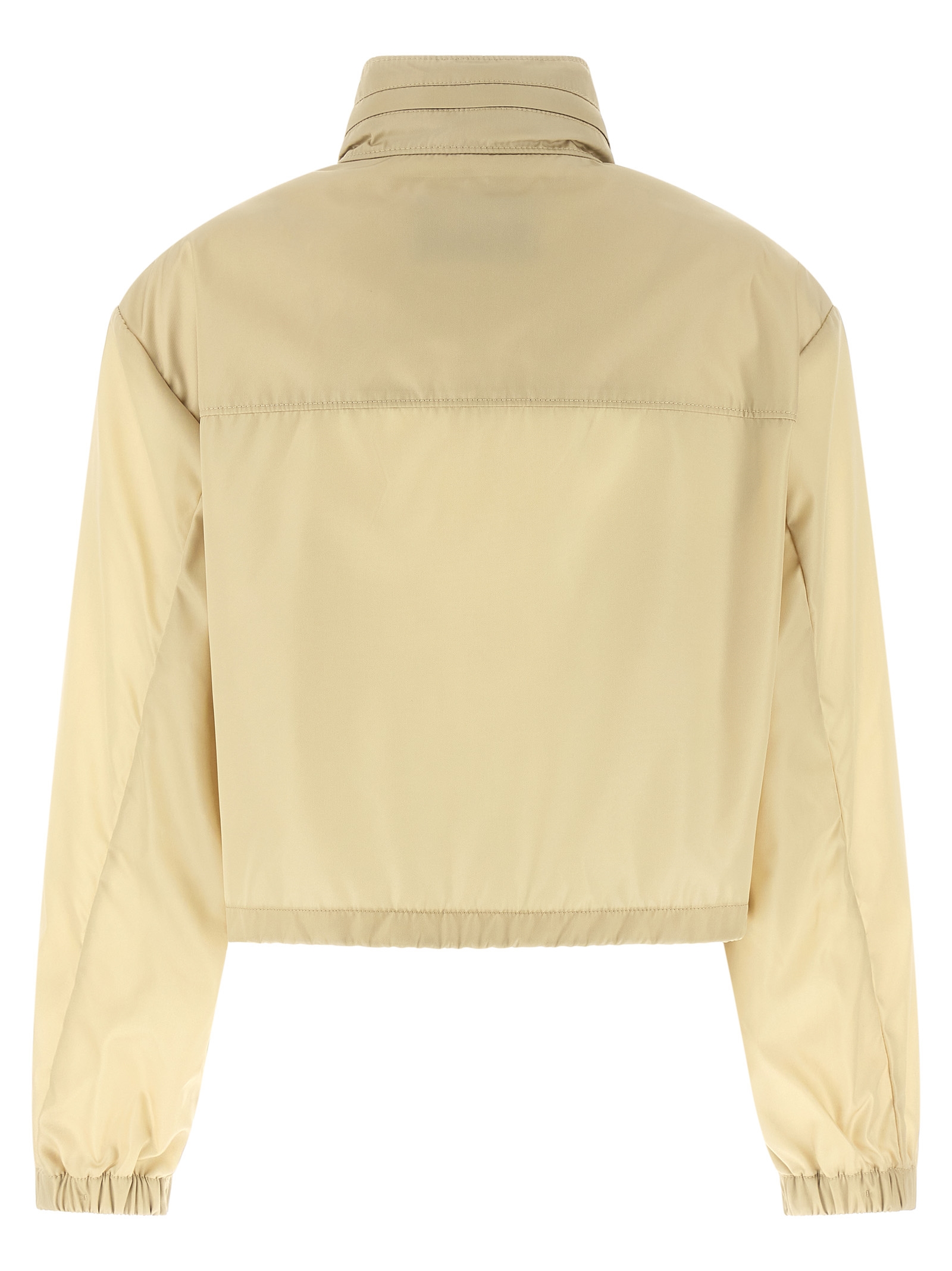 Re-Nylon jacket, crop model, triangle logo in enamelled metal and front zip closure, standing collar with snap button closure and removable hood, pockets, long sleeves with elastic cuffs, drawstring on the hem, unlined.