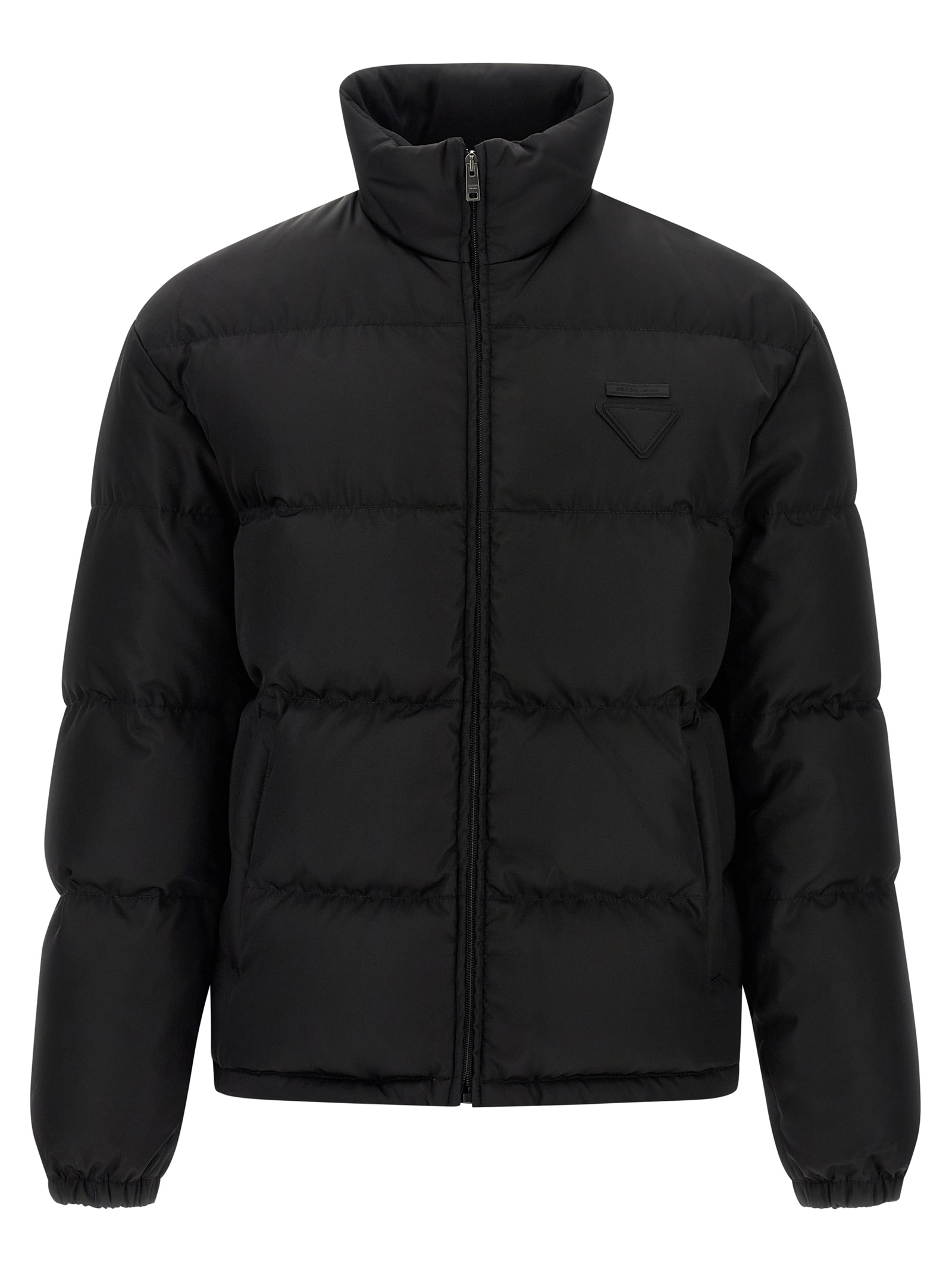 Quilted Re-Nylon down jacket with goose feather padding, triangle logo in tone-on-tone fabric and front zip closure, high neck, pockets, long sleeves with elastic cuffs, drawstring on the hem.