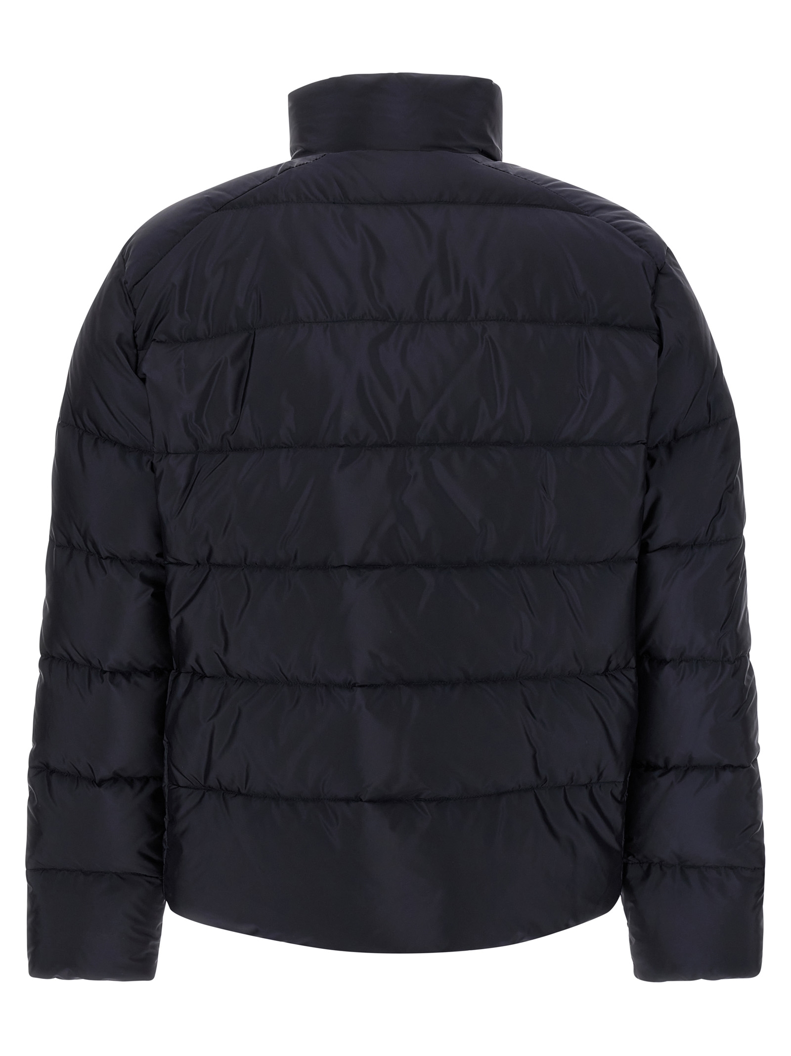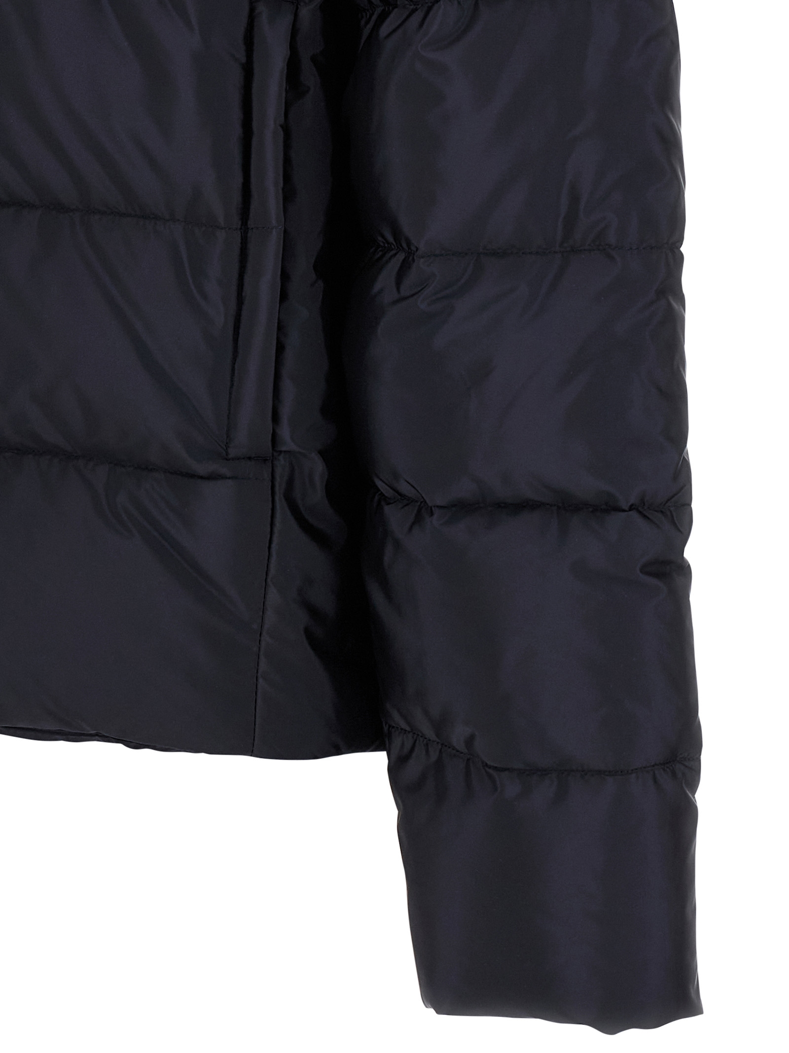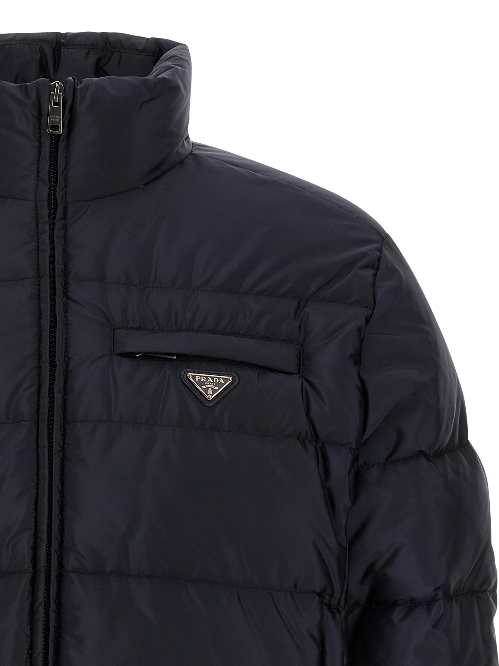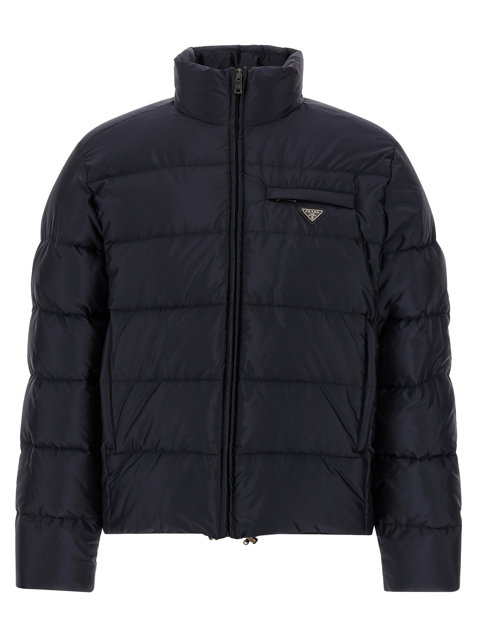 Quilted Re-Nylon down jacket with goose feather padding, triangle logo in enamelled metal and front zip closure, standing collar, pockets, long sleeves, drawstring on the hem.