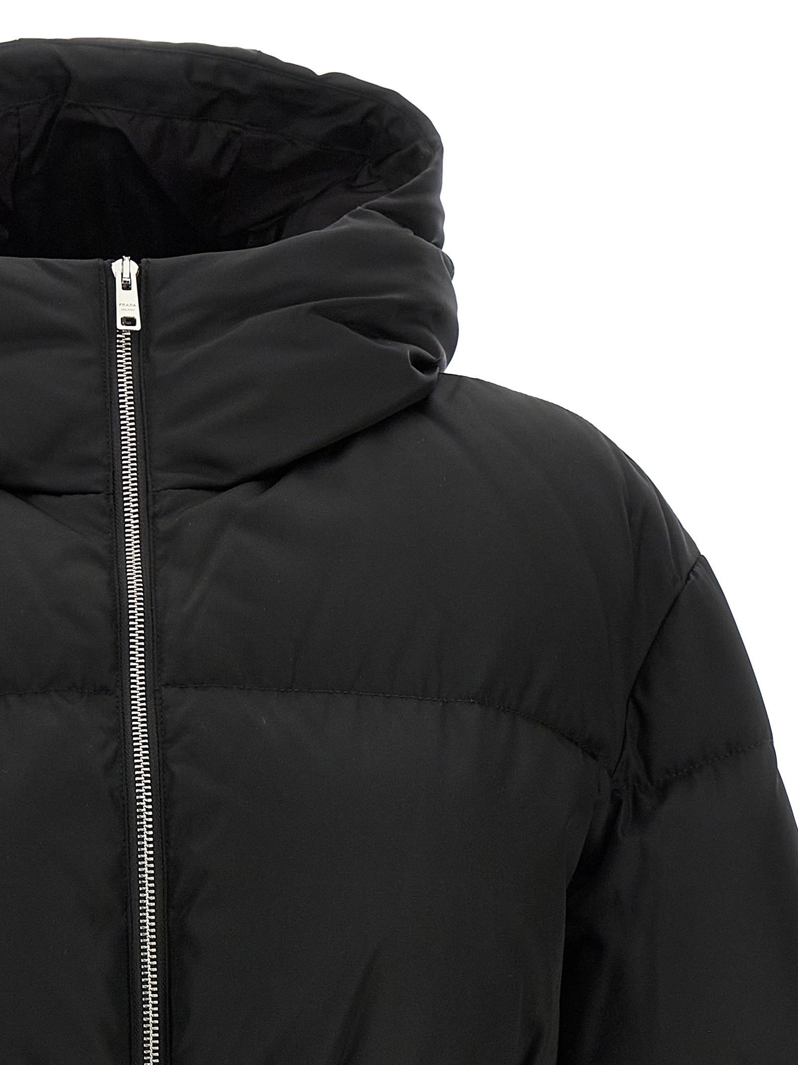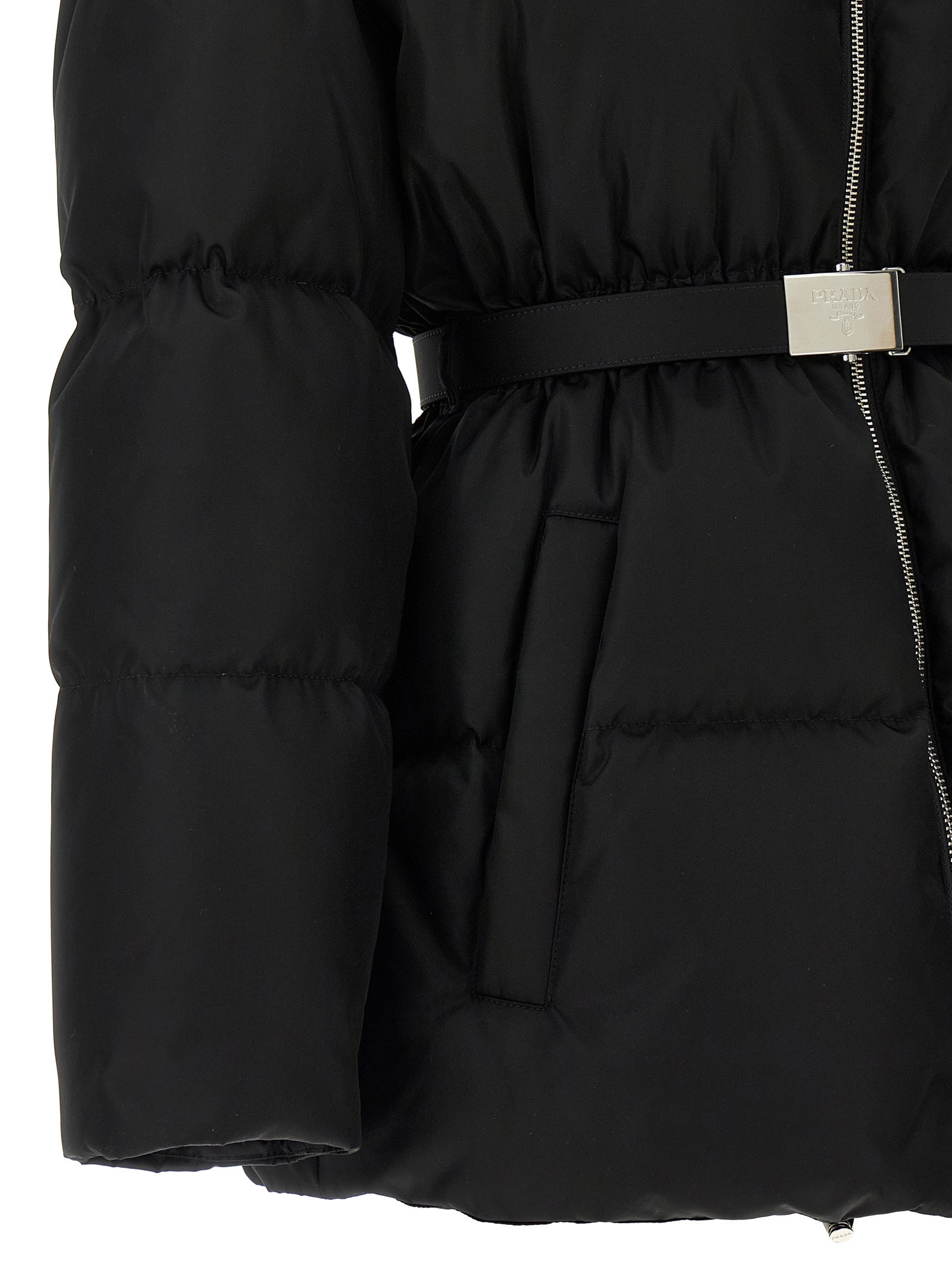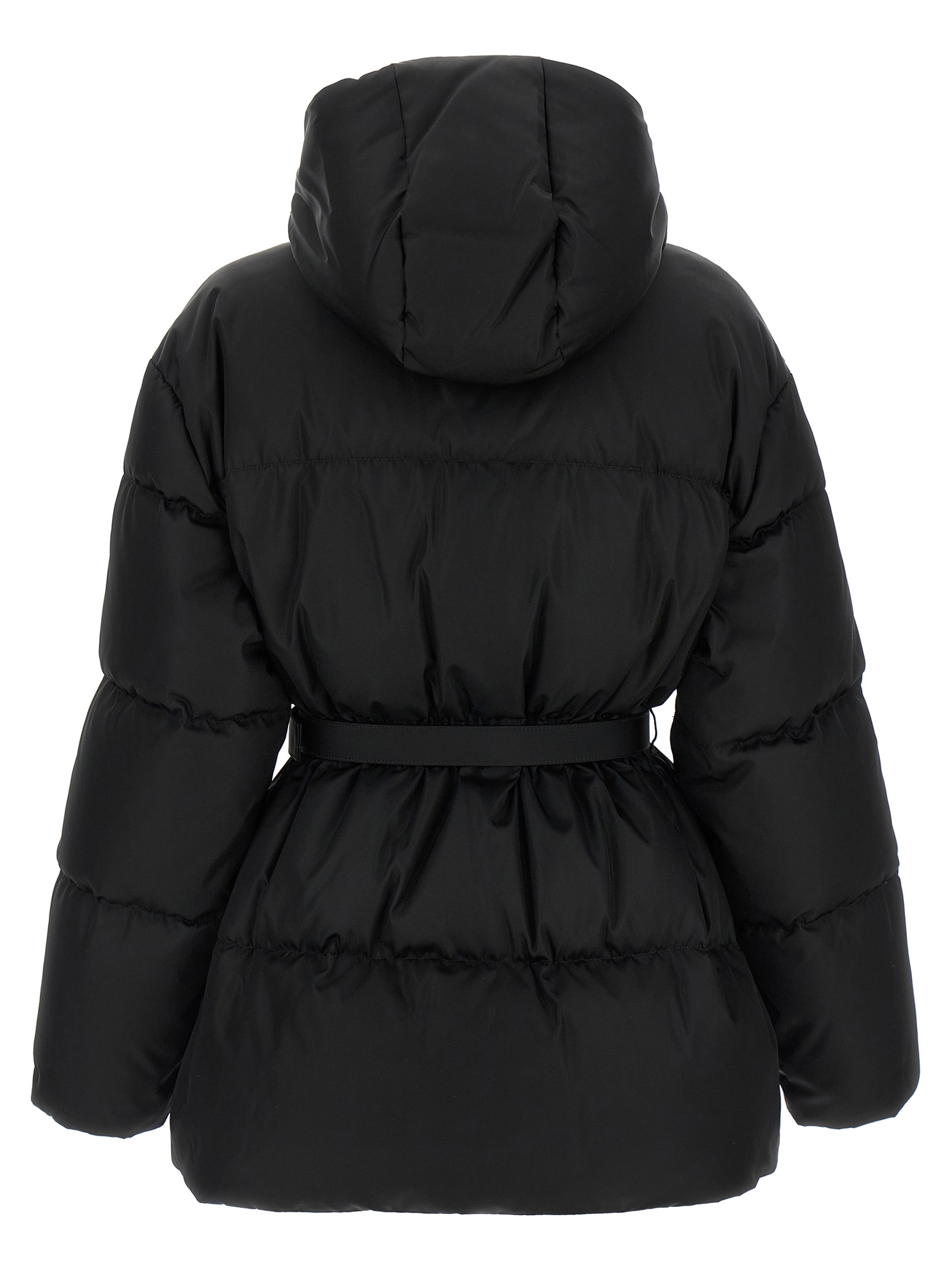 Re-Nylon down jacket, adjustable hood, front zip closure, elastic waistband, pockets, long sleeves, drawstring at the hem, removable belt.