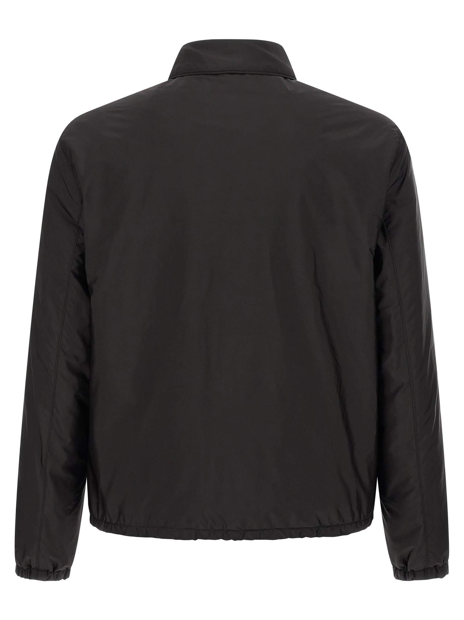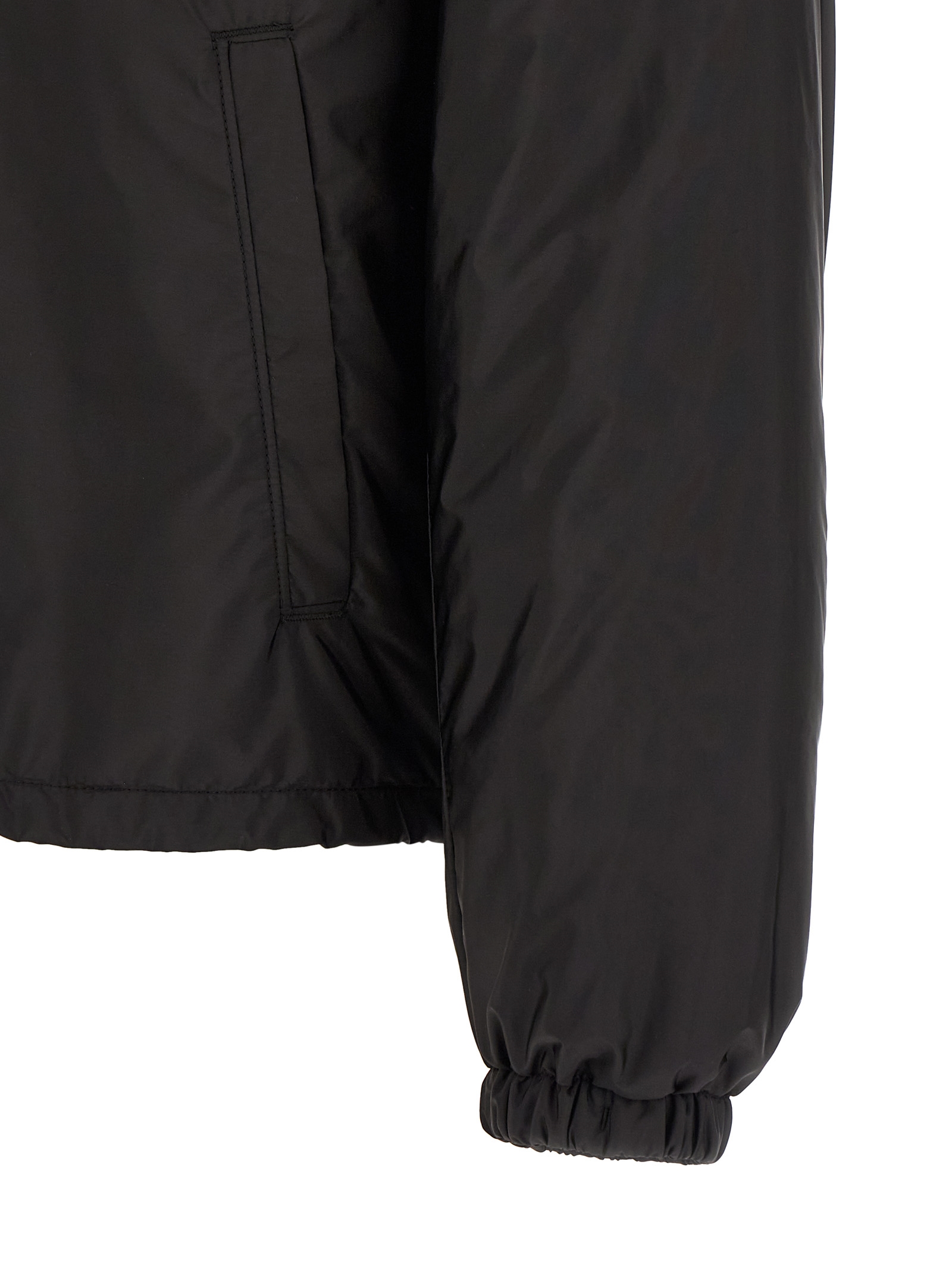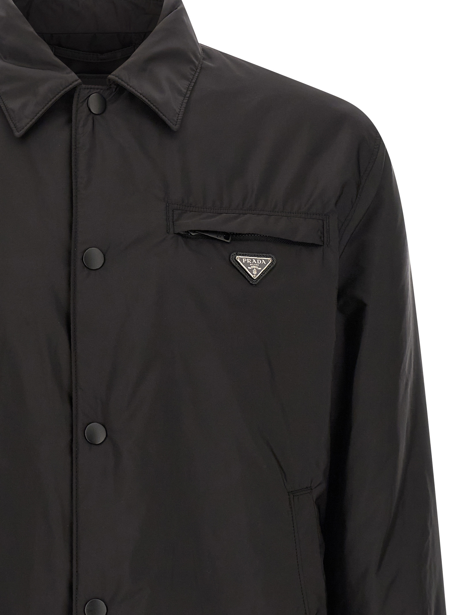 Lightly padded Re-Nylon feather jacket, pocket with triangle logo in enamelled metal, shirt collar, front snap button closure, long sleeves with elastic cuffs, drawstring on the hem.