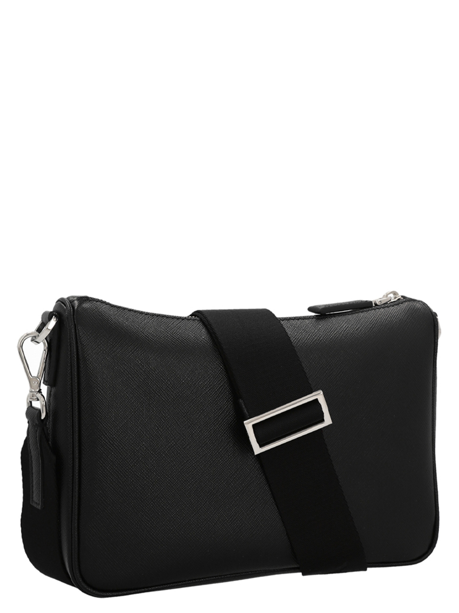 Re-Nylon & Saffiano crossbody bag with adjustable and removable shoulder strap with removable pouch, zip closure and triangle logos.