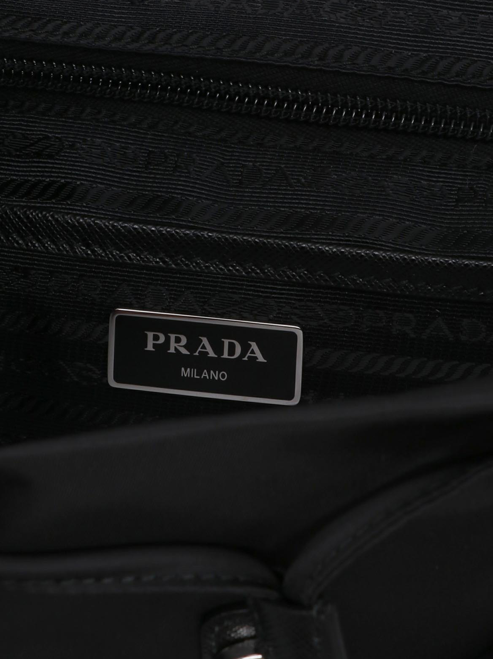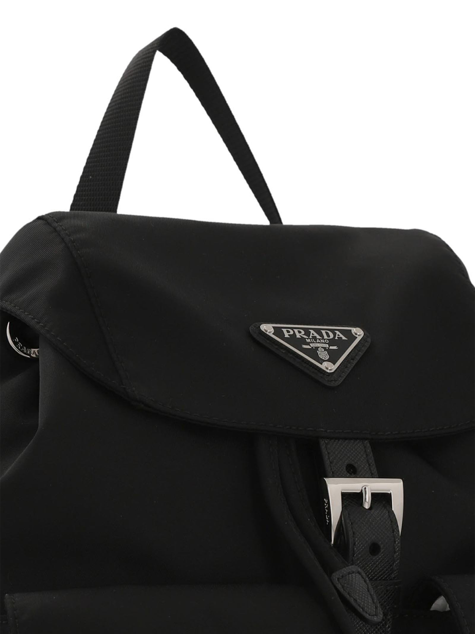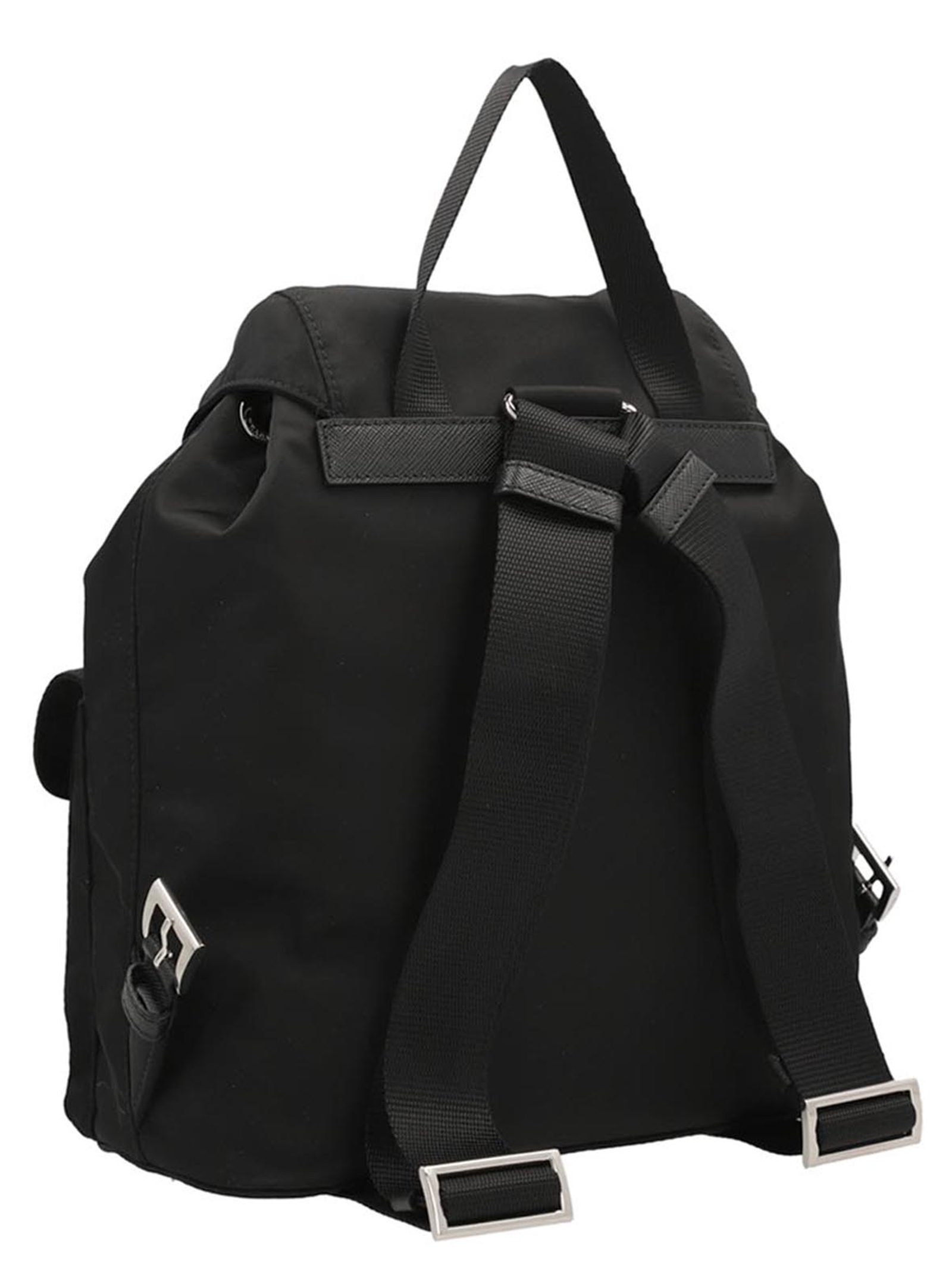 Re-nylon small backpack with enameled metal triangle logo application, saffiano leather details, n inner drawstring closure and inner drawstring, nd adjustable shoulder straps. JULIAN SUSTAINABLE: This product is made with Re-Nylon, regenerated yarn made from recycled and purified plastic collected in oceans, fishery nets and textile fibers.