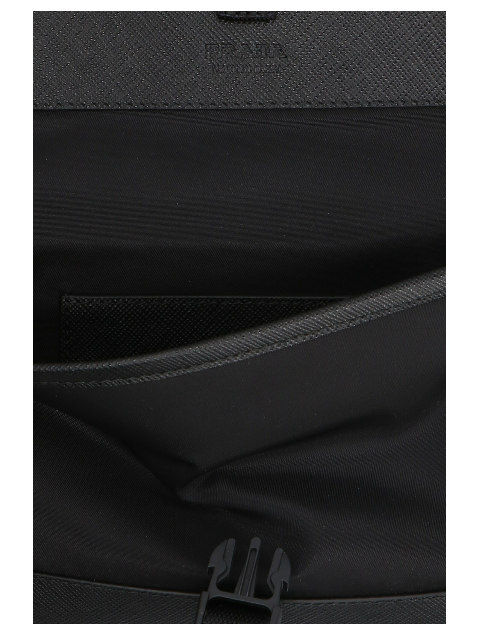 Re-Nylon smartphone bag with a front logo application, a flap closure with a buckle, leather details and an adjustable and removable shoulder strap.