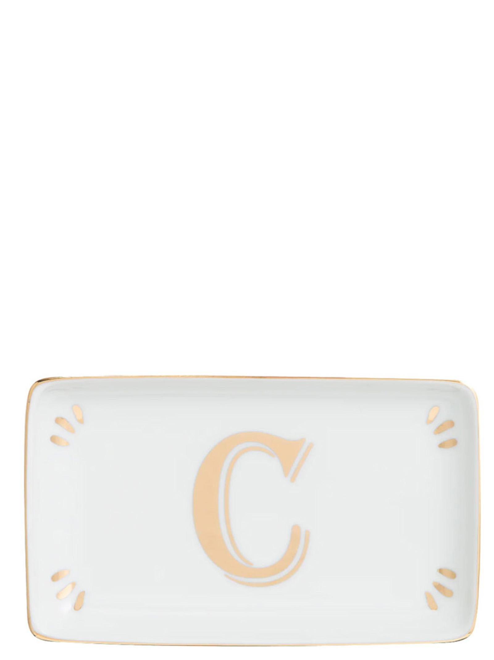 Rectangular porcelain vain pocket tray with gold decal letter ‘C’.