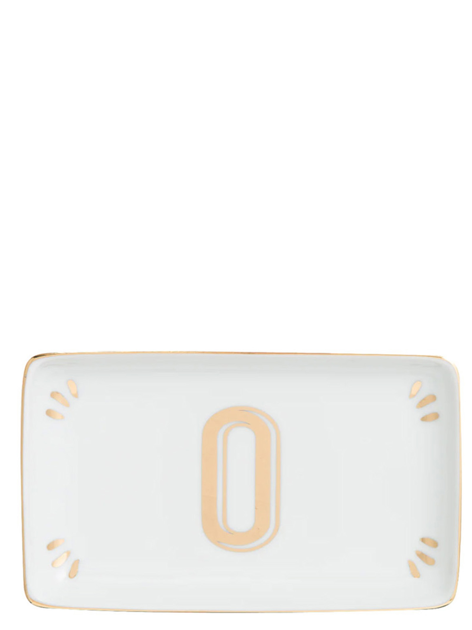 Rectangular porcelain vain pocket tray with gold decal letter ‘O’.