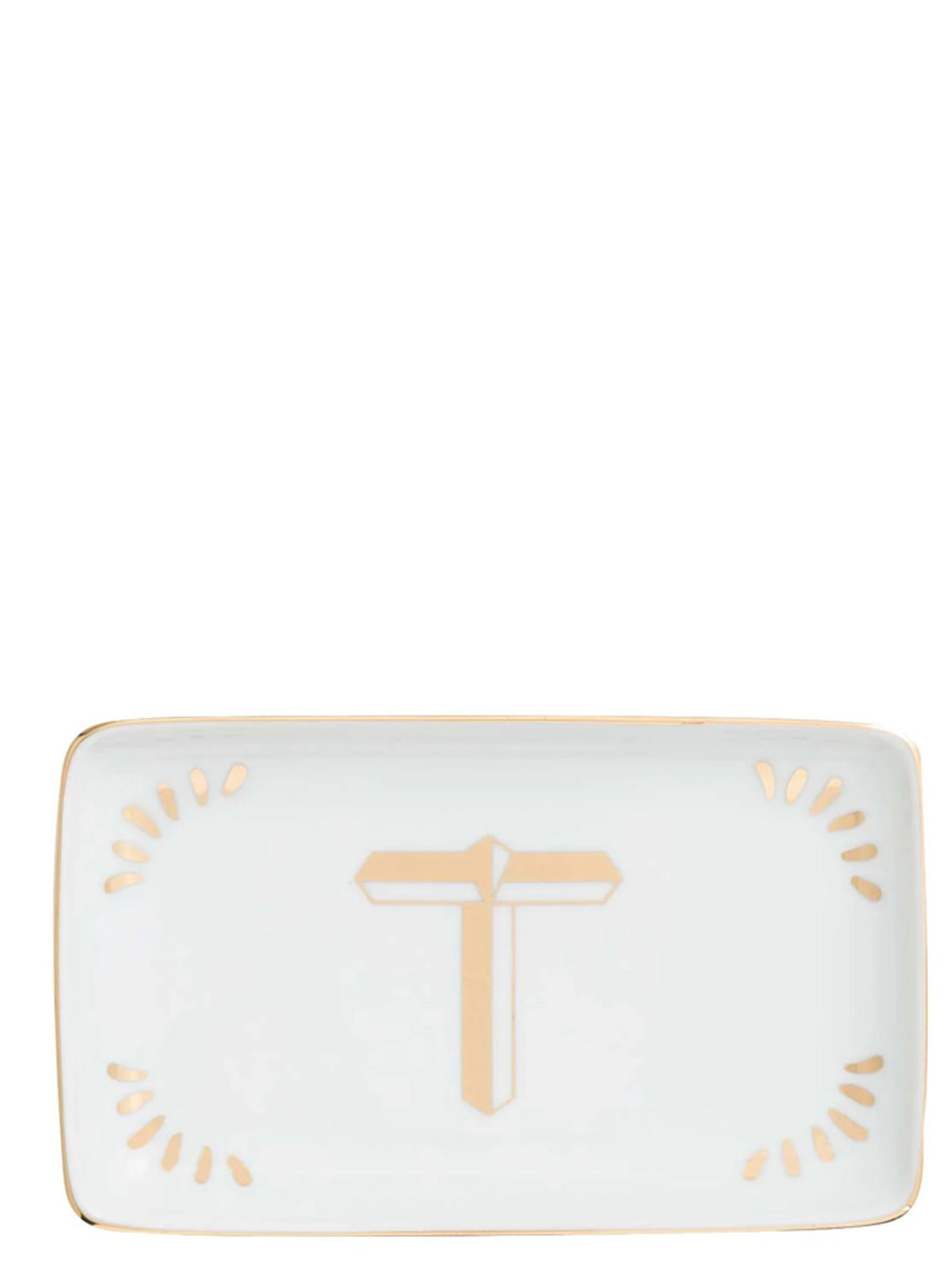 Rectangular porcelain vain pocket tray with gold decal letter ‘T’.
