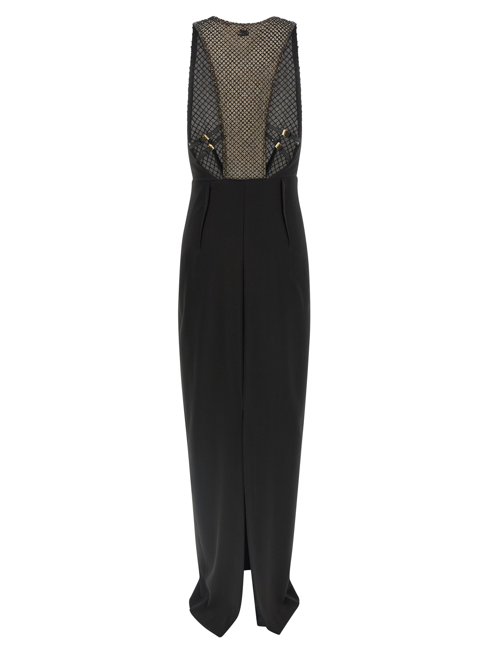 ‘Red Carpet’ long dress in lightweight crêpe consisting of top with rowing neckline in tulle embroidered with crystals, crew neck and bustier with cut-out details and adjustable patent leather straps at the back, side zip closure, sleeveless, wide back split, monogram satin lining.