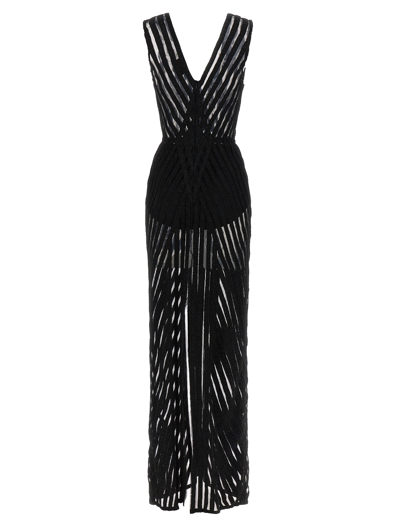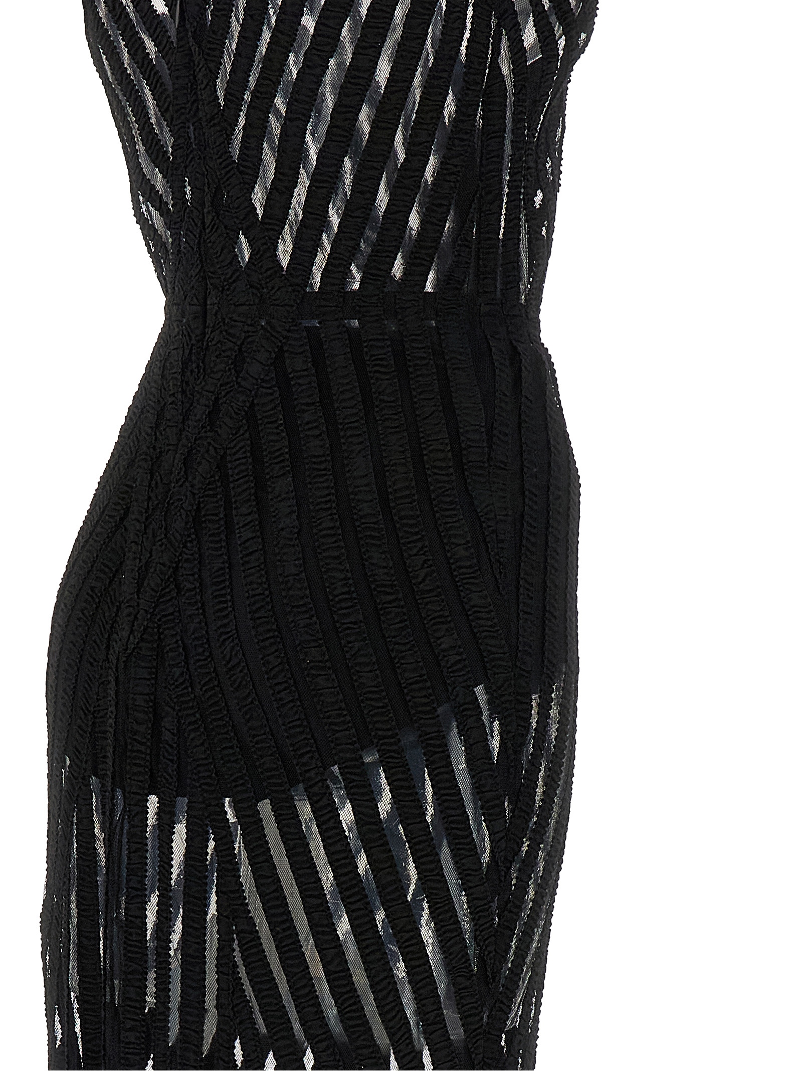 Long ‘Red Carpet’ dress in tulle and curled bielastic fabric embossed effect striped pattern, I don’t see, wide V-neck front and back, sleeveless, zip closure and back split, removable culottes.