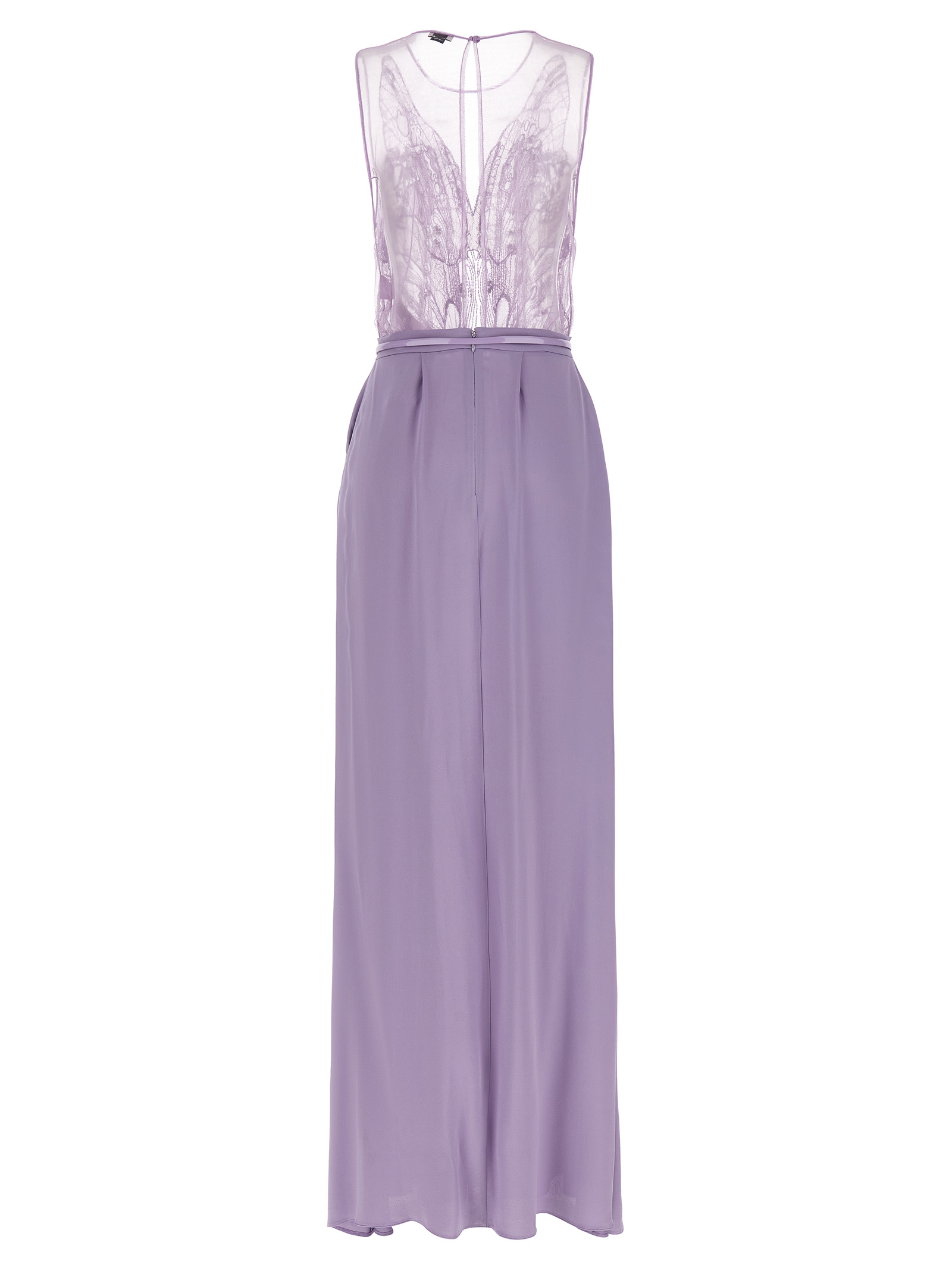 ‘Red Carpet’ long dress consisting of removable tulle top embroidered with sequins and micro-crystals dรฉgradรฉ effect on the front, crew neck with back button closure and wide teardrop cut-out, sleeveless and wide georgette skirt, wheel model with front pinces, flared silhouette, pockets, back zip closure, removable vinyl matching belt.