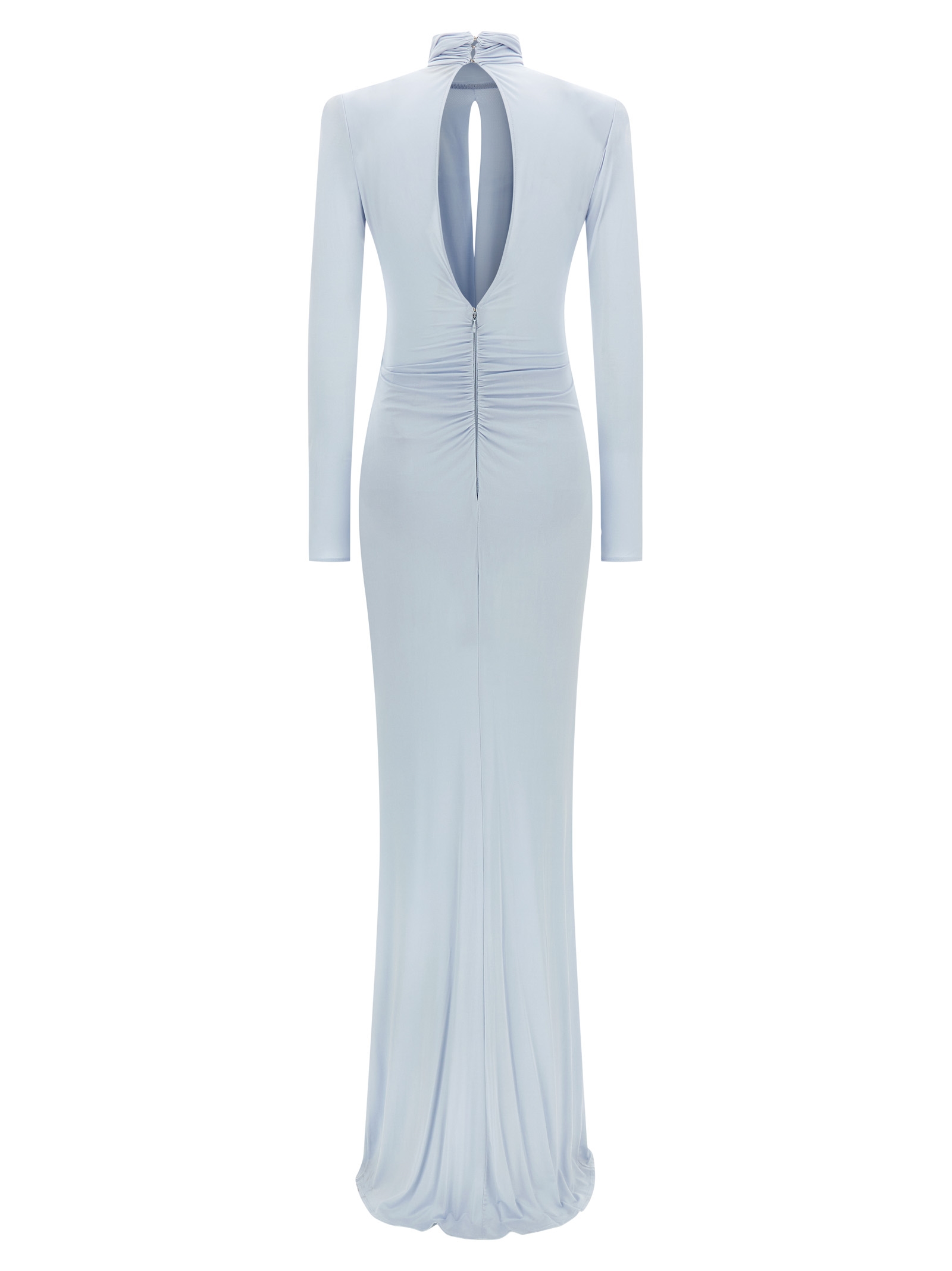 Long ‘Red Carpet’ dress in silk-effect stretch fabric, high neck and button closure, cut out detail at the source and back, front metal buckle, deep central split, removable padded shoulders, inner briefs with zip and hooks, long sleeves.