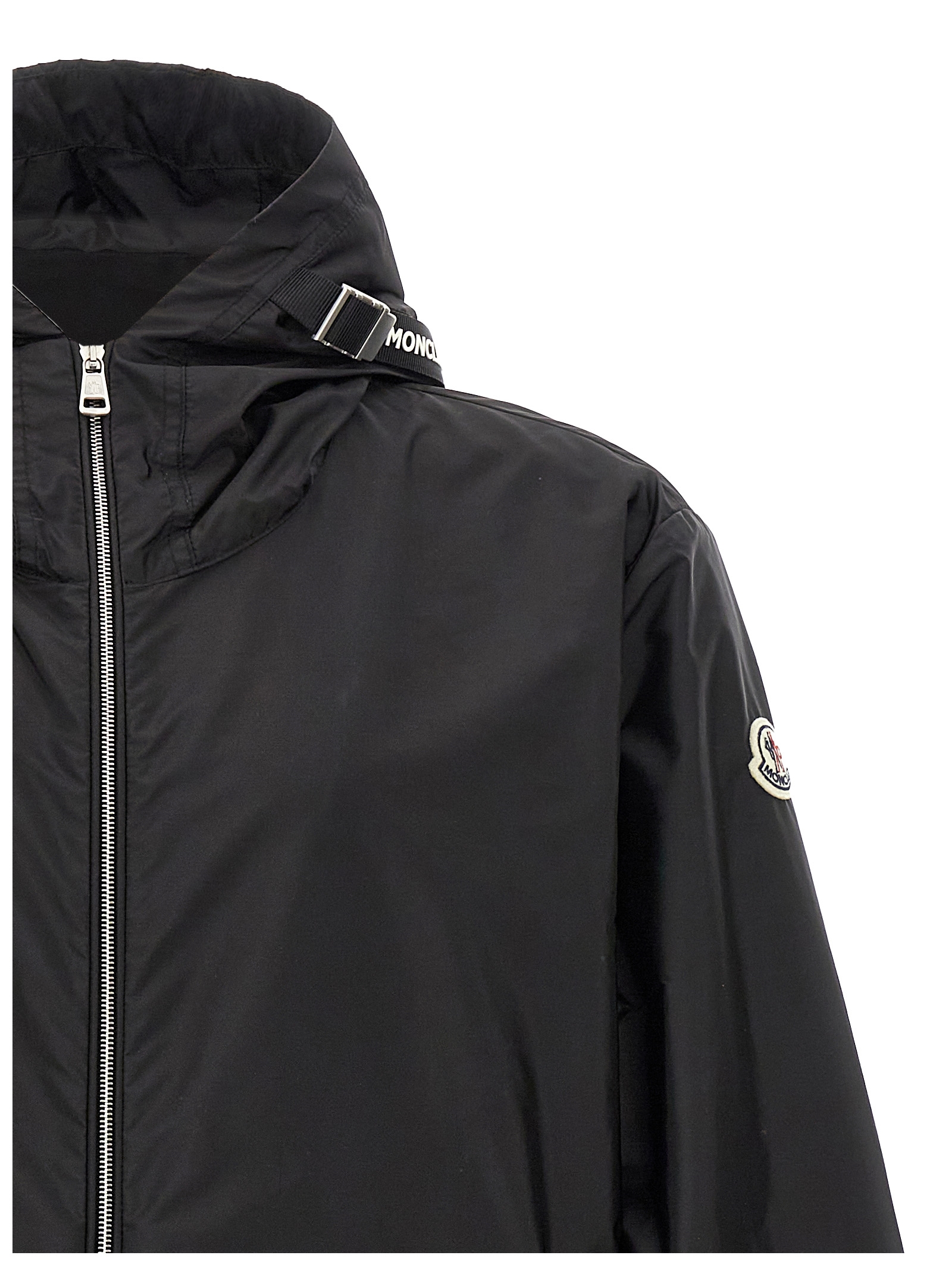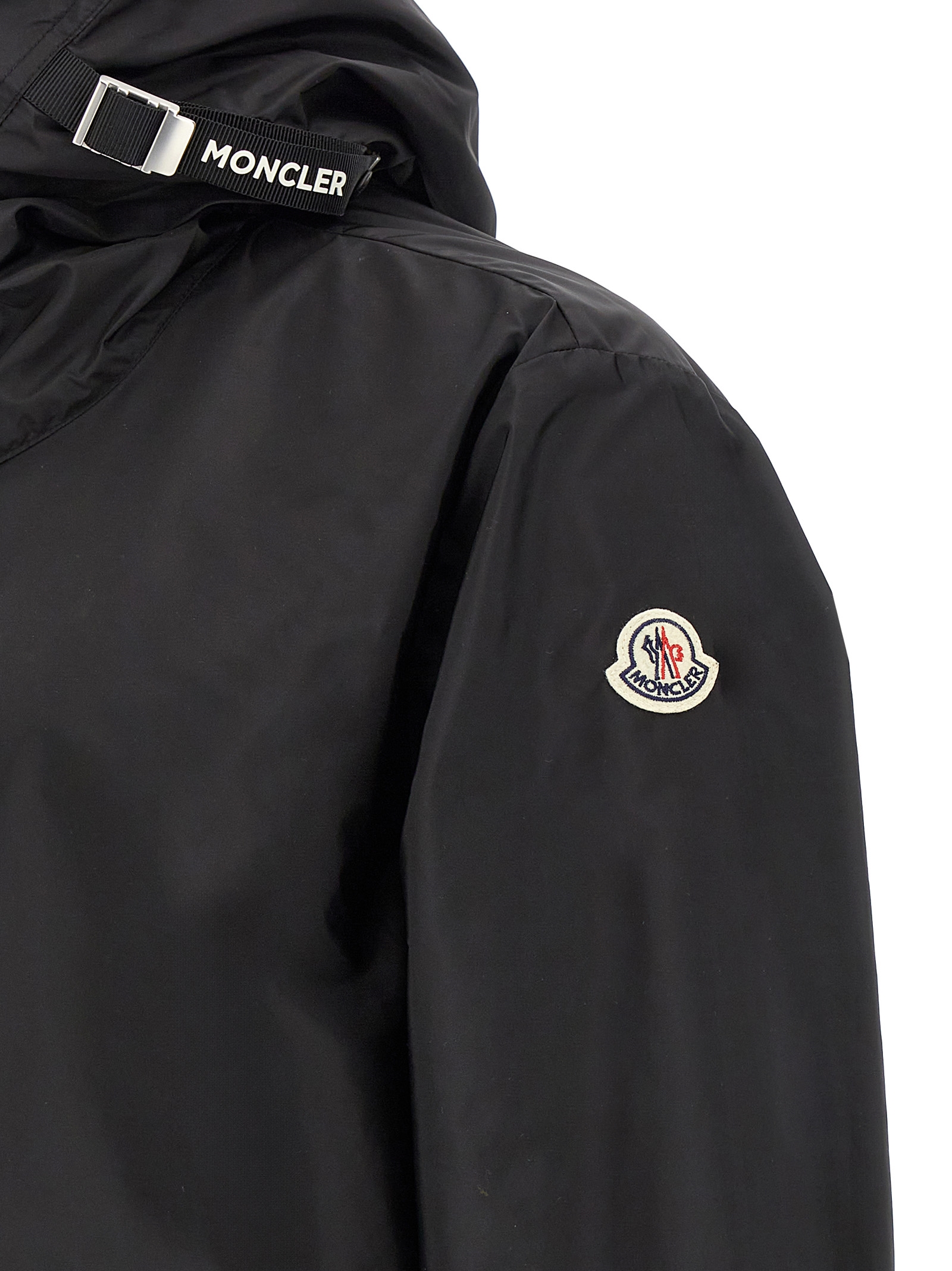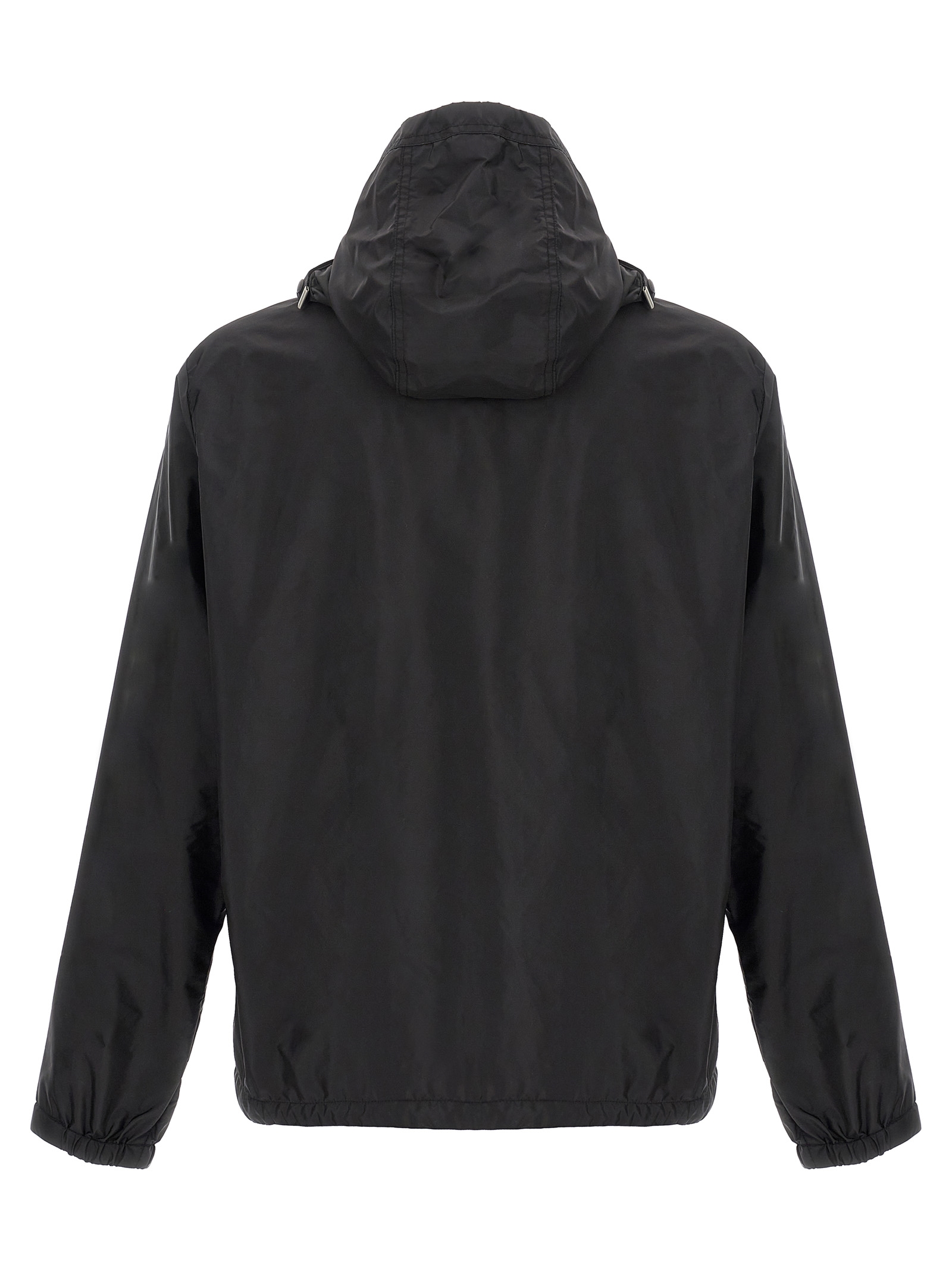 ‘Remoray’ waterproof nylon waterproof, hood with adjustable side logo grosgrain straps, high neck, zip closure, pockets, long cuffed sleeves and felt logo patch.