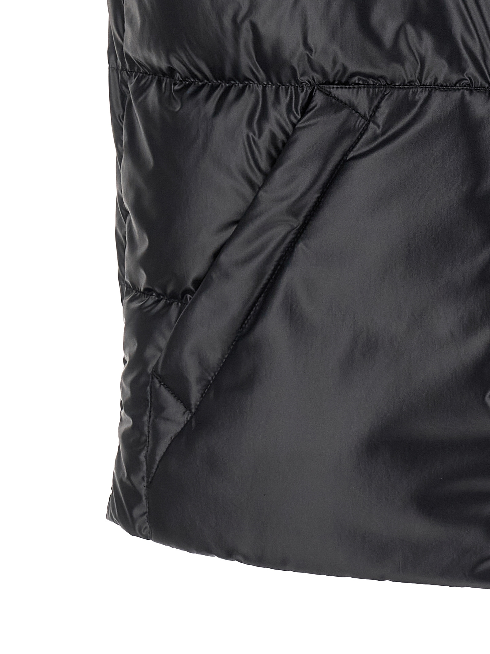 ‘Restigo’ vest in quilted technical fabric with goose feather padding, standing collar, felt logo patch, front zip and snap button closure, pockets.