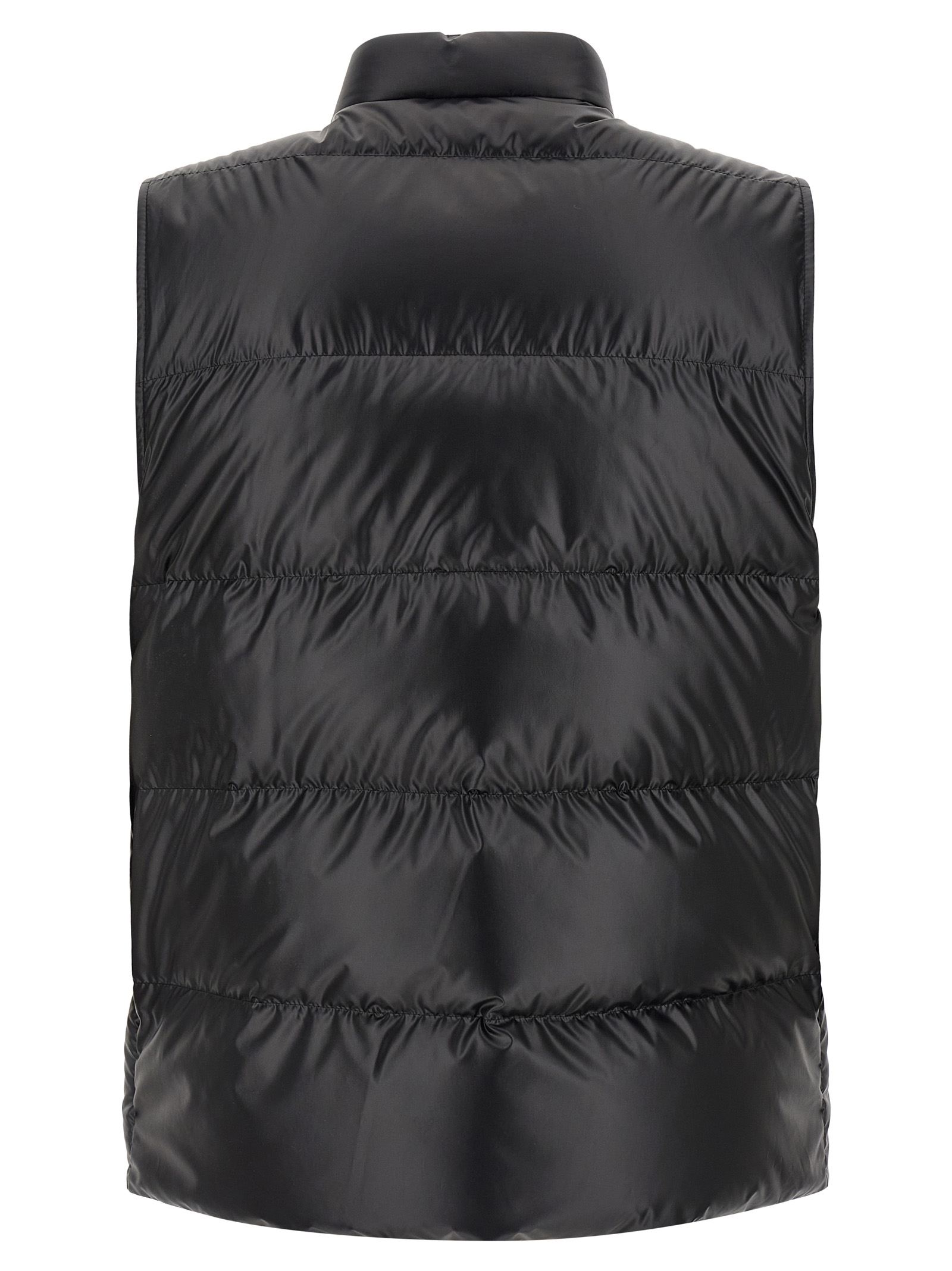 ‘Restigo’ vest in quilted technical fabric with goose feather padding, standing collar, felt logo patch, front zip and snap button closure, pockets.