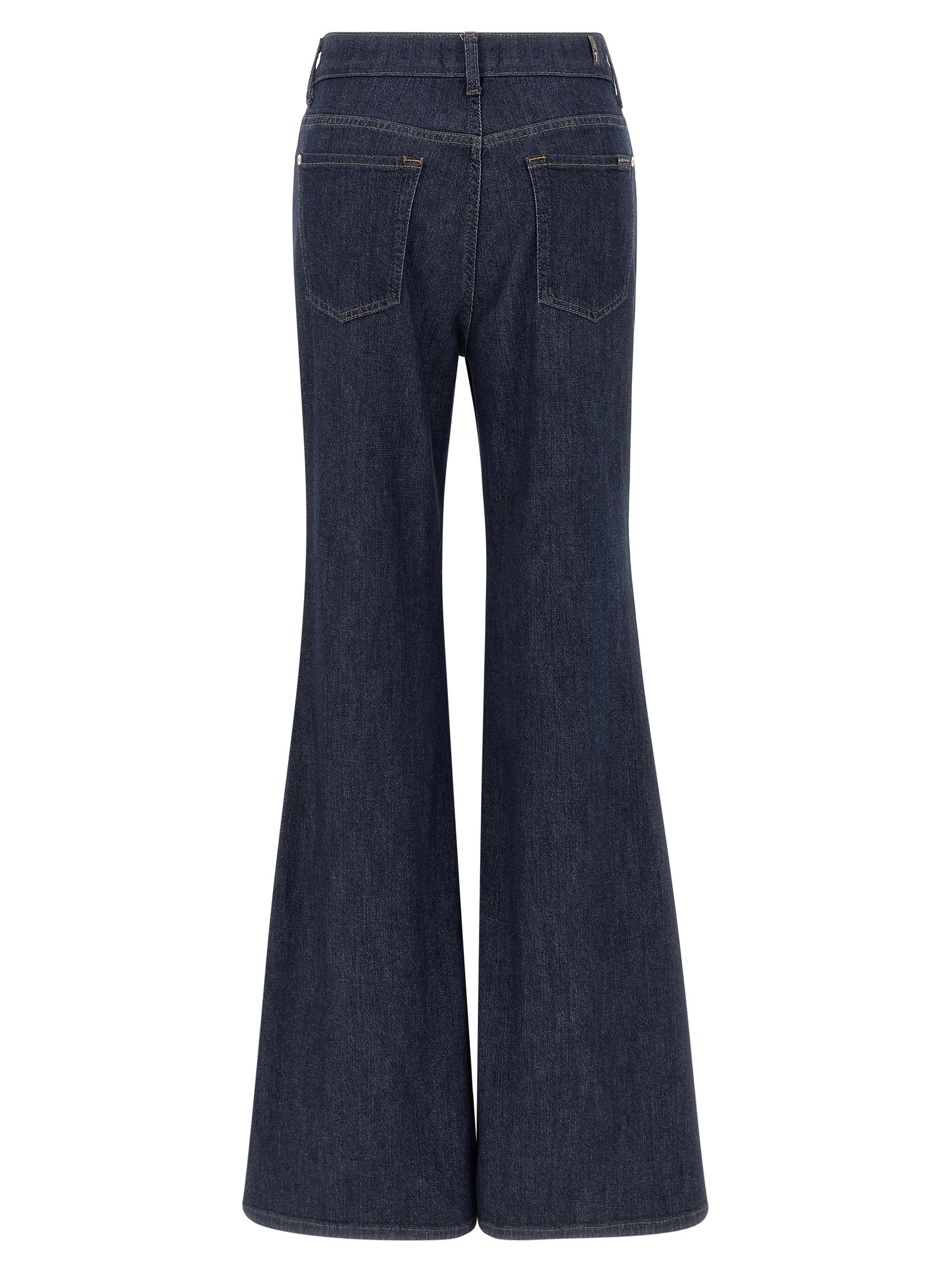 ‘Retro Flare’ stretch cotton denim jeans with contrast stitching, high waist, wide leg with extra flared fit, zip and front button closure, five pockets.