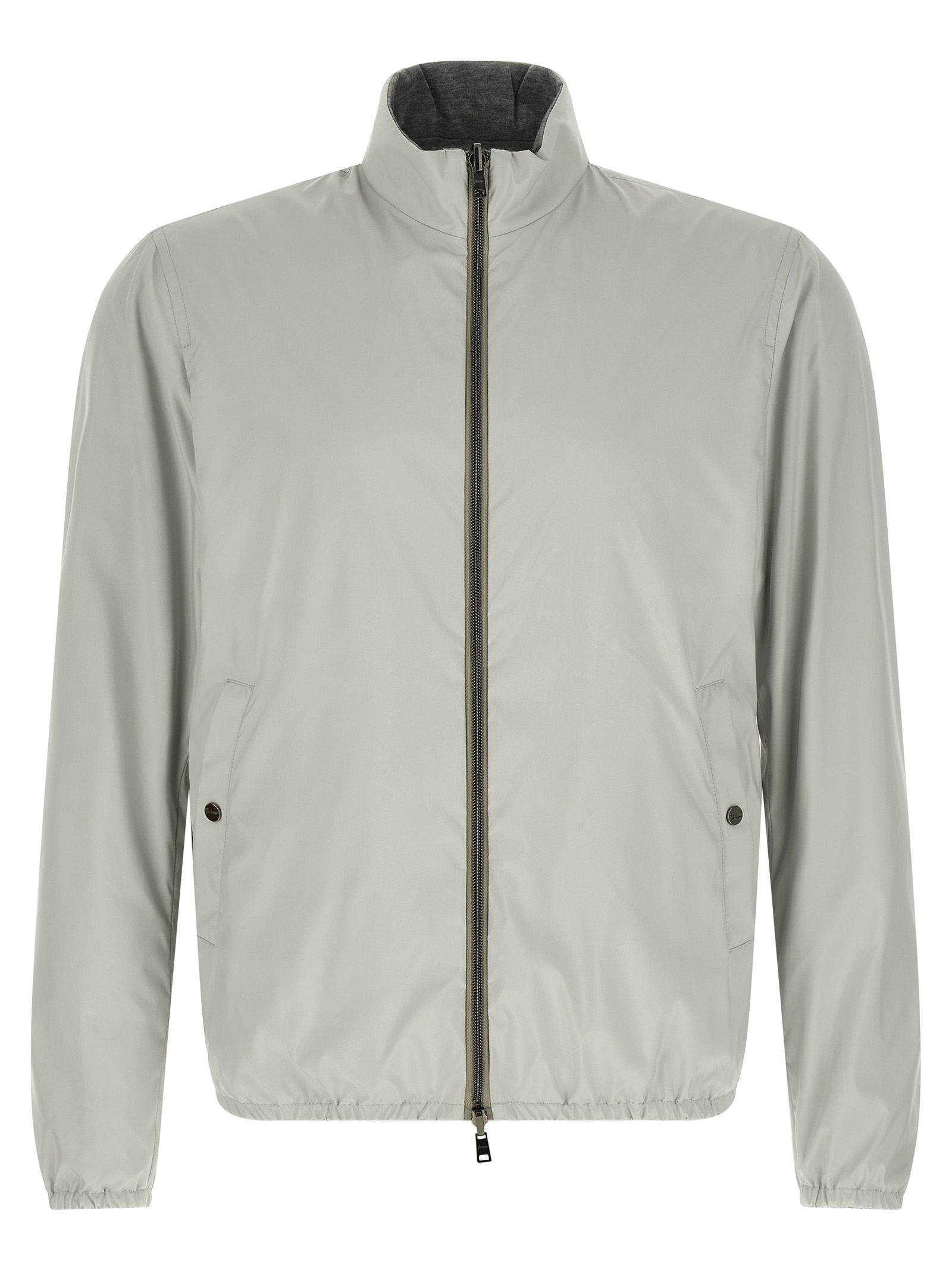 Reversible light bomber jacket in technical fabric and viscose mélange, high neck, front zip closure, pockets, long sleeves with elastic cuffs, elastic hem.