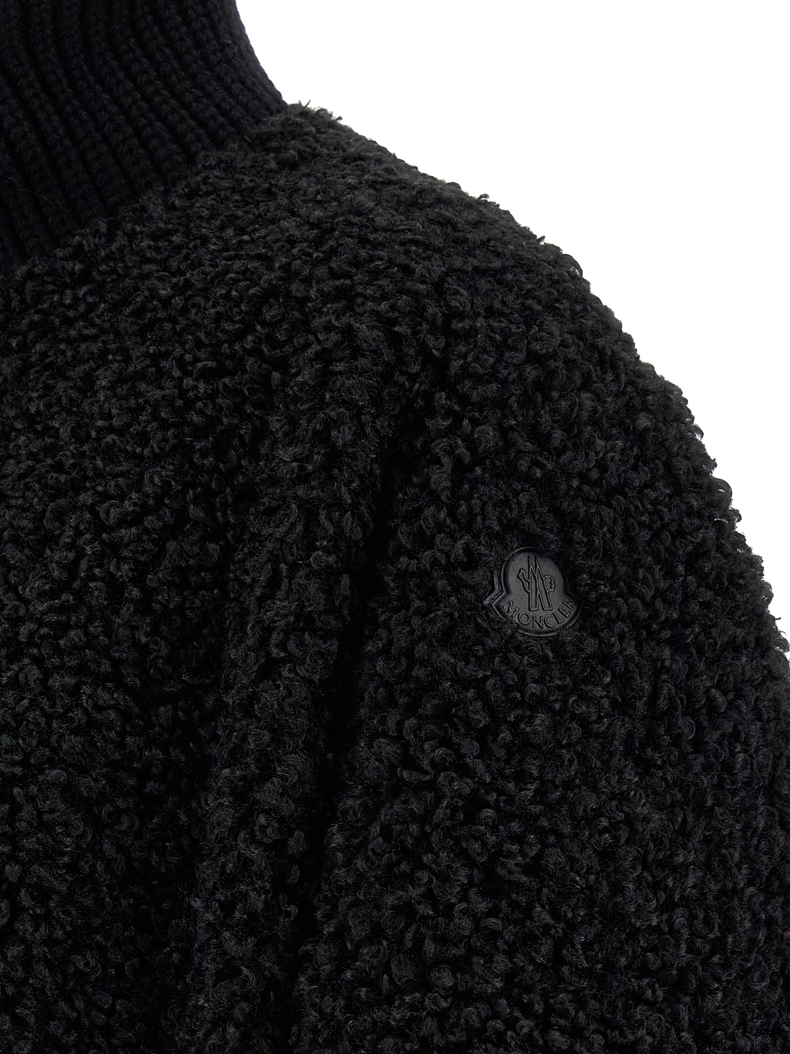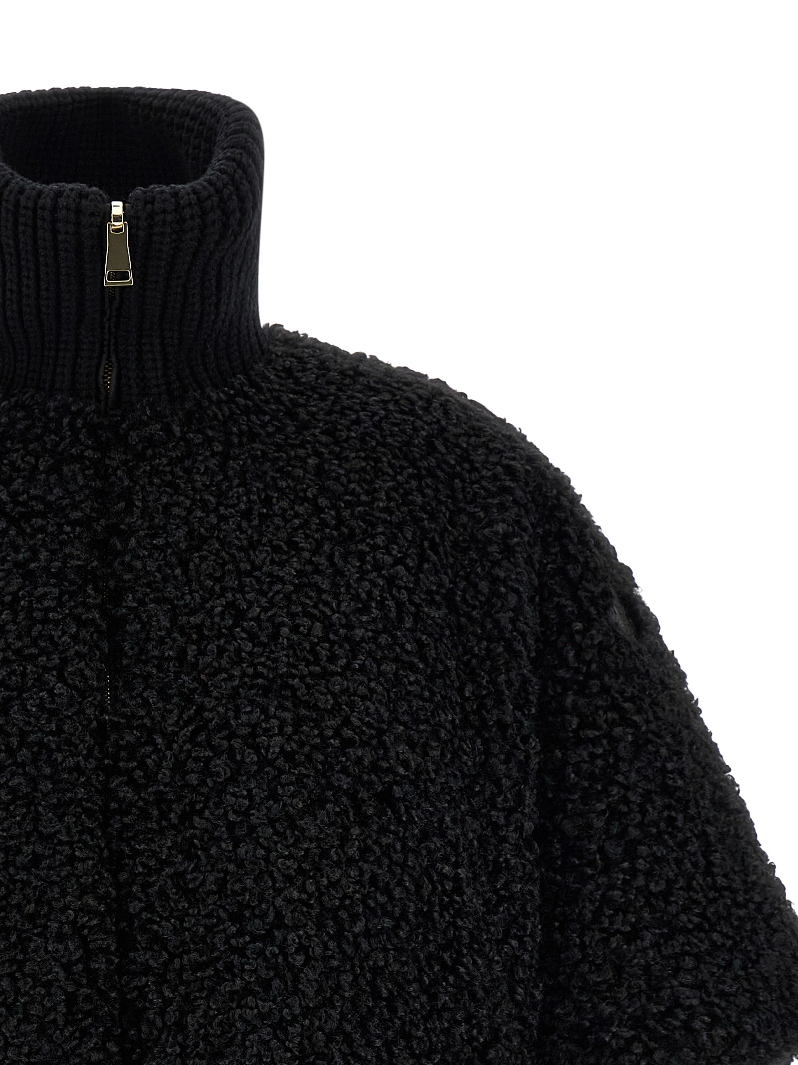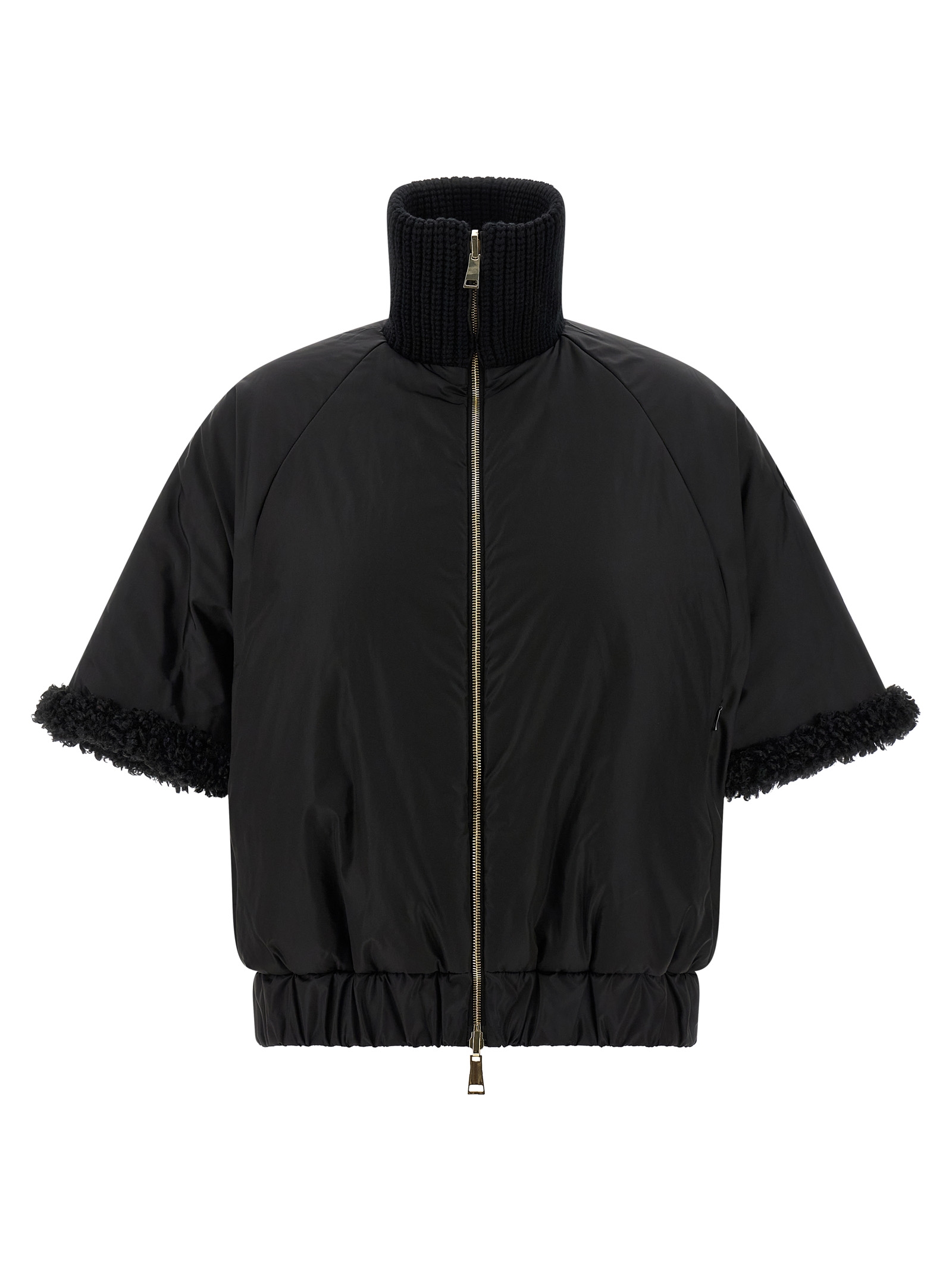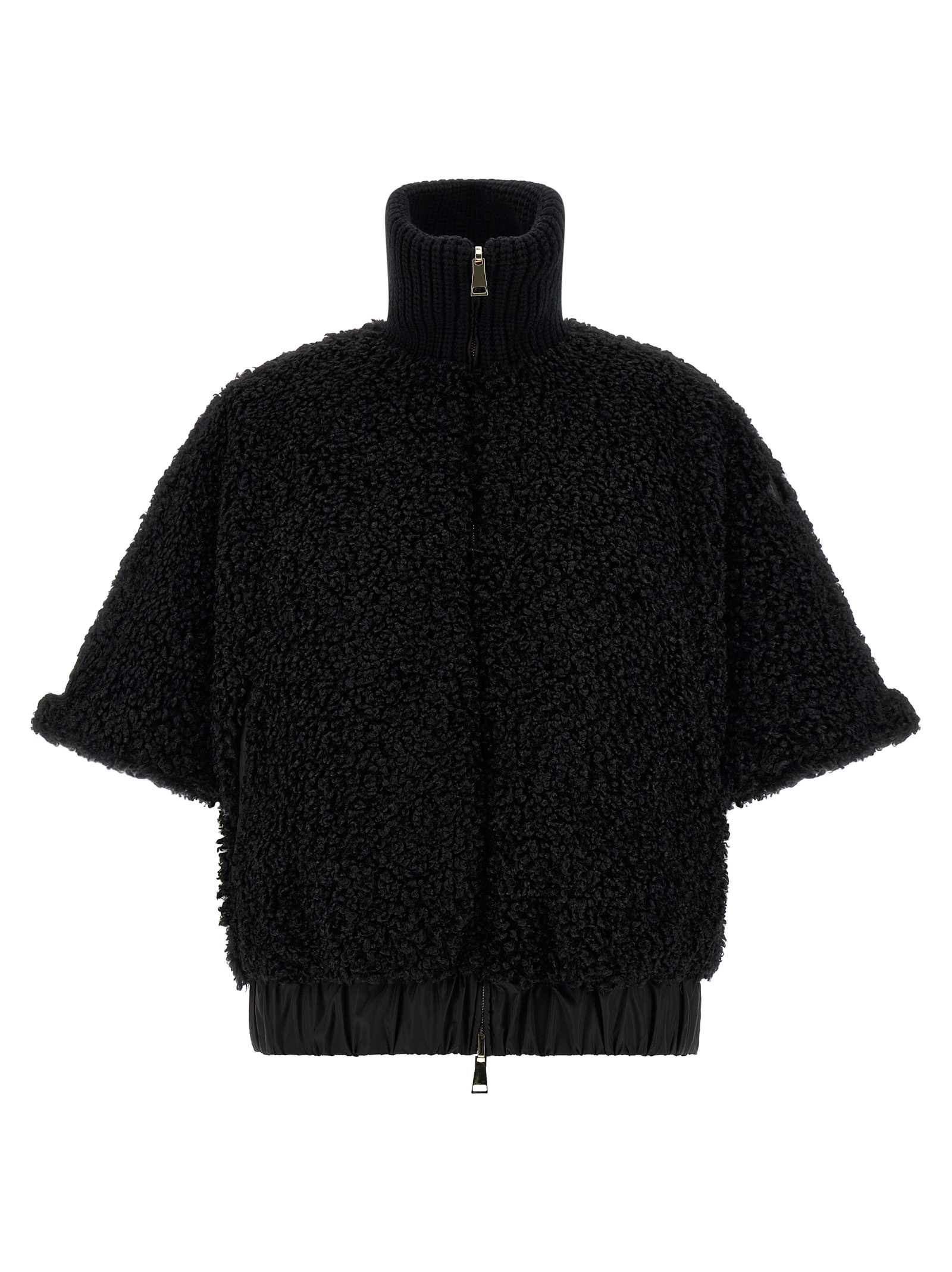 Reversible nylon cape padded with goose down and teddy-effect fleece, ribbed wool knit high neck, front zip closure, short sleeves with tone-on-tone logo patch appliqué, side snap buttons, elastic band on the hem.
