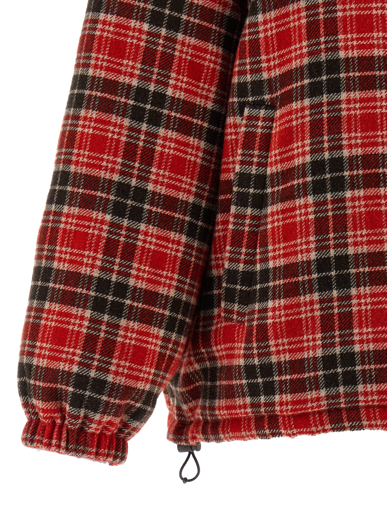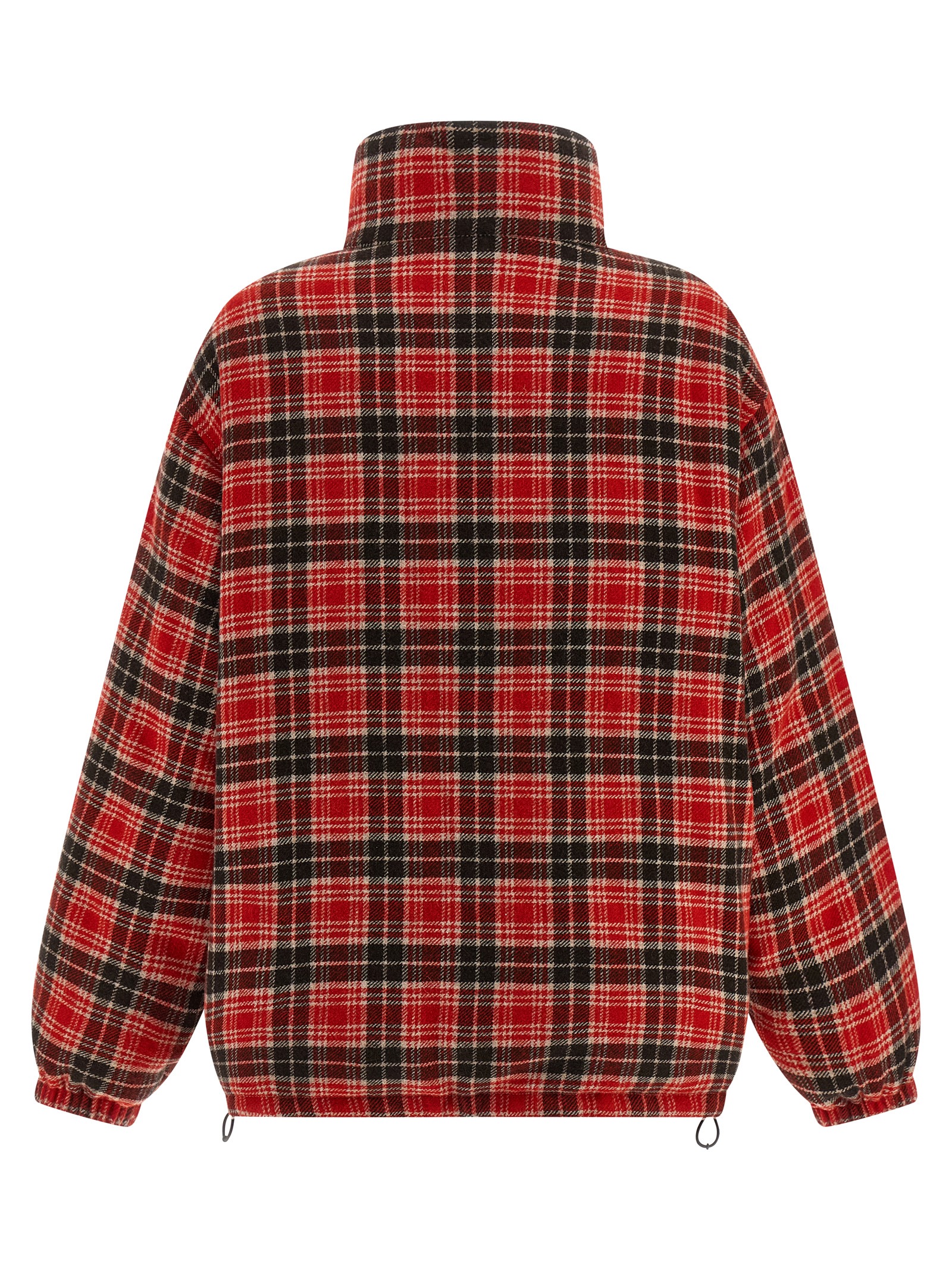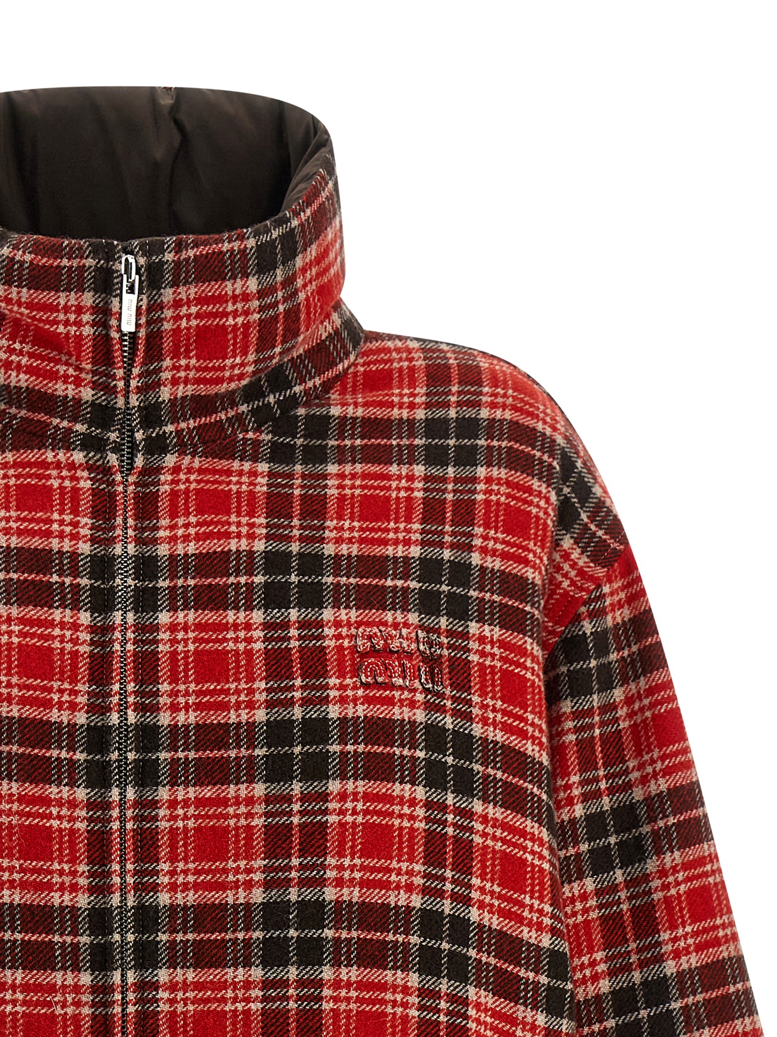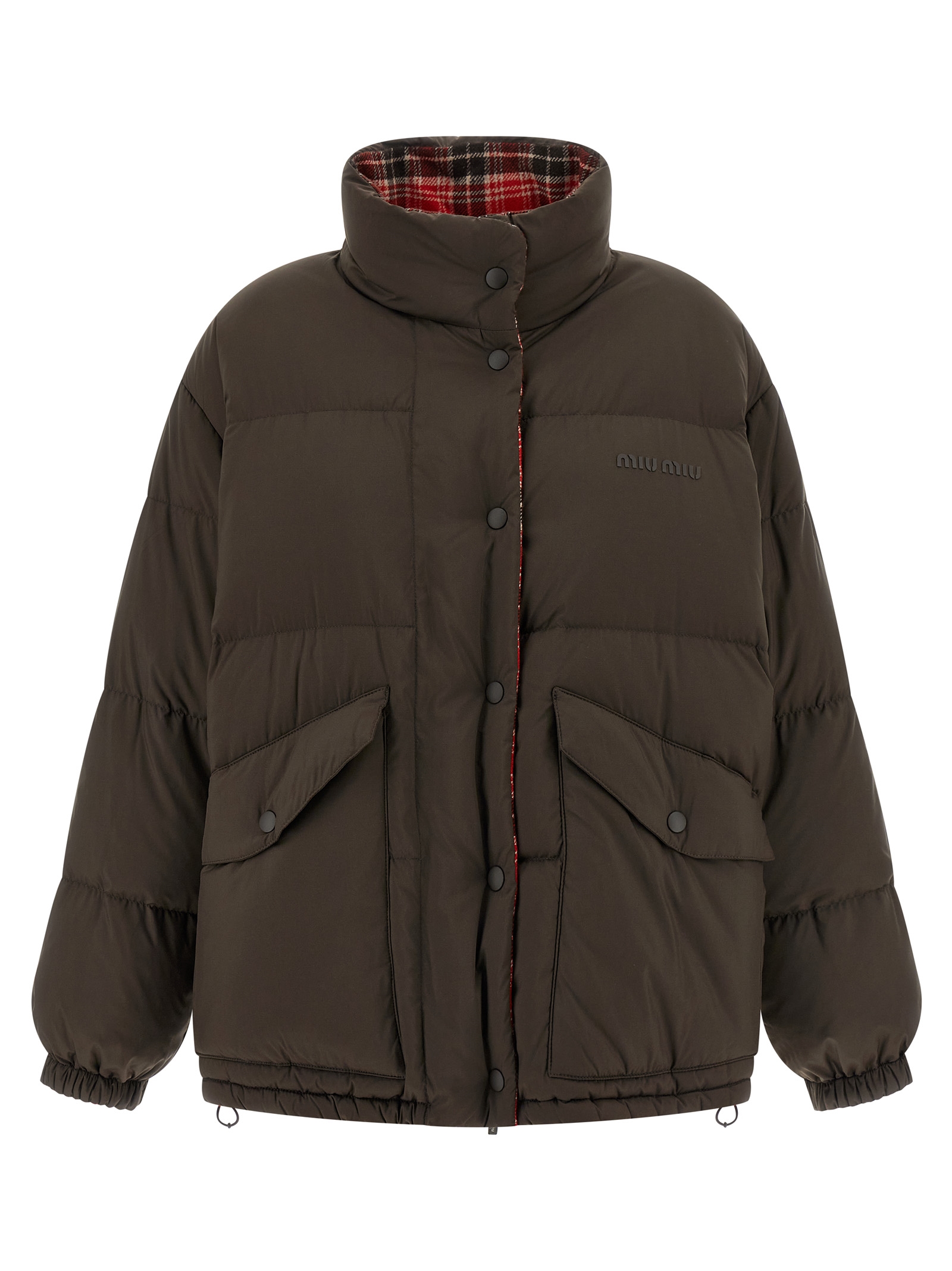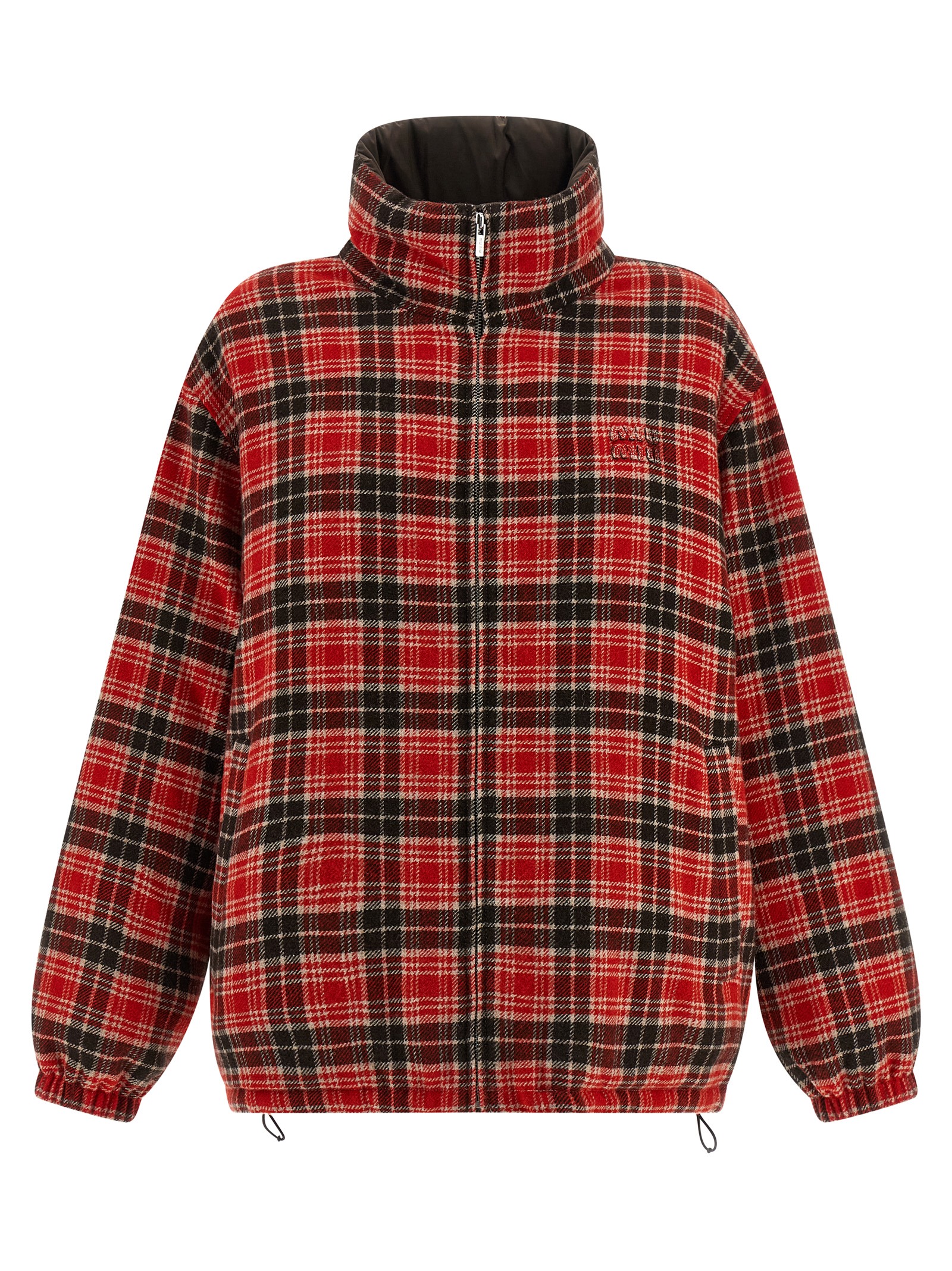Reversible down jacket in plain tec, quilted pongé padding and goose down and tartan wool, standing collar, tone-on-tone logo patch on the front, zip and snap button closure, pockets, long sleeves with dropped shoulders and elastic cuffs, drawstring on the hem.