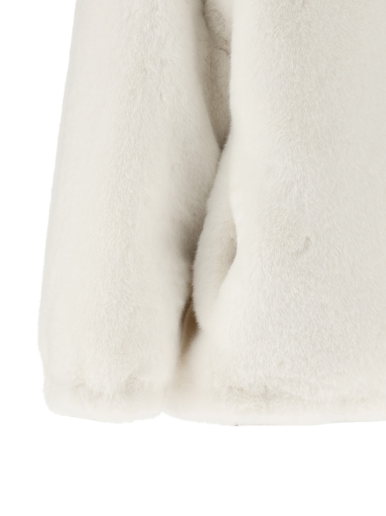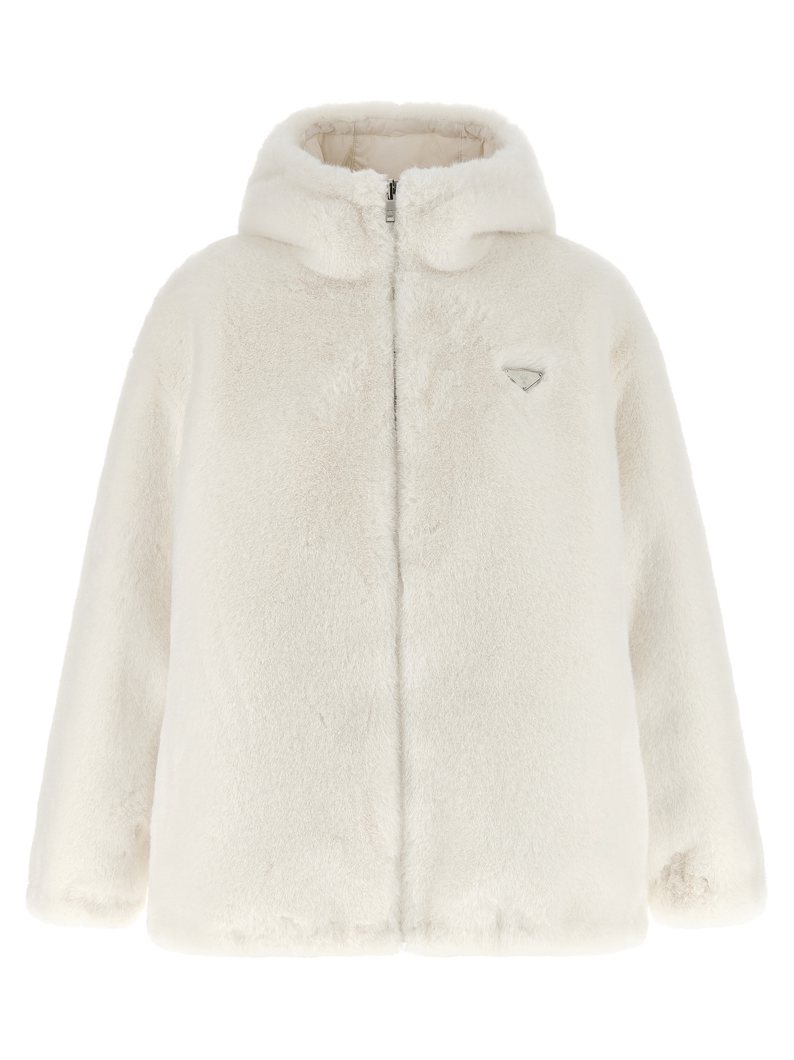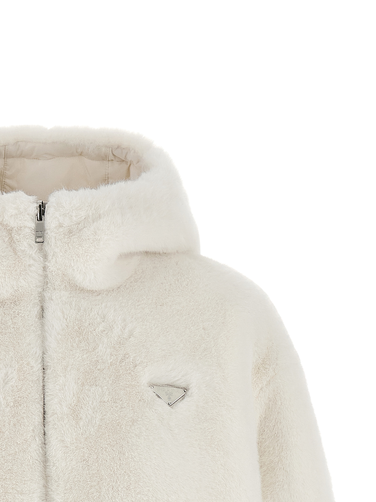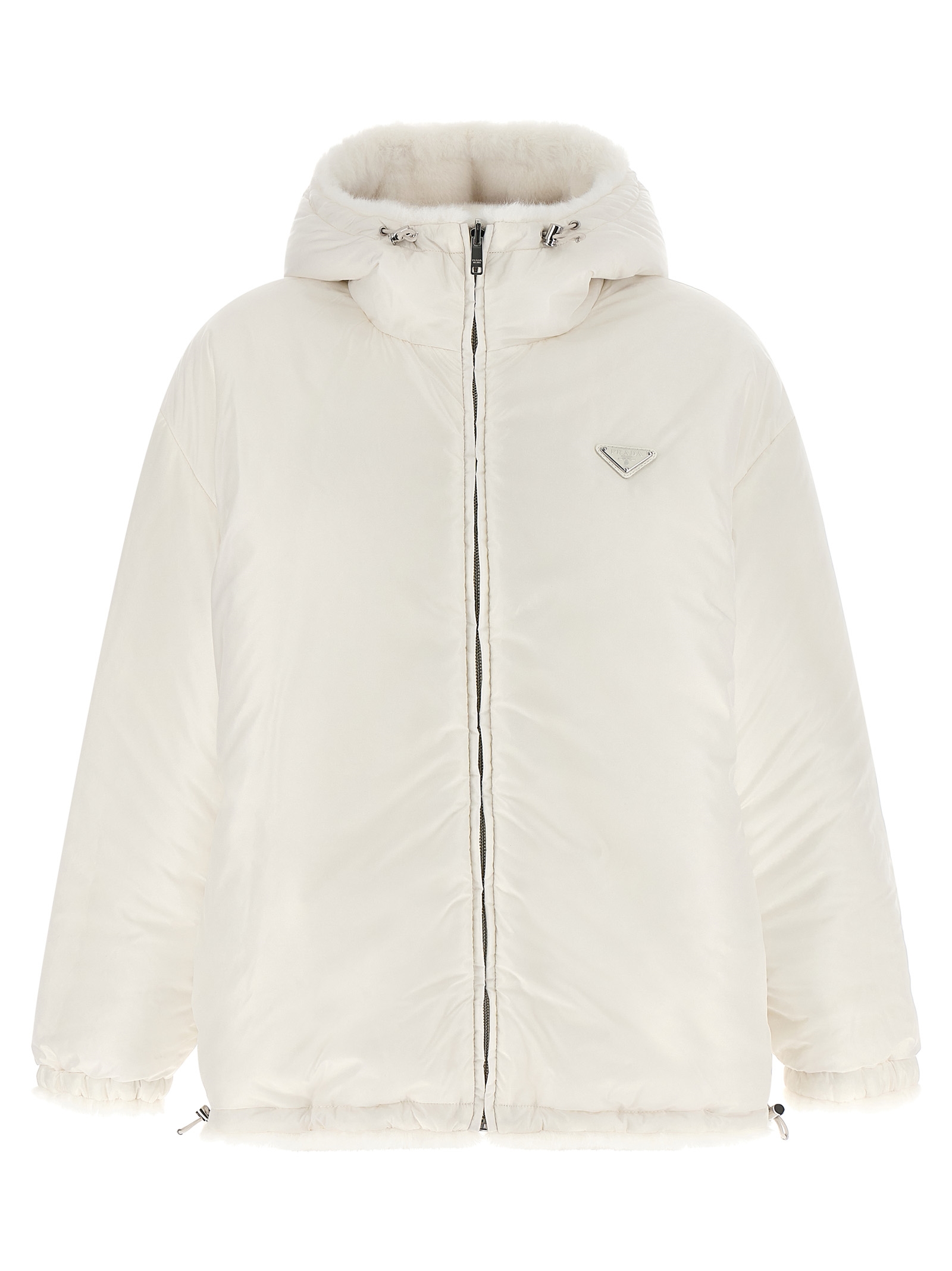 Reversible faux fur and Re-Nylon jacket with goose feather padding, adjustable hood, triangle logo in enamelled metal and front zip closure, pockets, long sleeves with elastic cuffs, drawstring on the hem.