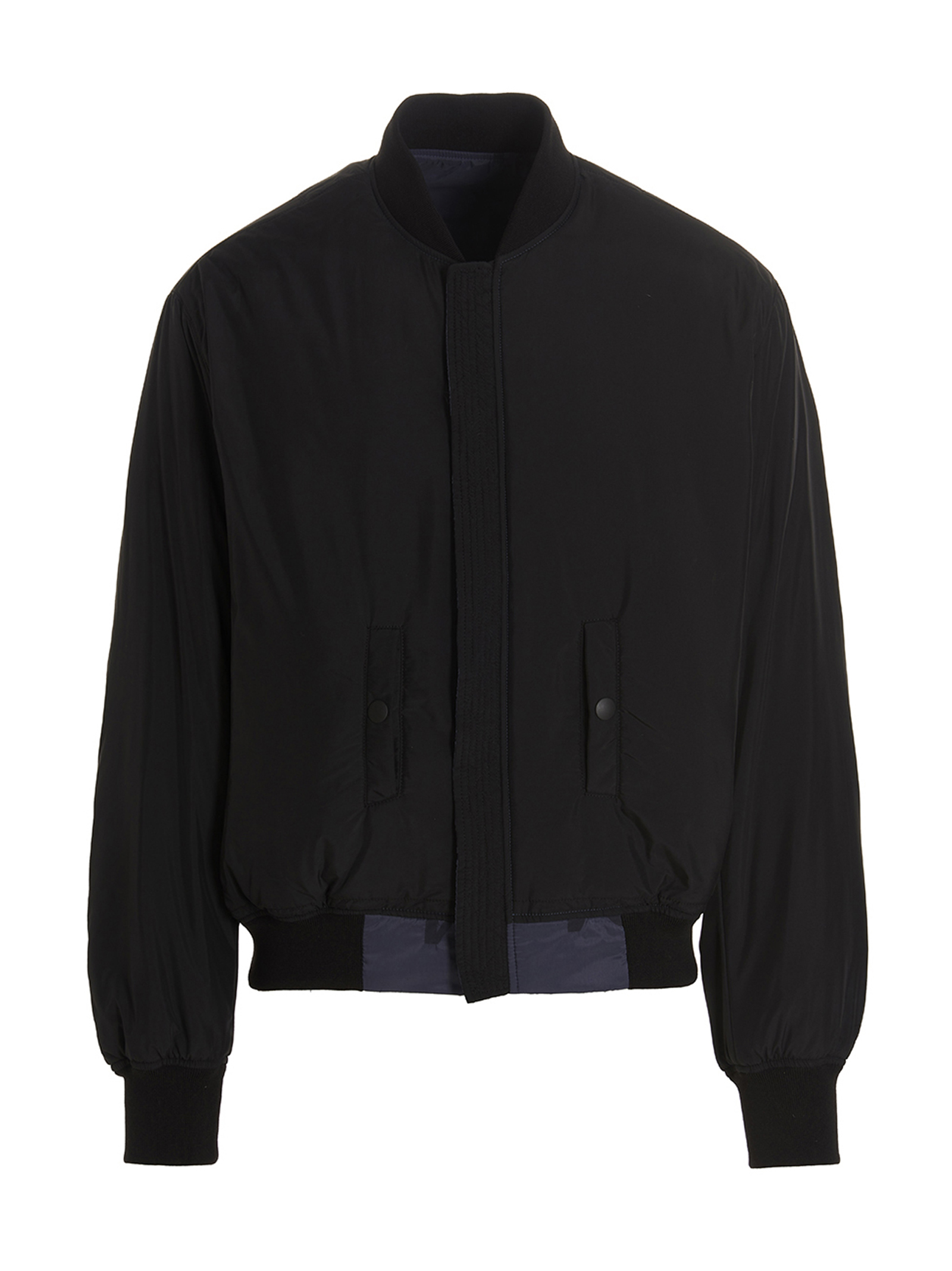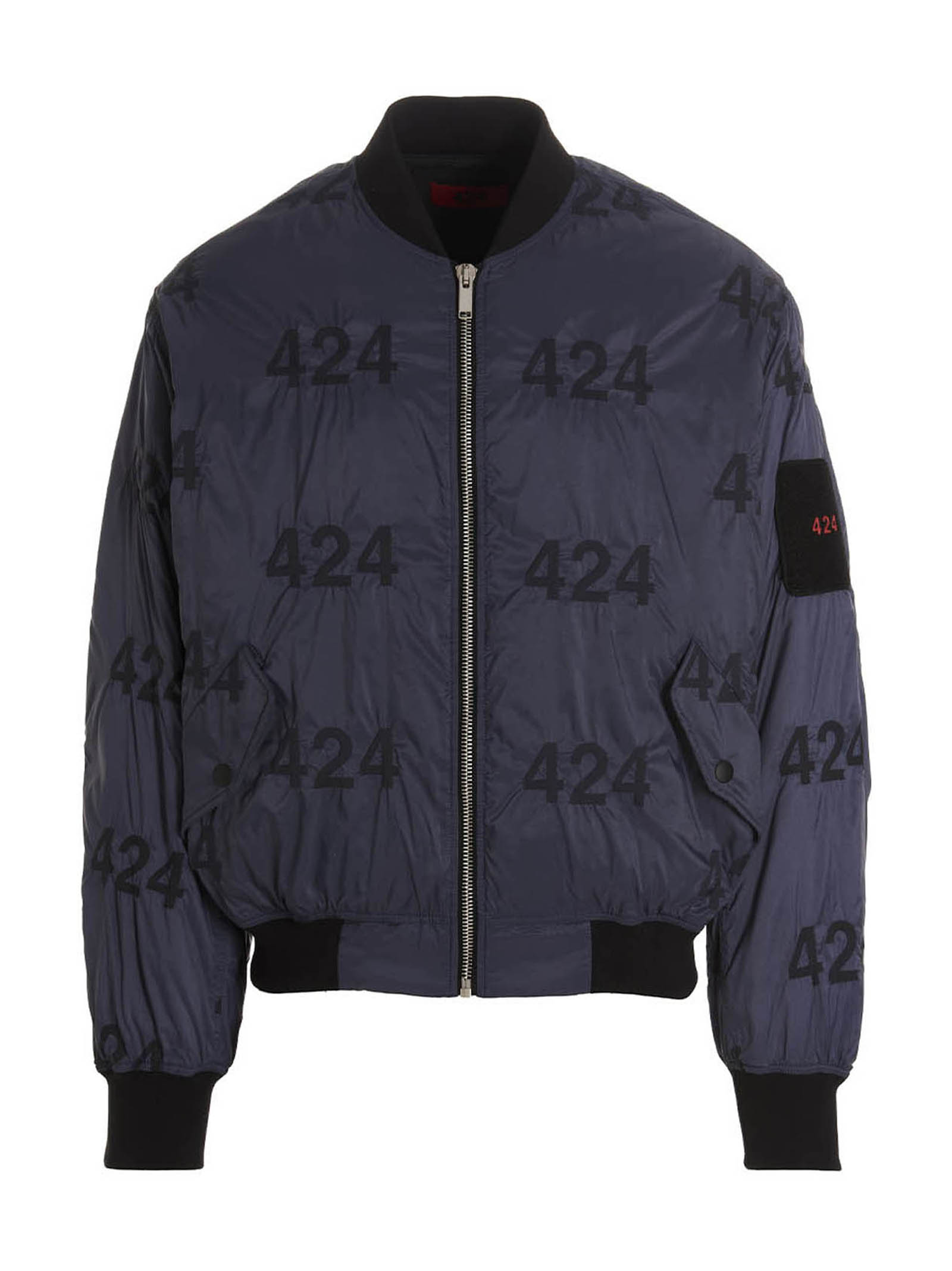 Reversible nylon bomber jacket with an all-over logo print on one side and a solid color on the other, a zipper closure, pockets, long cuffed sleeves.