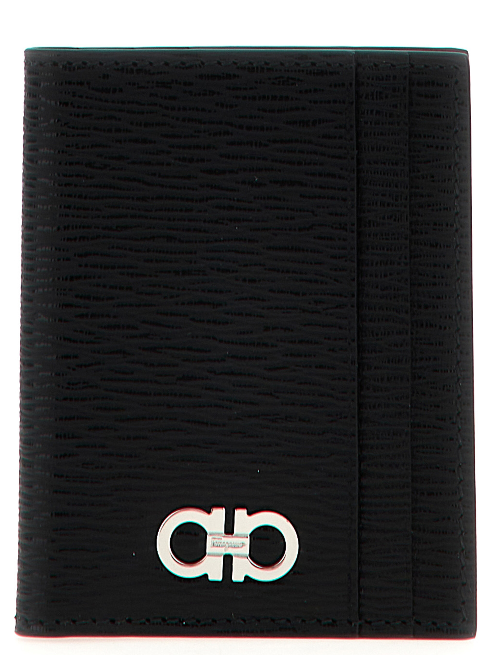 ‘Revival gancio’ leather card holder with wave effect, metal logo detail.