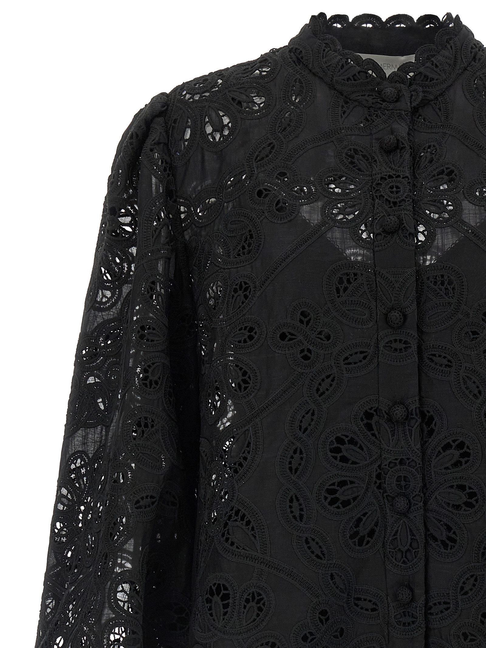 ‘Rhiannon’ embroidered and perforated cotton shirt, mandarin collar, front closure with embroidered buttons, long sleeves wide at the hem and elasticated cuffs.