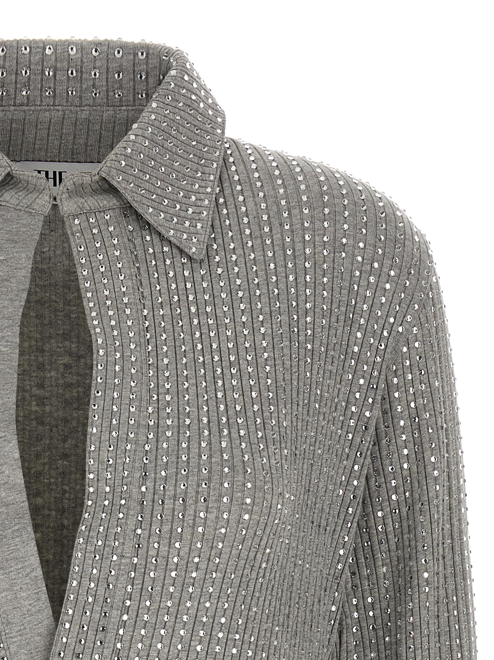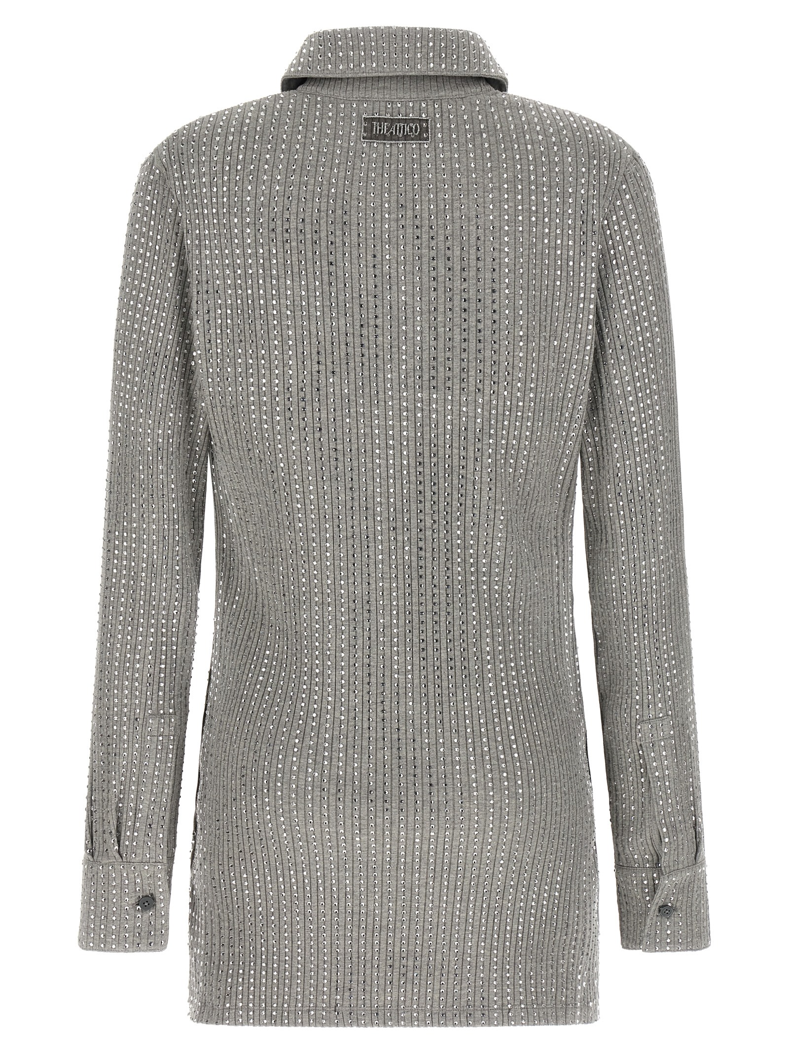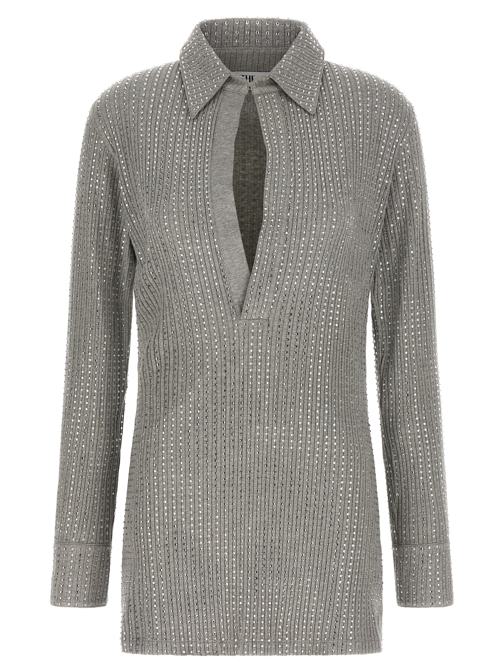 Ribbed stretch cotton mini dress with all-over rhinestone appliqué, polo shirt with collar and V-neck, back logo patch, long cuffed sleeves, and slightly flared skirt.