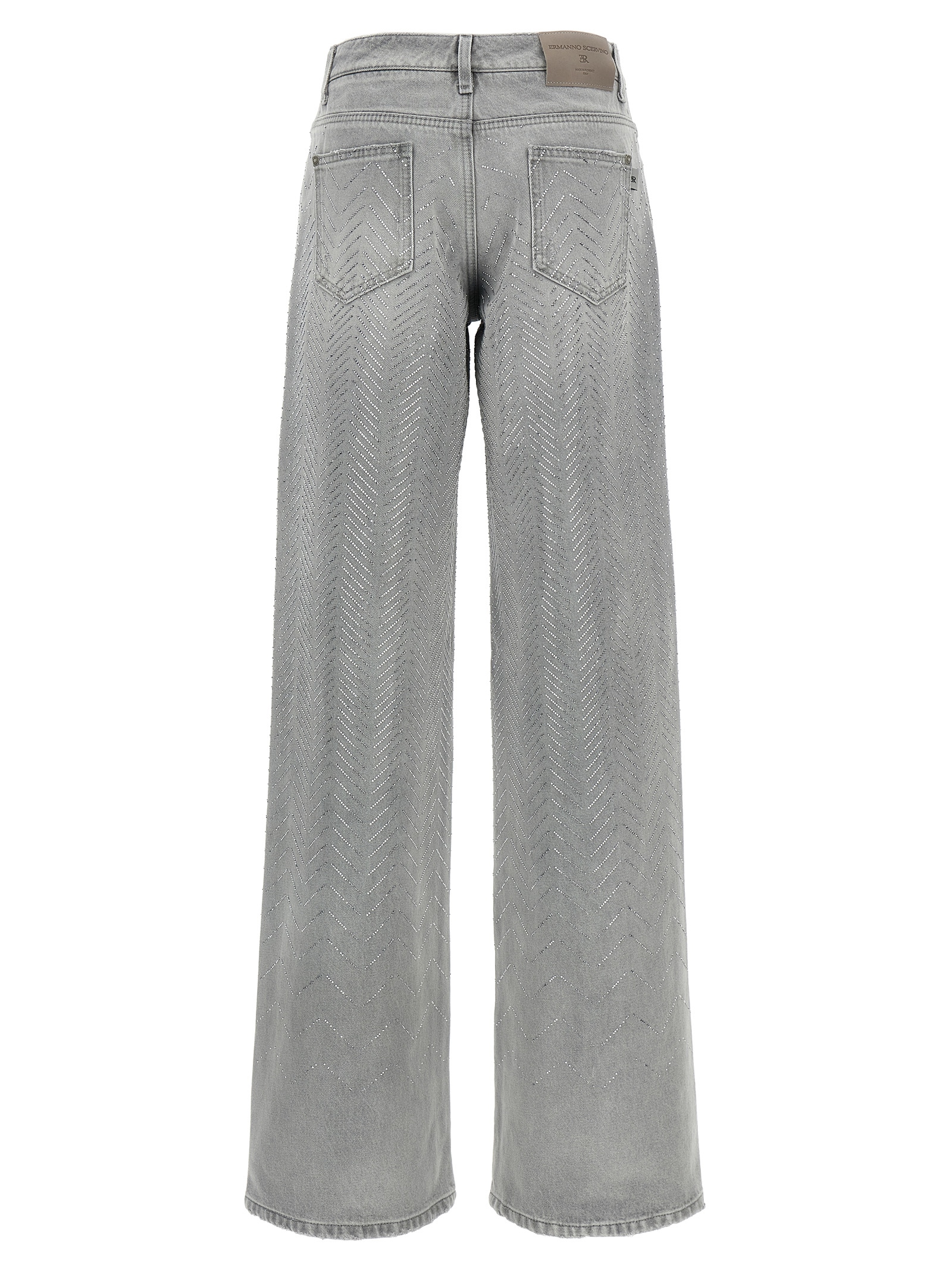 Used-effect garment-dyed cotton denim jeans with all-over rhinestone appliqué, five pockets, front zip and button closure, wide straight leg, back leather logo tag.