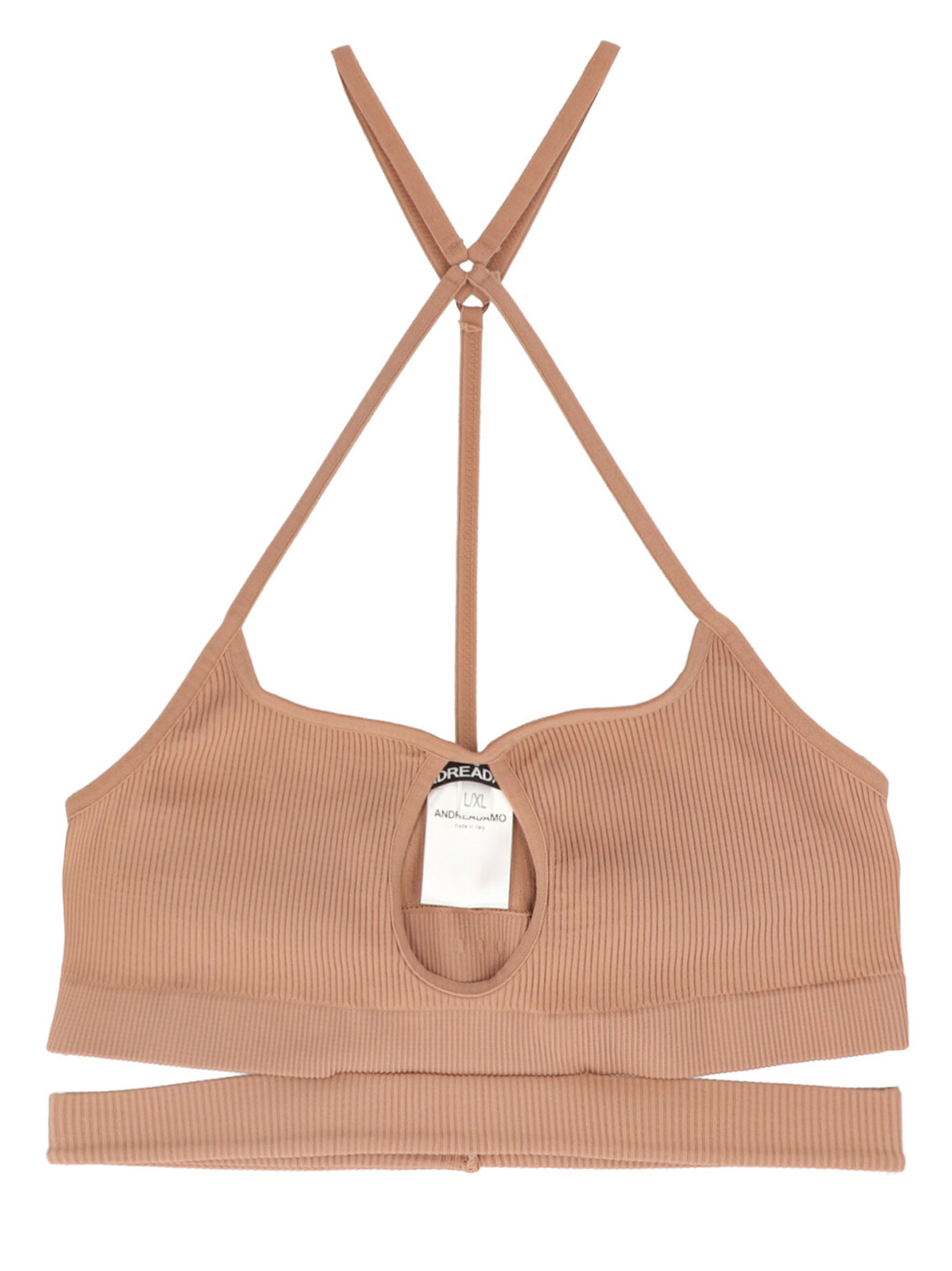 Ribbed stretch fabric bra featuring thin straps and cut out detailing.
