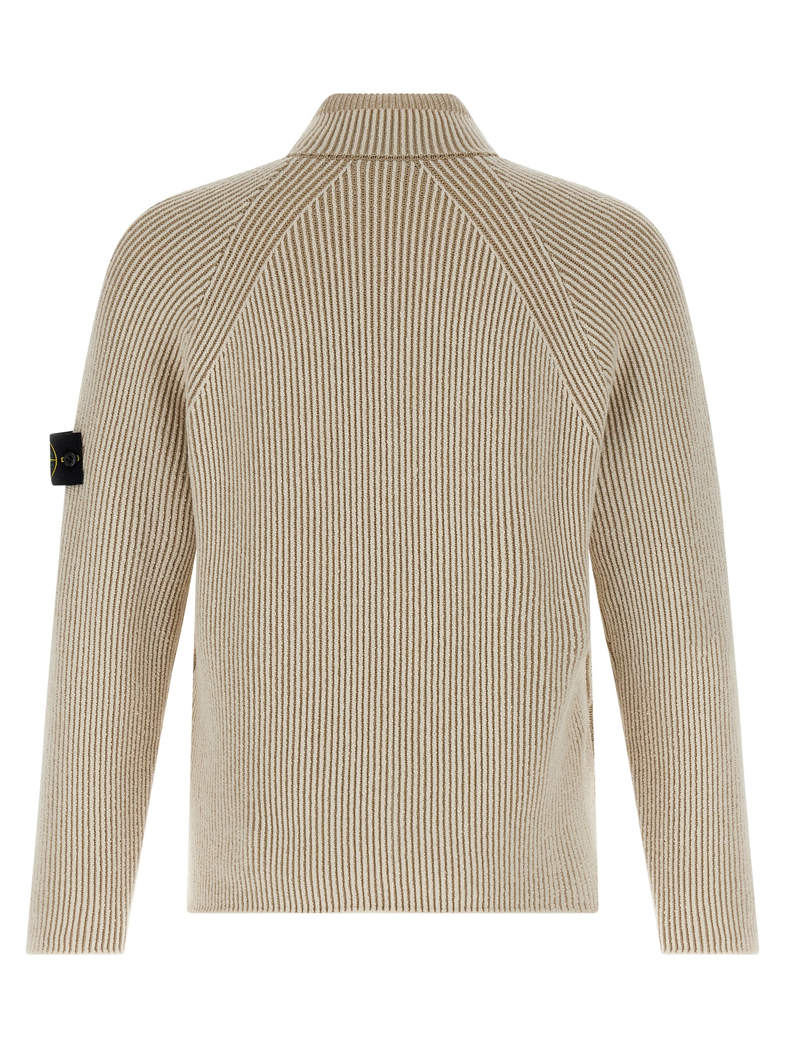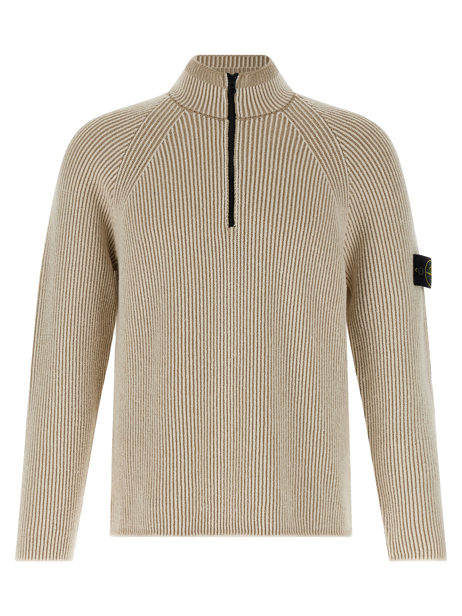 Ribbed virgin wool and stretch cotton blend cardigan, half zip, high neck, long sleeves with logo badge.