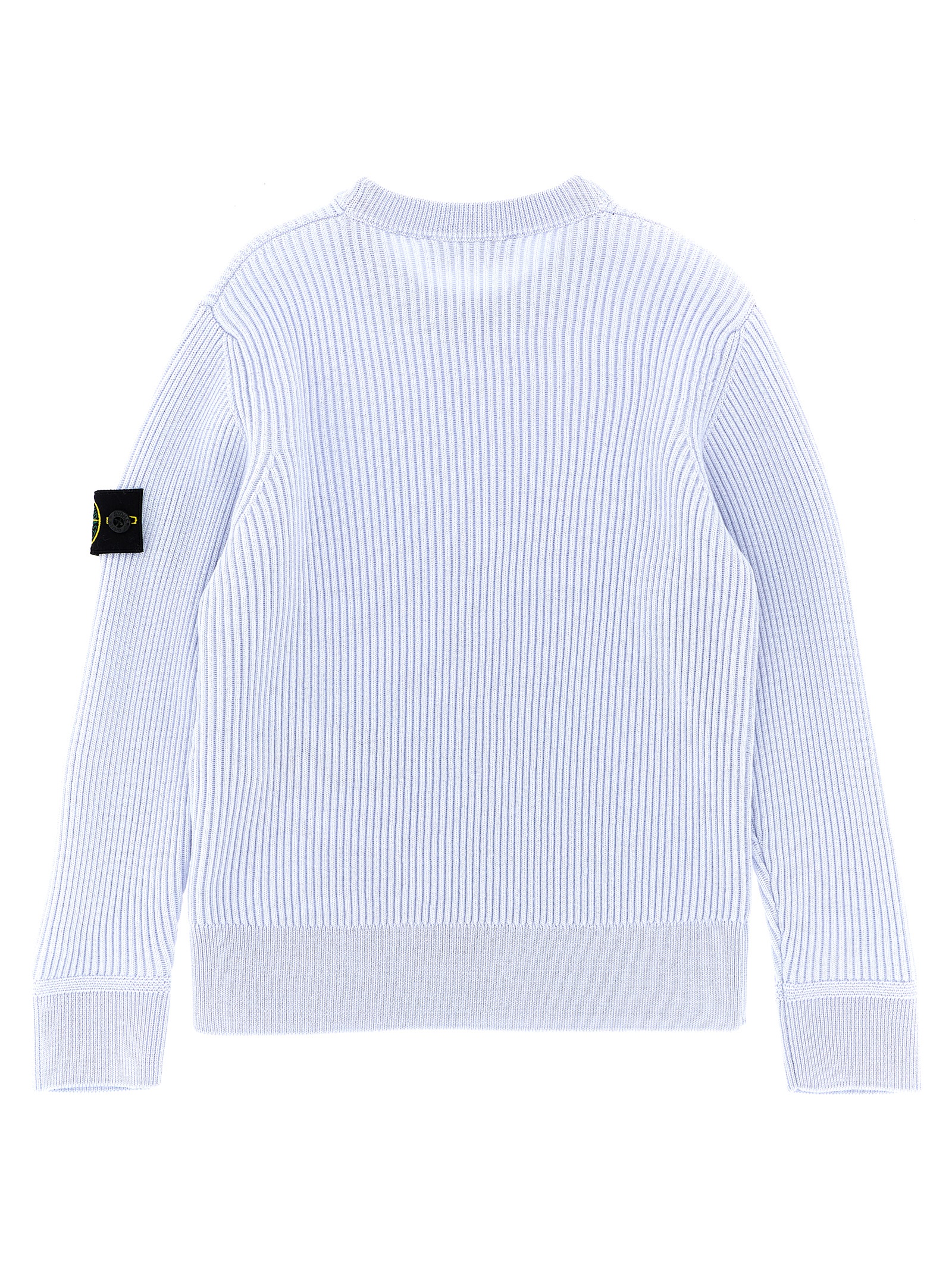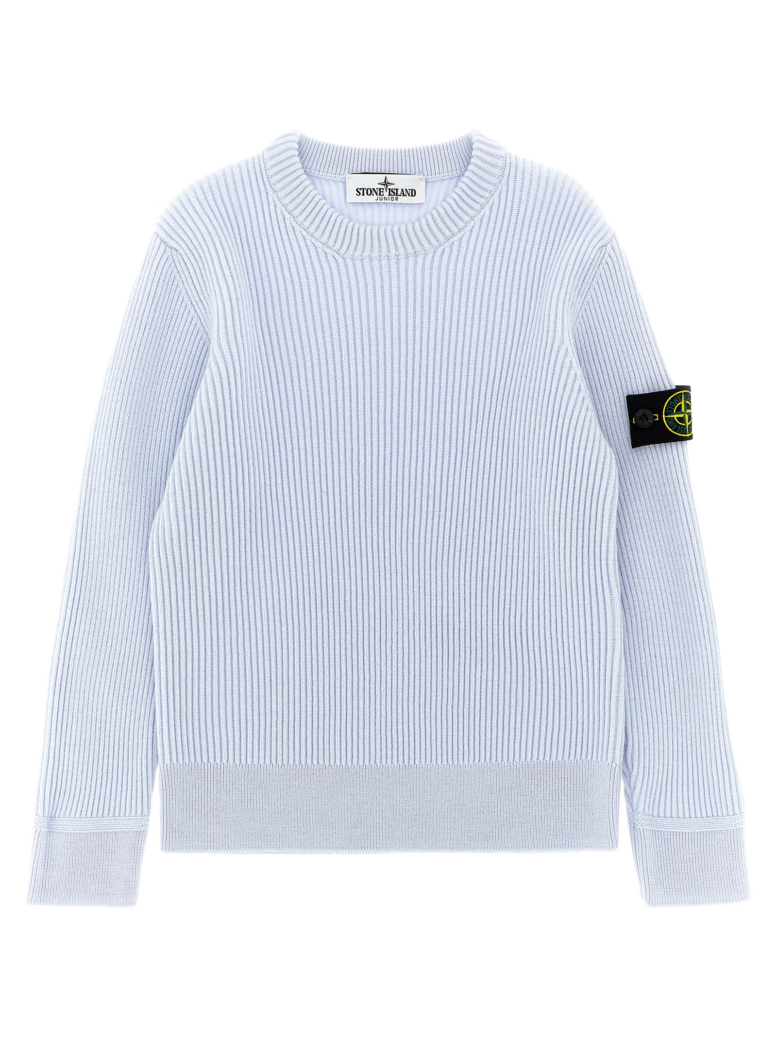 Ribbed virgin wool sweater, crew neck, long sleeves with cuffs and logo badge.