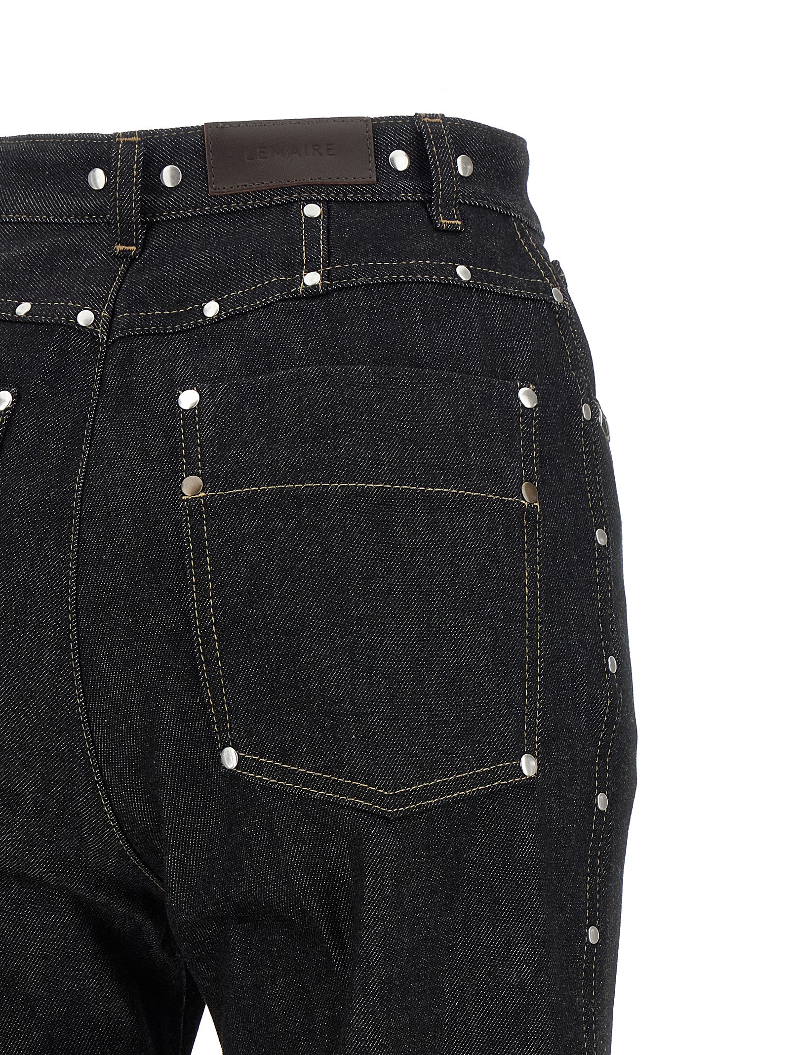 Heavy denim jeans with metal rivets of different sizes, contrast stitching, high waist, straight leg, stretched pleat, front zip and button closure, five pockets, leather logo label with embossed logo at the back.