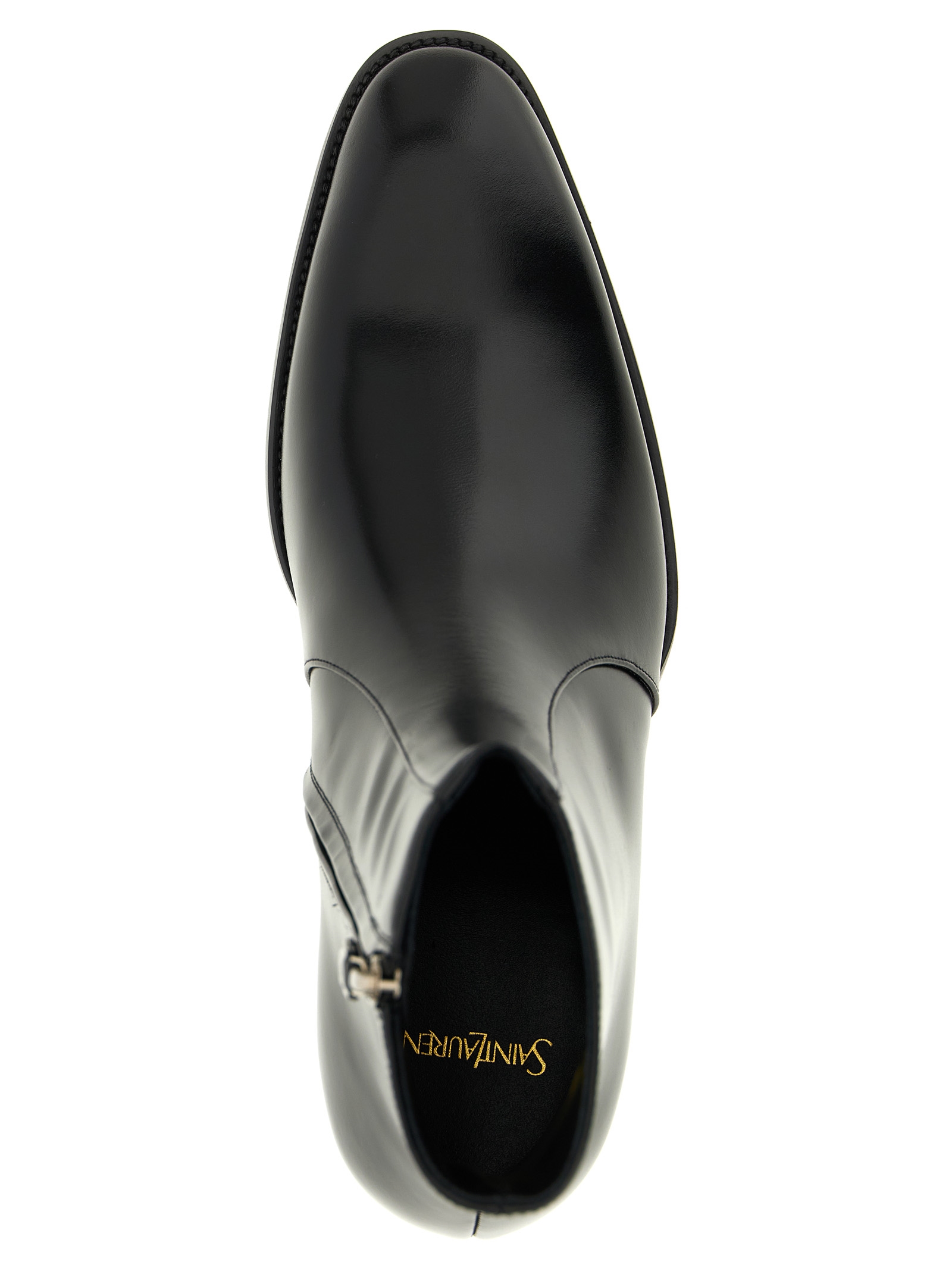 ‘Roman’ smooth leather ankle boots with almond toe, side zip closure, Cuban heel, leather sole.