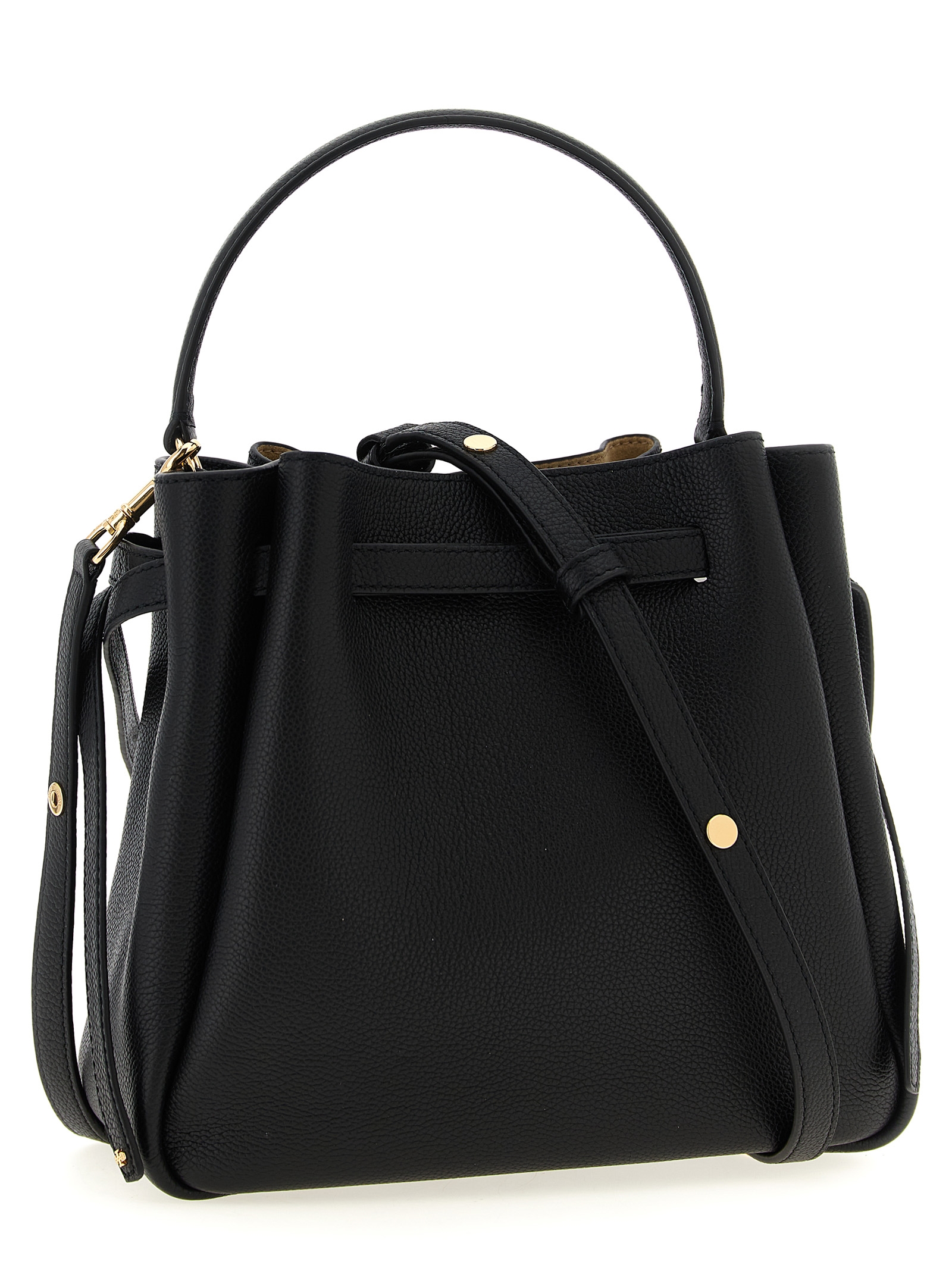 ‘Romy’ bucket bag in fine hammered leather, adjustable belt with metal detail with engraved logo, fixed handle, magnetic closure, suede lining, adjustable and removable shoulder strap.