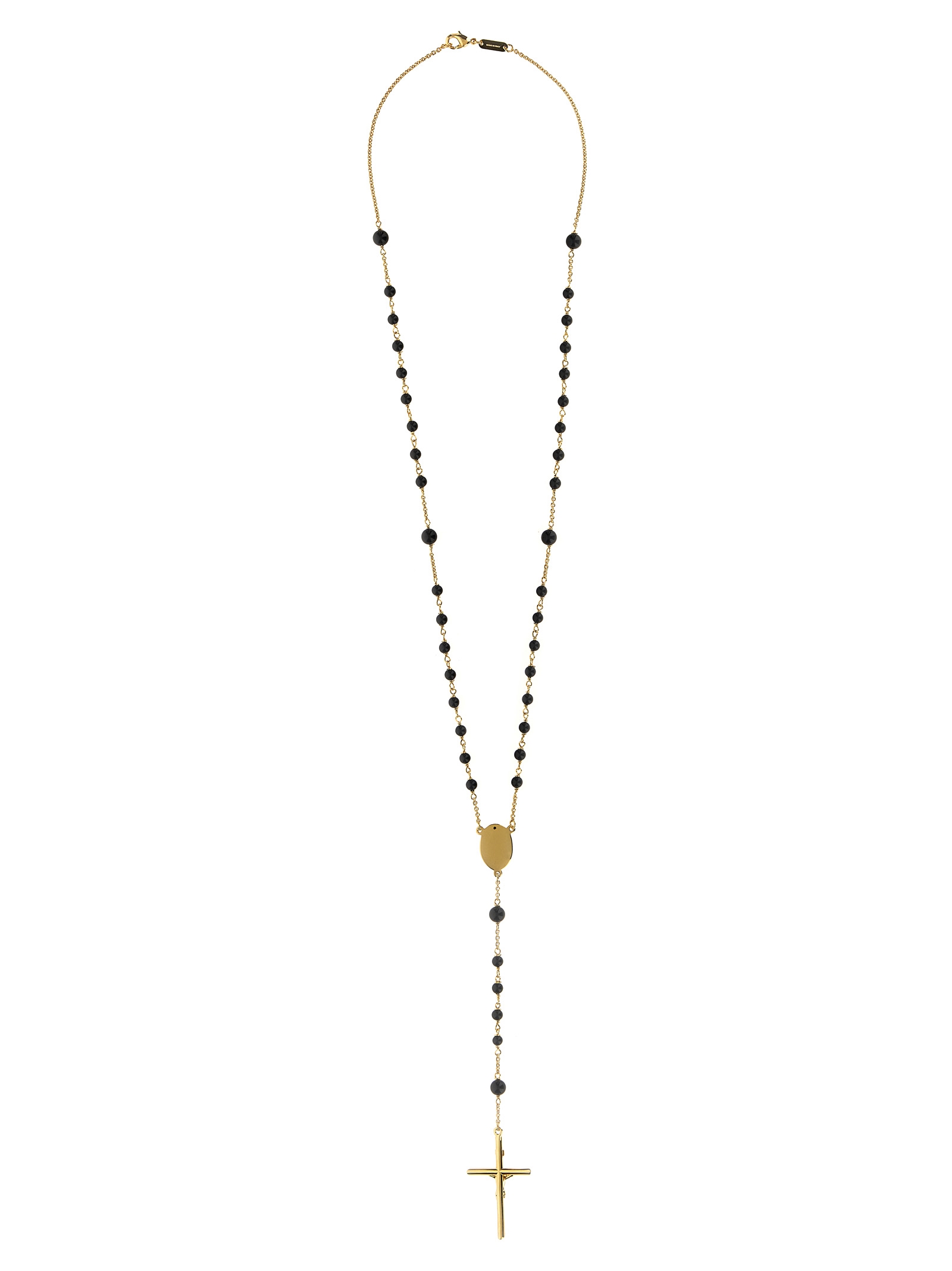 Gold metal necklace with onyx spheres, rosary model, carabiner closure, adjustable.