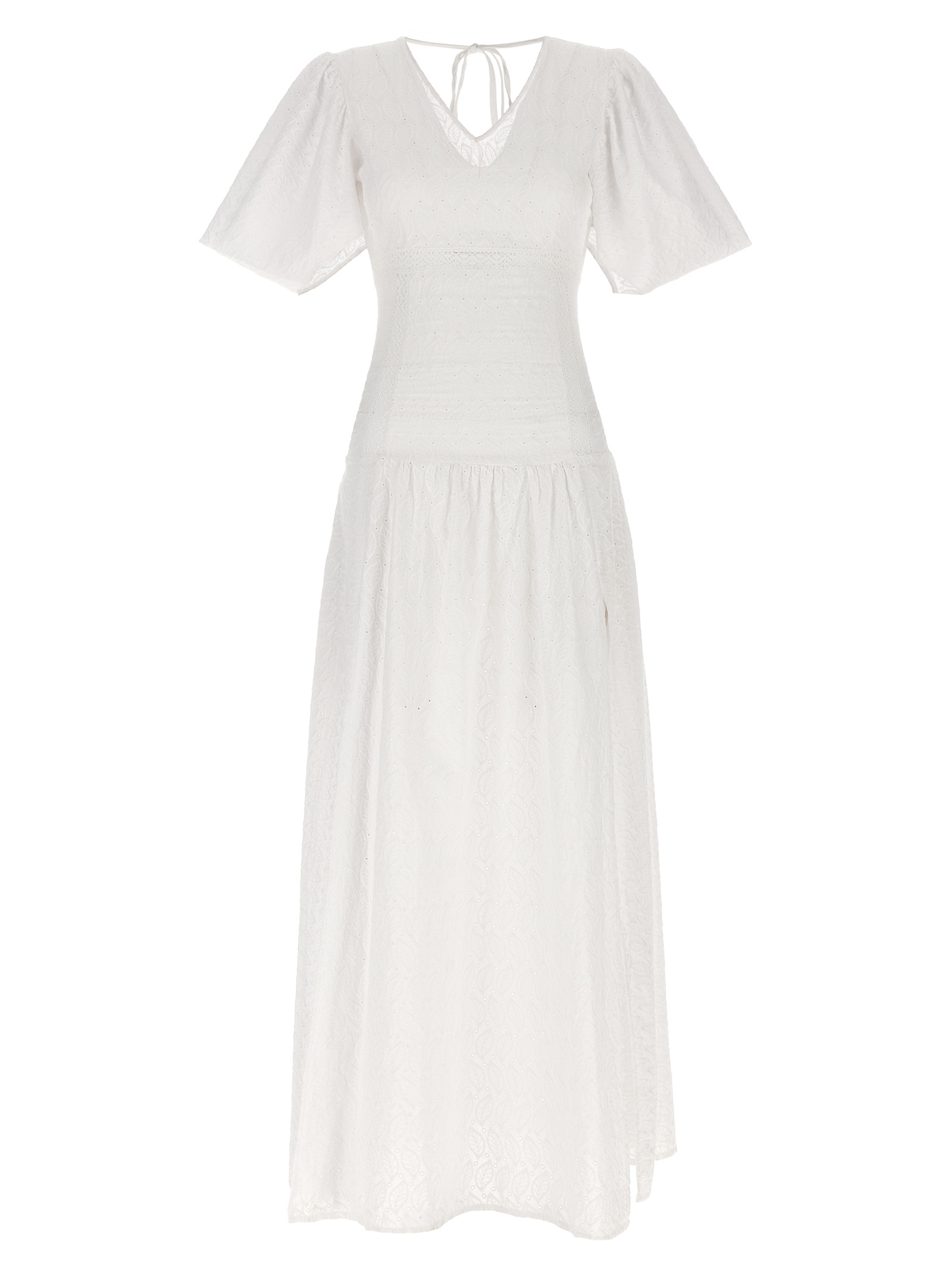 ‘Rosellina’ broderie anglaise cotton dress with V-neck at the front and back, long sleeves with opening, wide side slits, pockets.