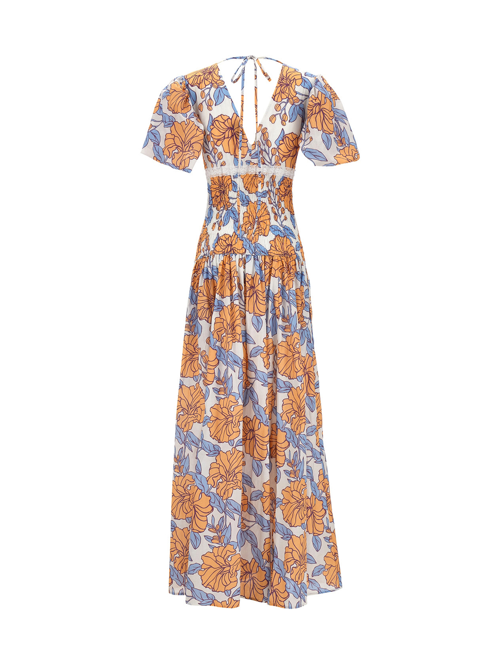 Rosellina’ long cotton muslin all-over floral print dress with lace details, V-neck at the front and back, loose sleeves and smock stitch detail at the waist at the back.