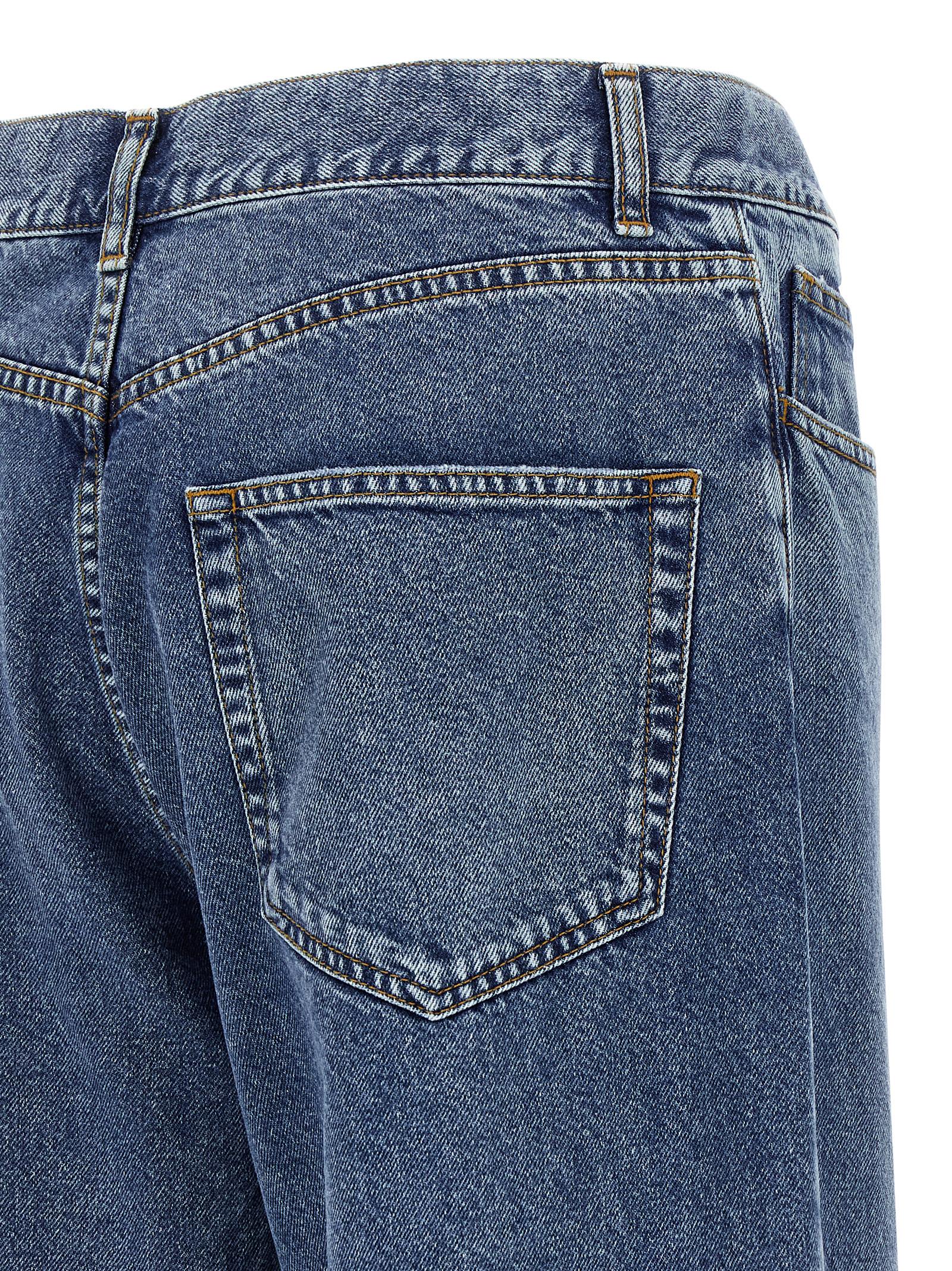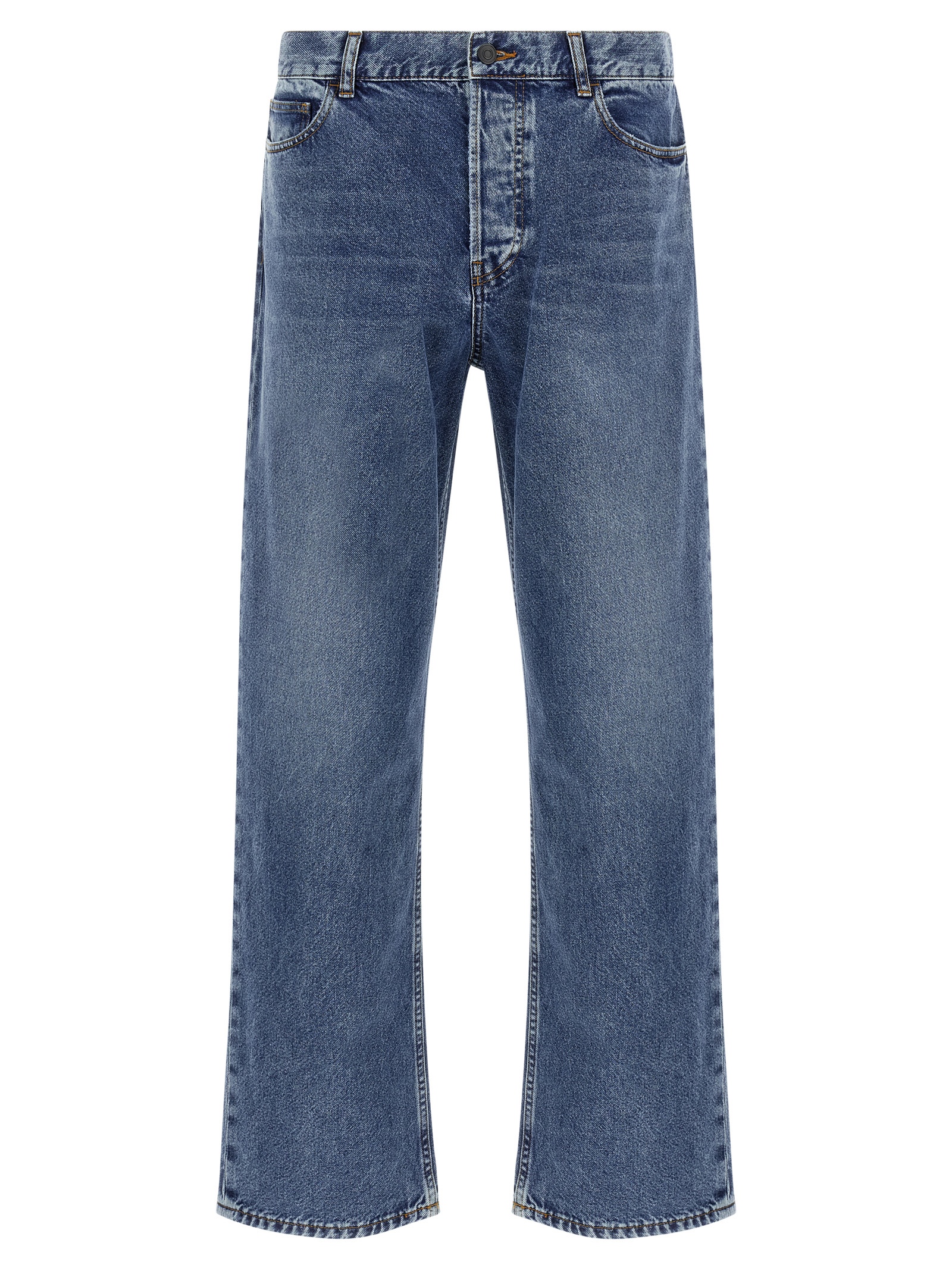 ‘Ross’ jeans in lightly washed cotton denim with contrast stitching, mid waist, wide and straight leg, front button closure, five pockets.