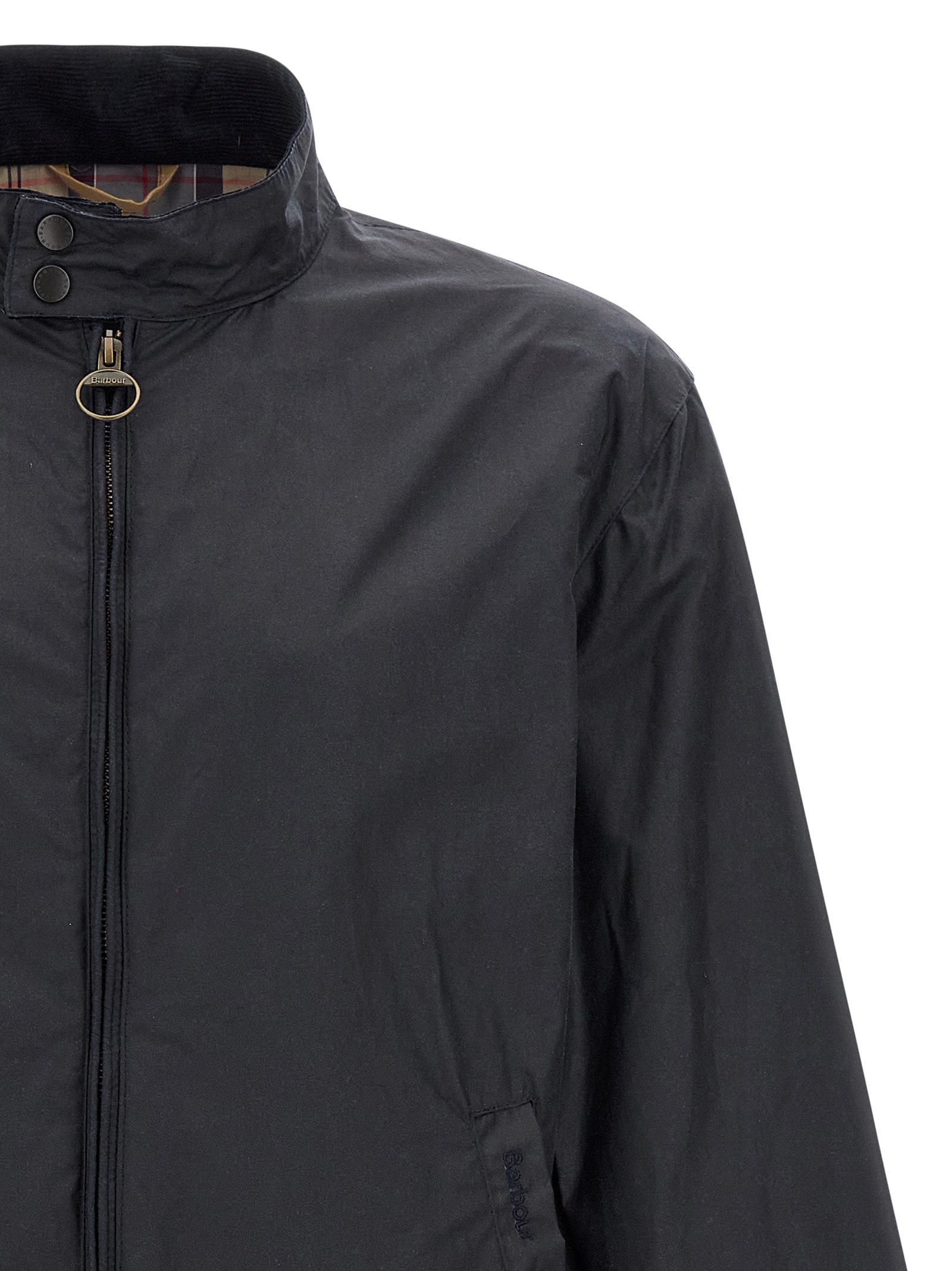 Royston’ waxed cotton jacket with ribbed knit details, tone-on-tone front logo embroidery, zip closure, pockets, high neck with snap button closure, long cuffed sleeves.