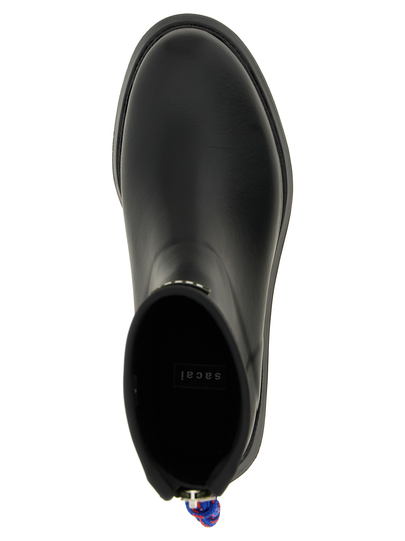 ‘Rubber Boots’ rubber ankle boots, front logo patch, back zip closure.