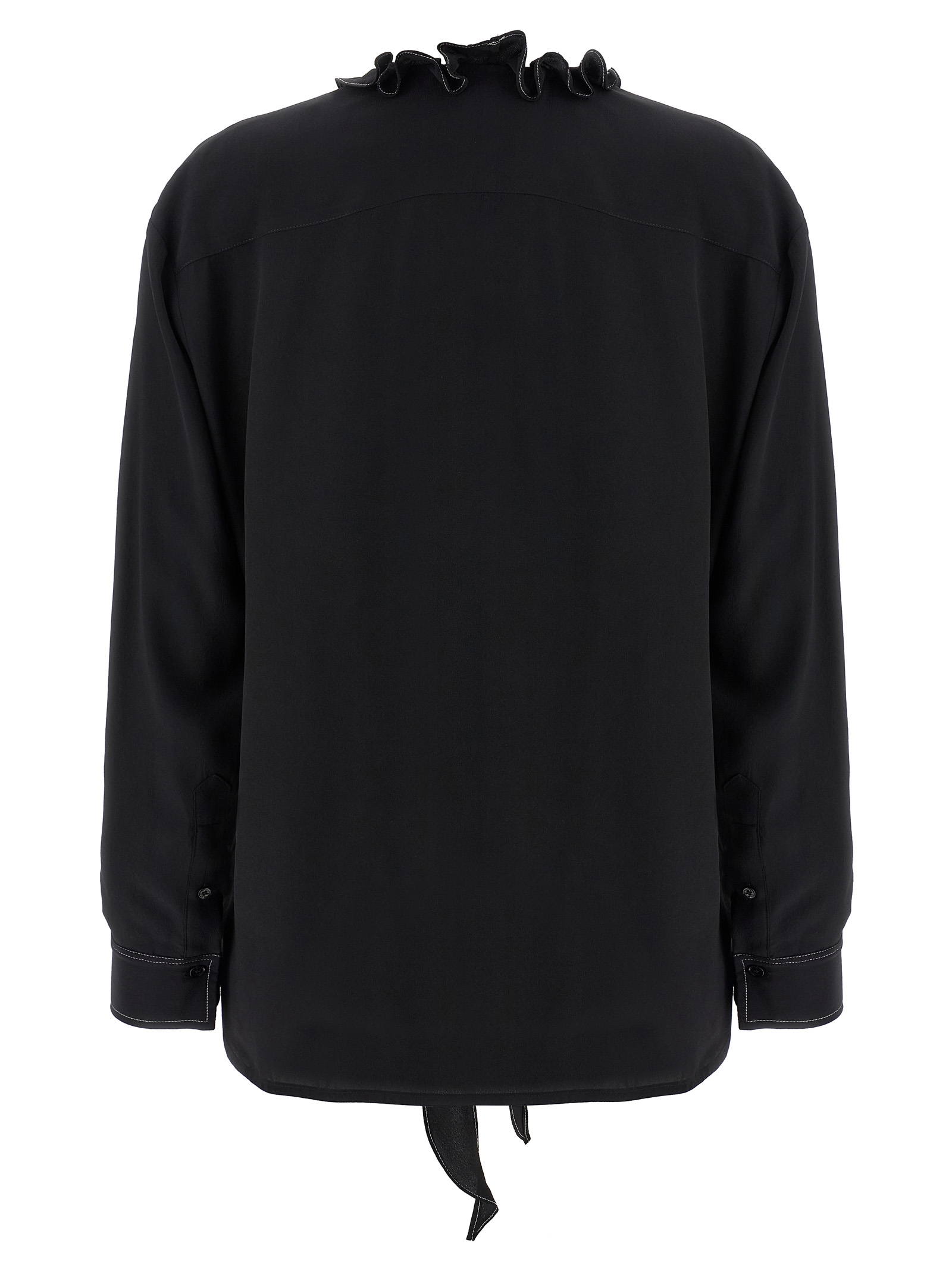 ‘Ruffle’ tactile silk blouse, lavallière collar with ruffles and ruffles, contrast stitching, front button closure, long cuffed sleeves.